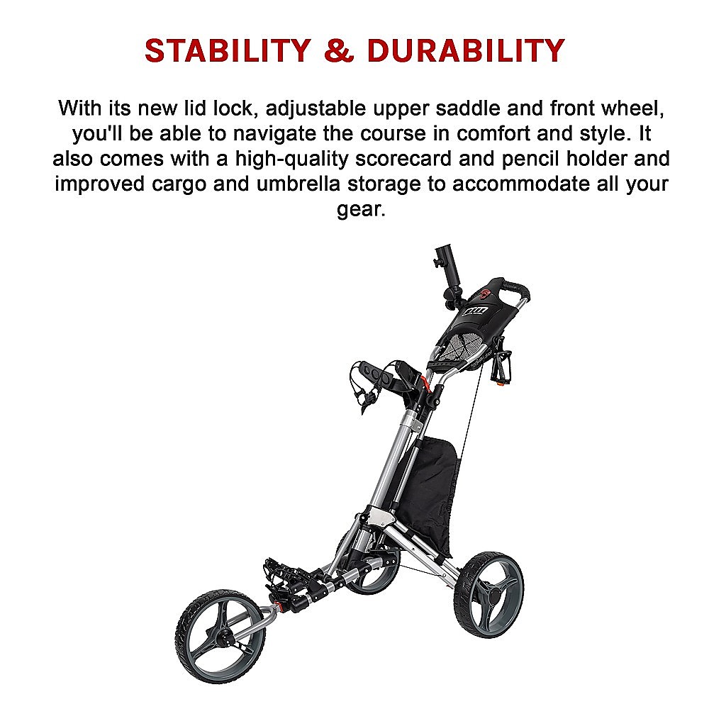 • Improved design: Our cart's large console features space for your scorecard, pencil, ball and tee holders, as well as an ample storage net