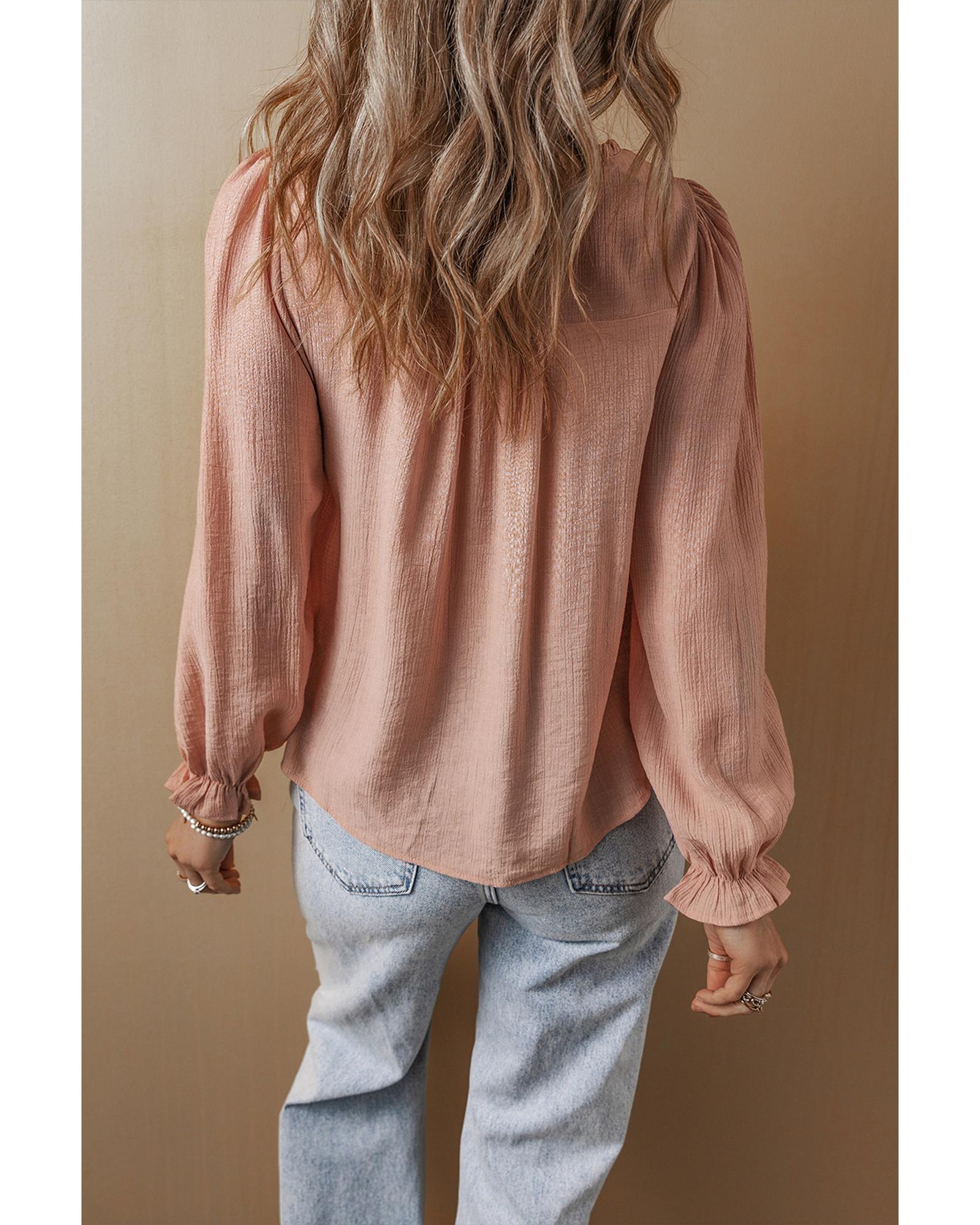 Gossamer Pink Floral Embroidered Textured Flounce Sleeve Elegant Blouse – L