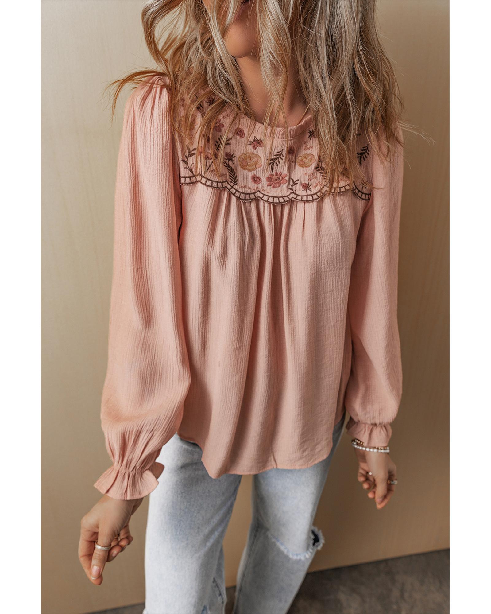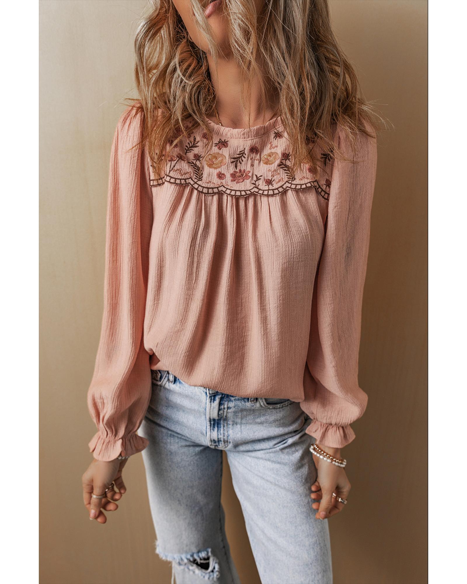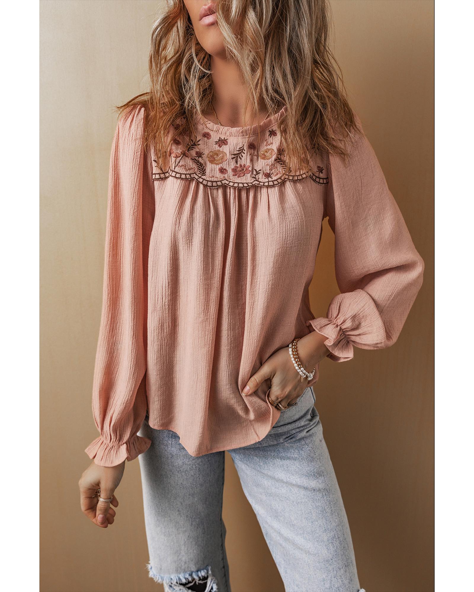 Gossamer Pink Floral Embroidered Textured Flounce Sleeve Elegant Blouse – S