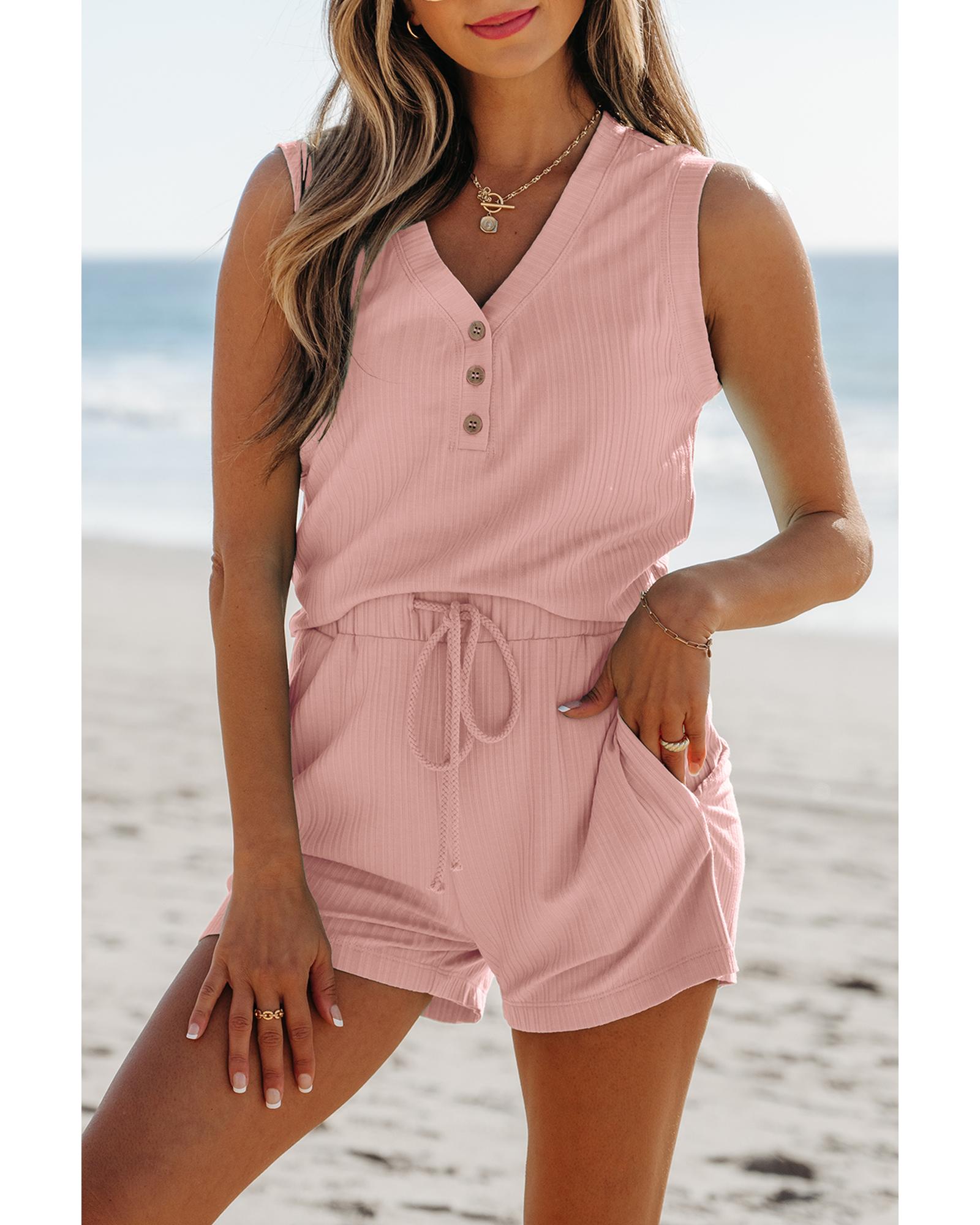 Gossamer Pink Ribbed Button V Neck Tank Top and Shorts Set – M