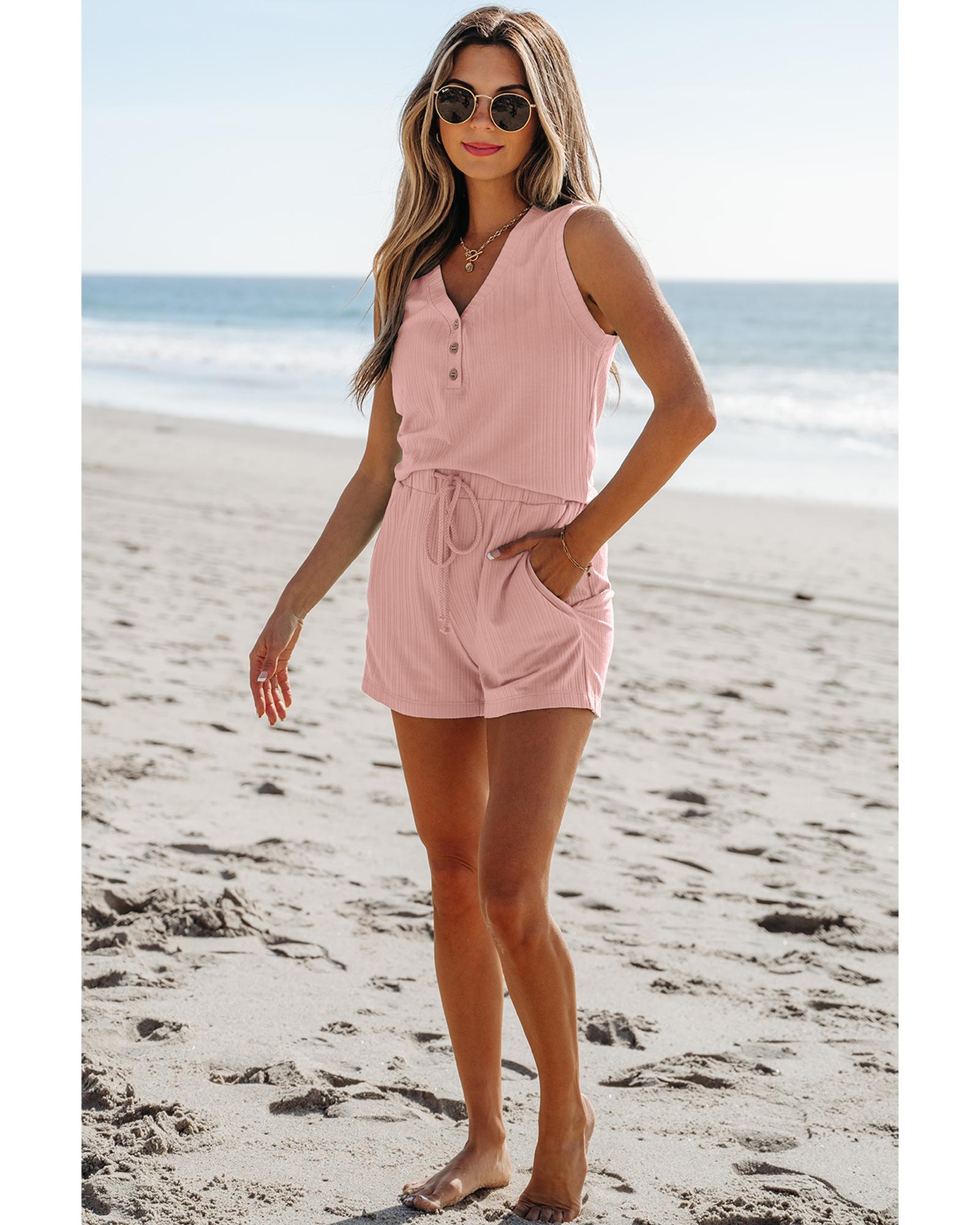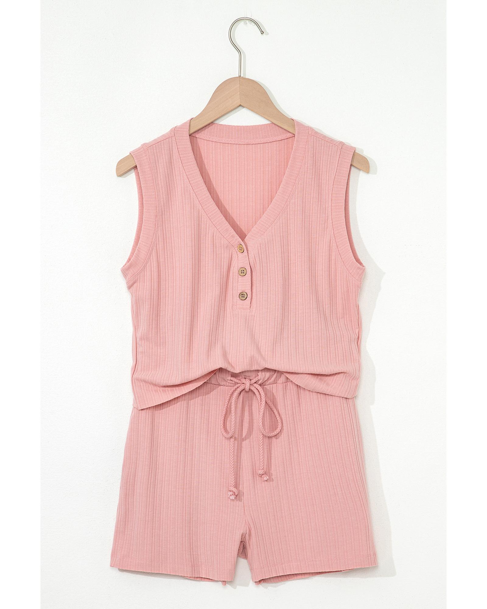 Gossamer Pink Ribbed Button V Neck Tank Top and Shorts Set – S