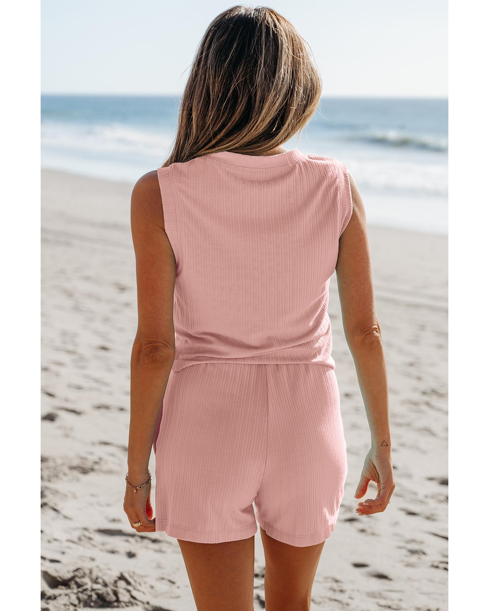 Gossamer Pink Ribbed Button V Neck Tank Top and Shorts Set – XL