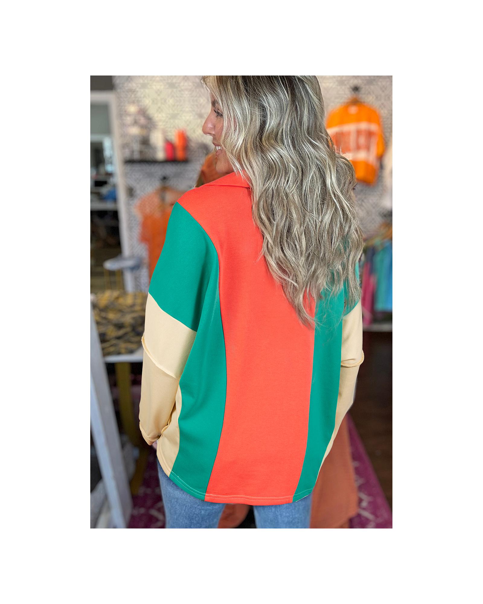Grapefruit Orange Color Block Patchwork Collared V Neck Loose Top – XL