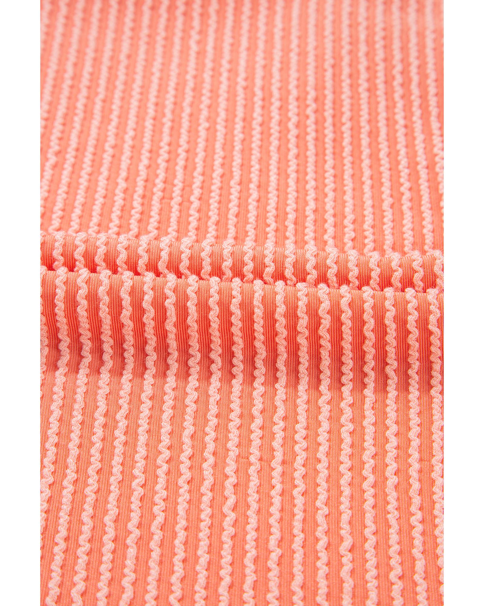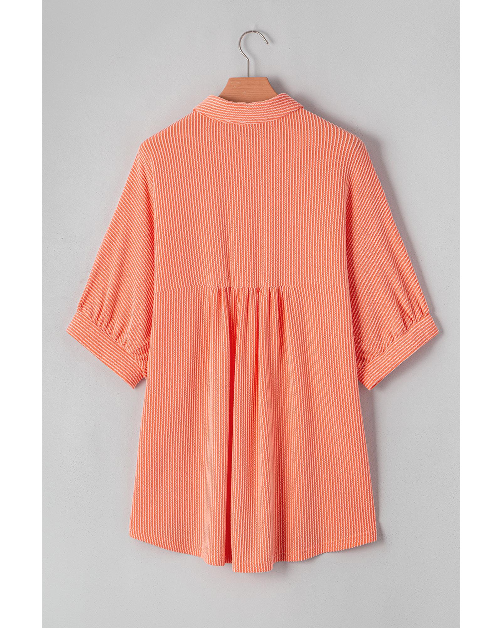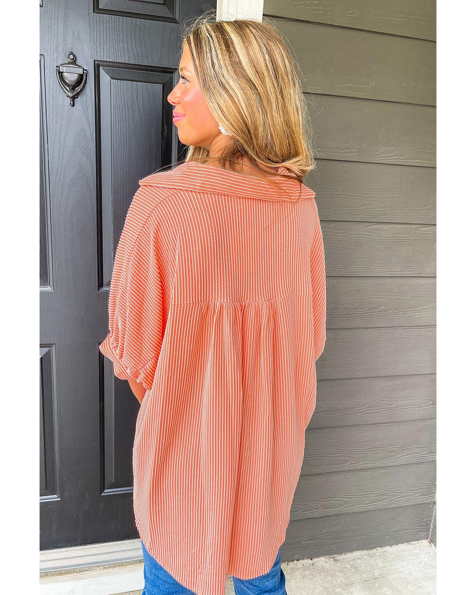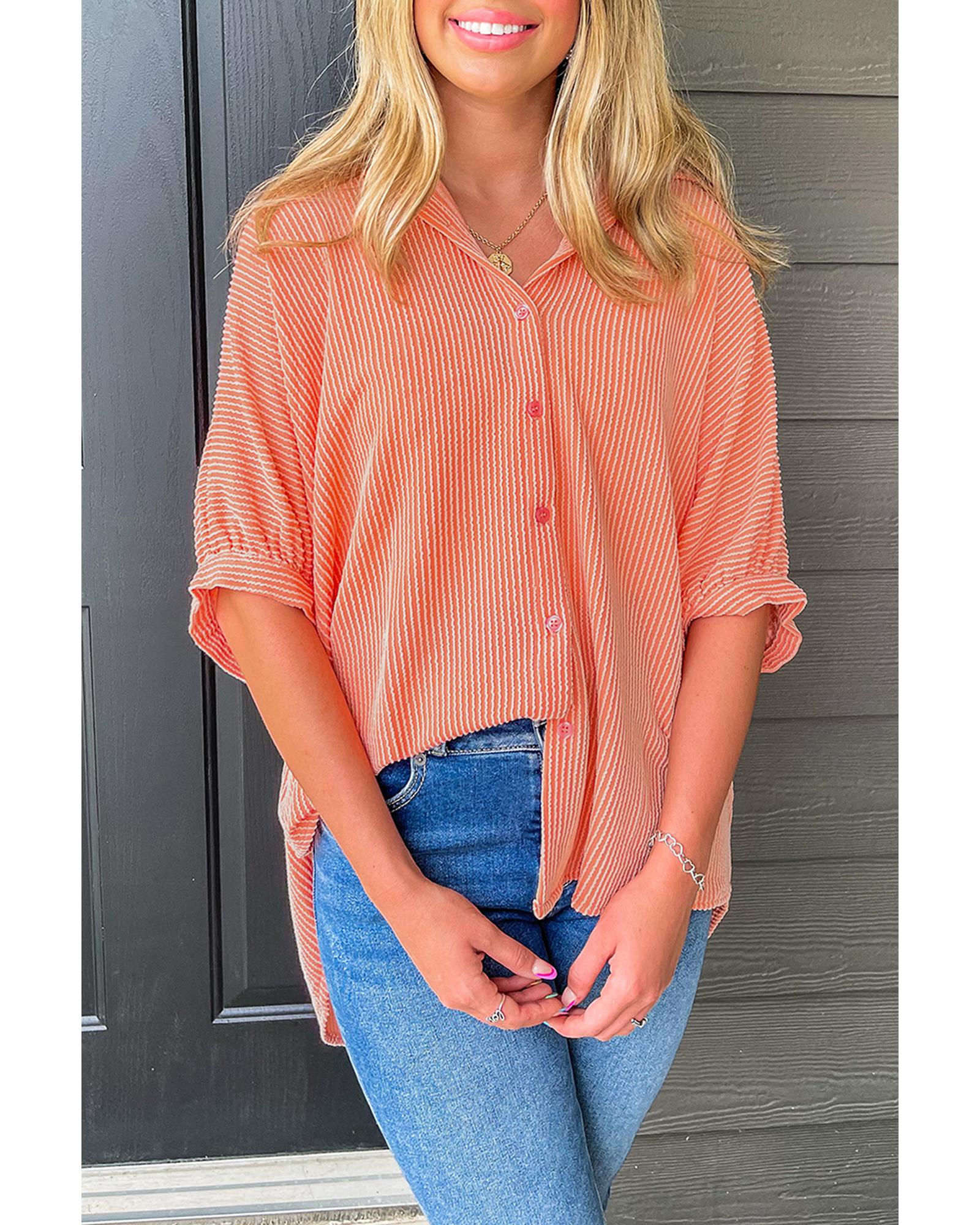 Grapefruit Orange Corded Half Sleeve Button Up High Low Hem Loose Shirt – S