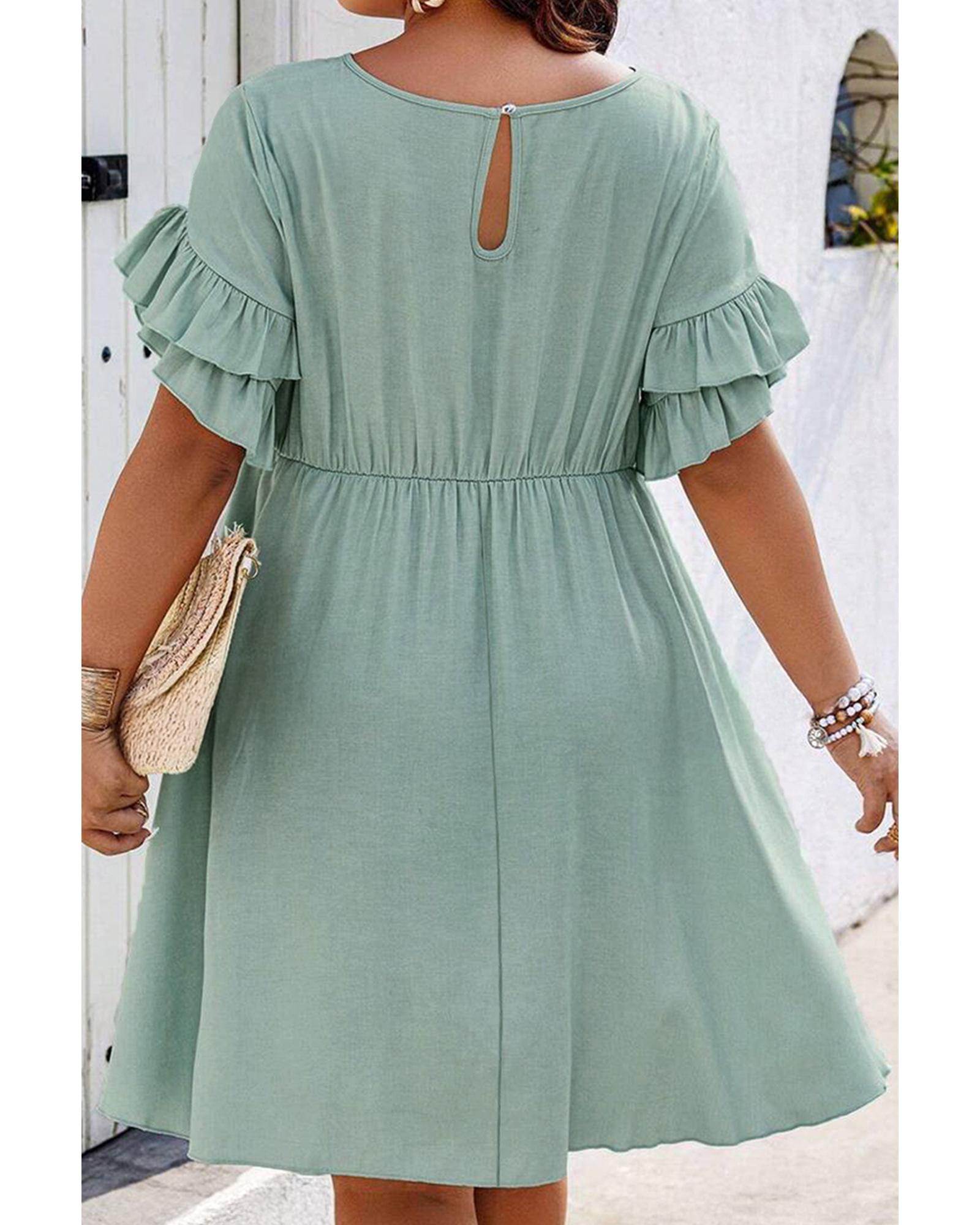 • Grass green ruffle trim short sleeve plus size flared mini dress