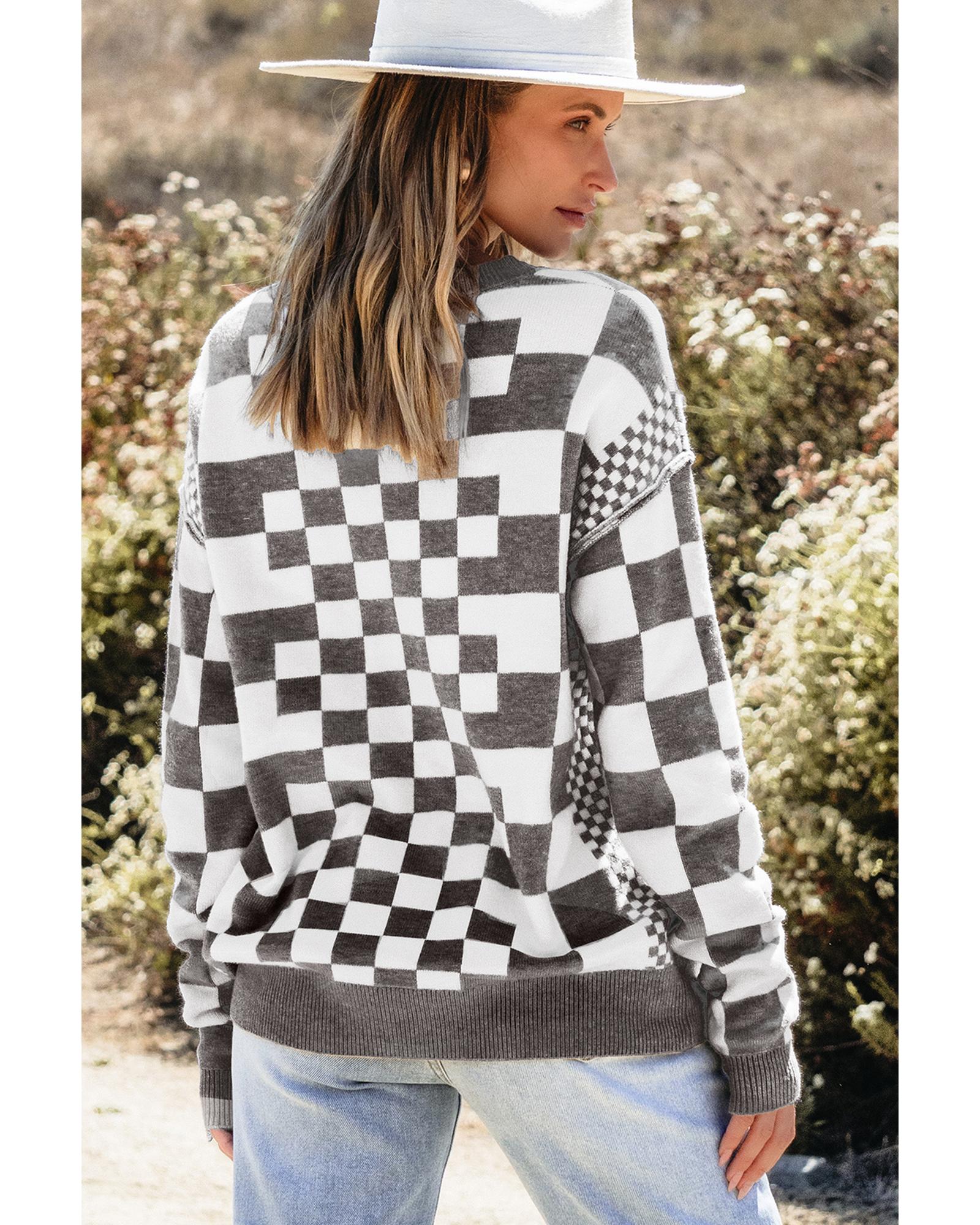 Gray Checkered Print Drop Shoulder Round Neck Sweater – M