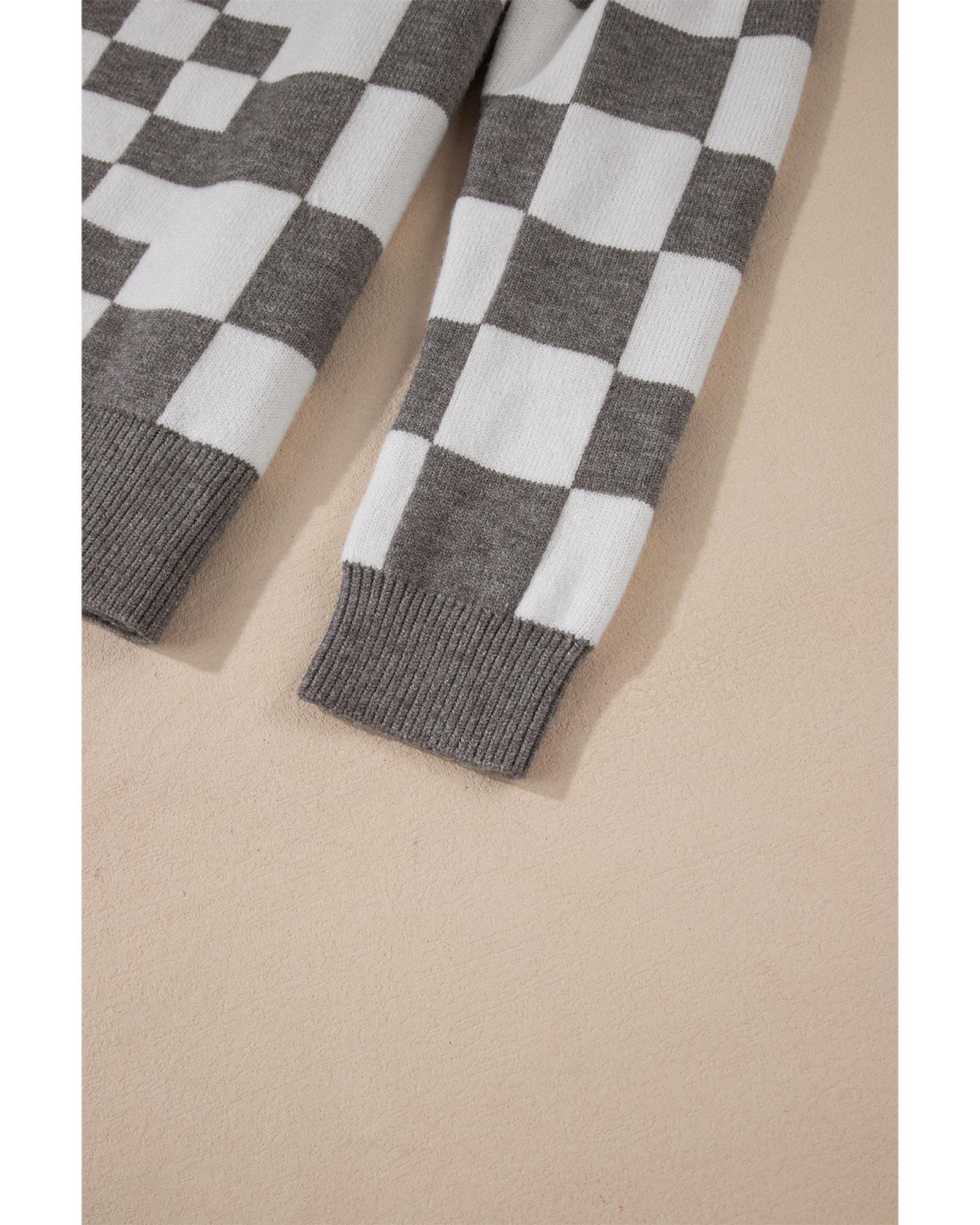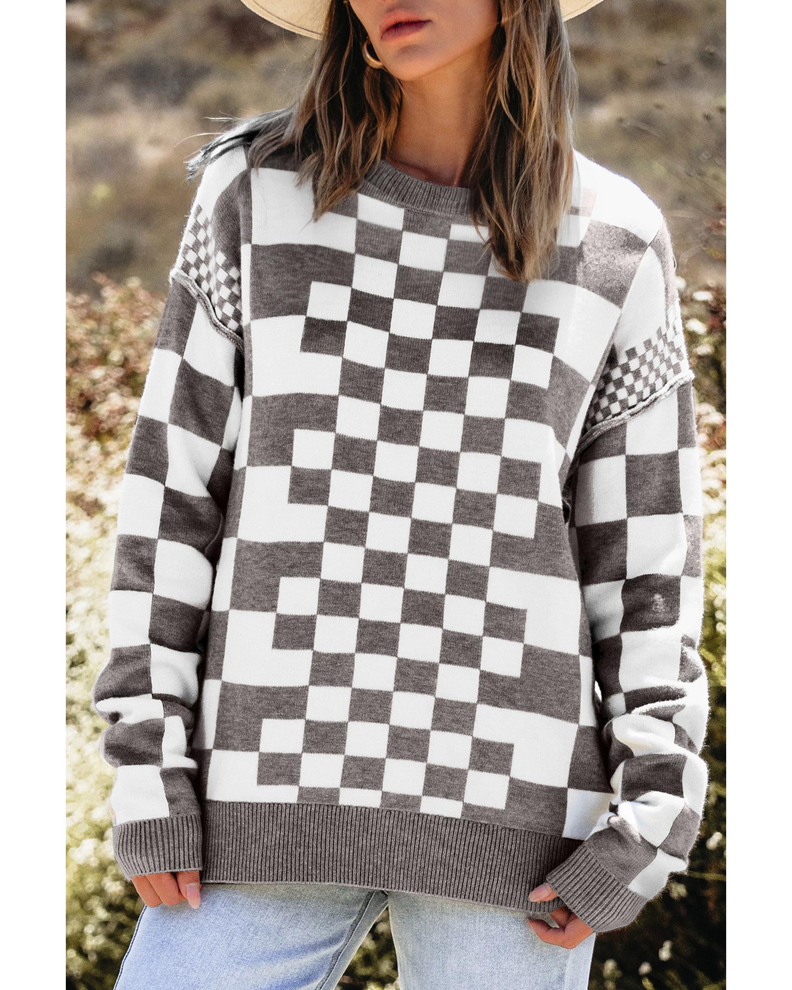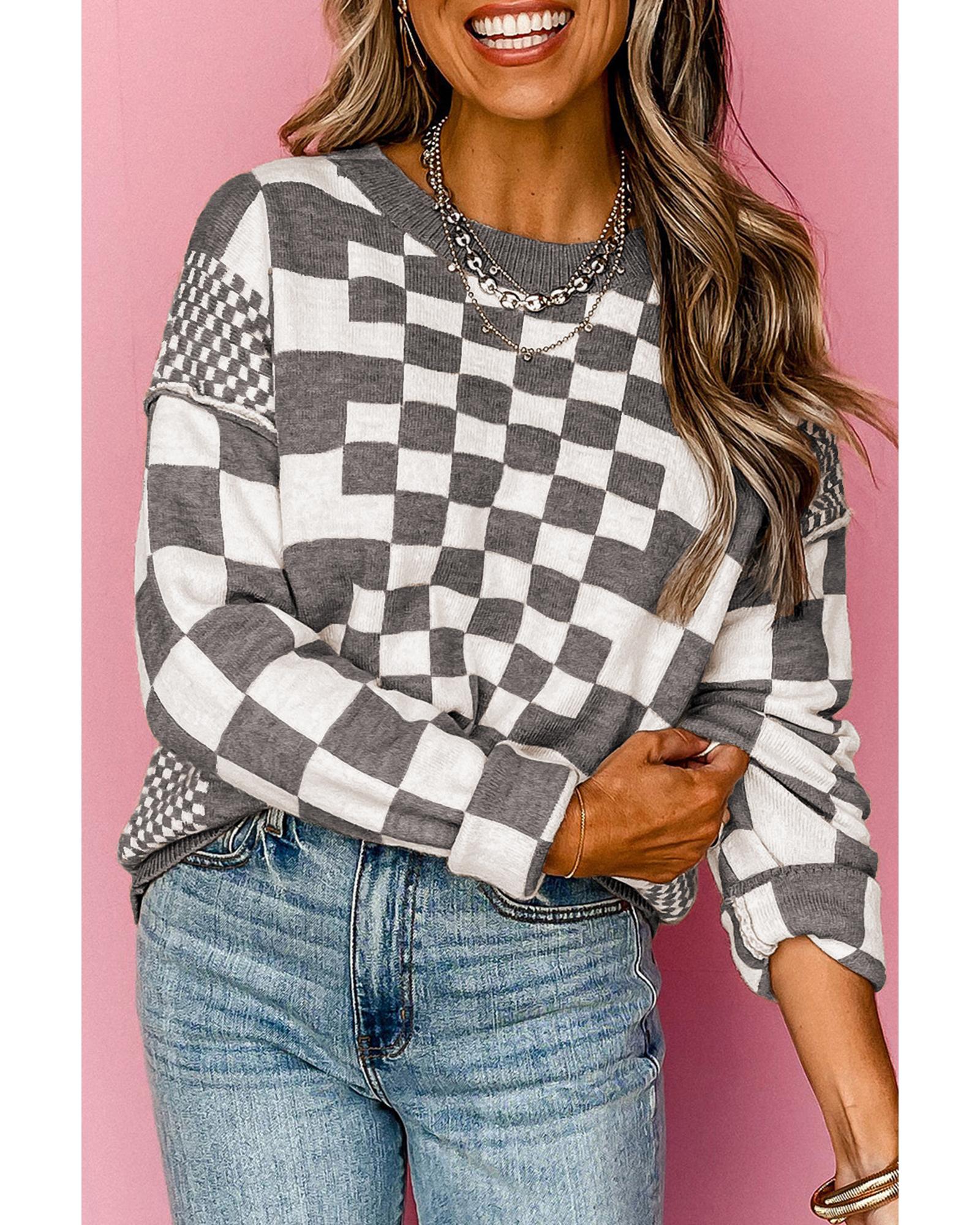 Gray Checkered Print Drop Shoulder Round Neck Sweater – XL