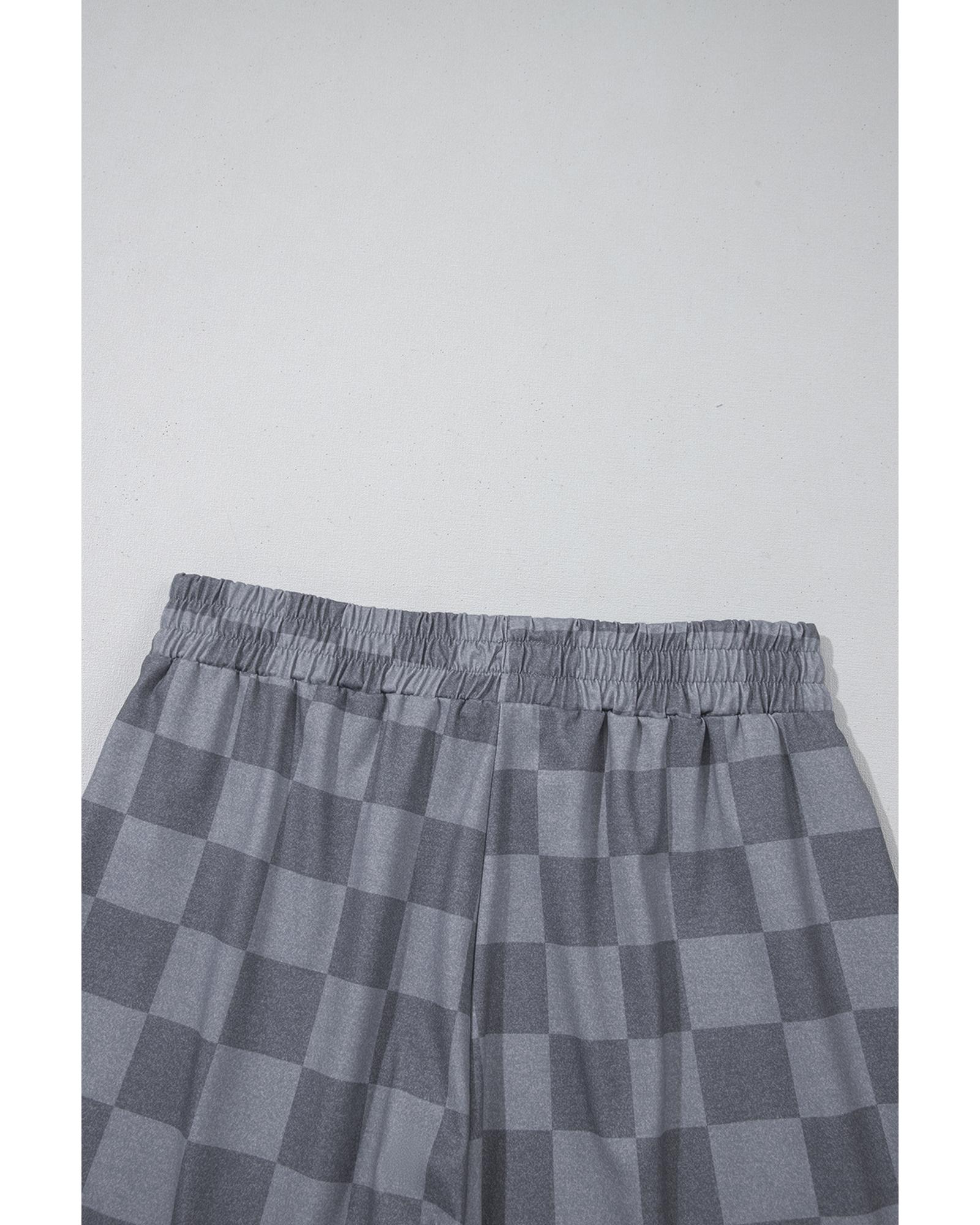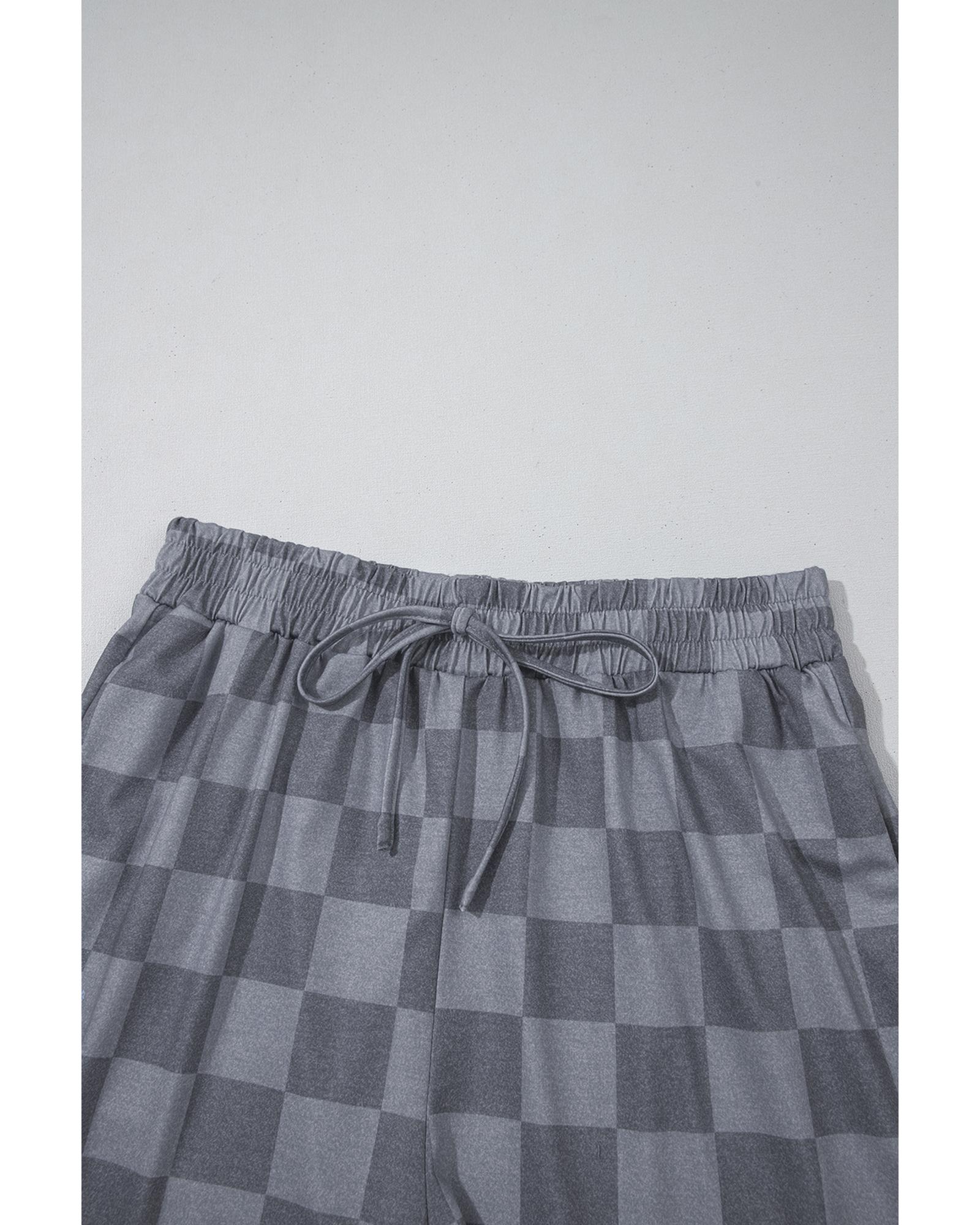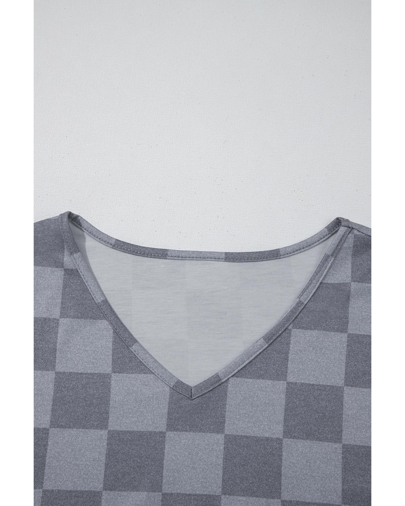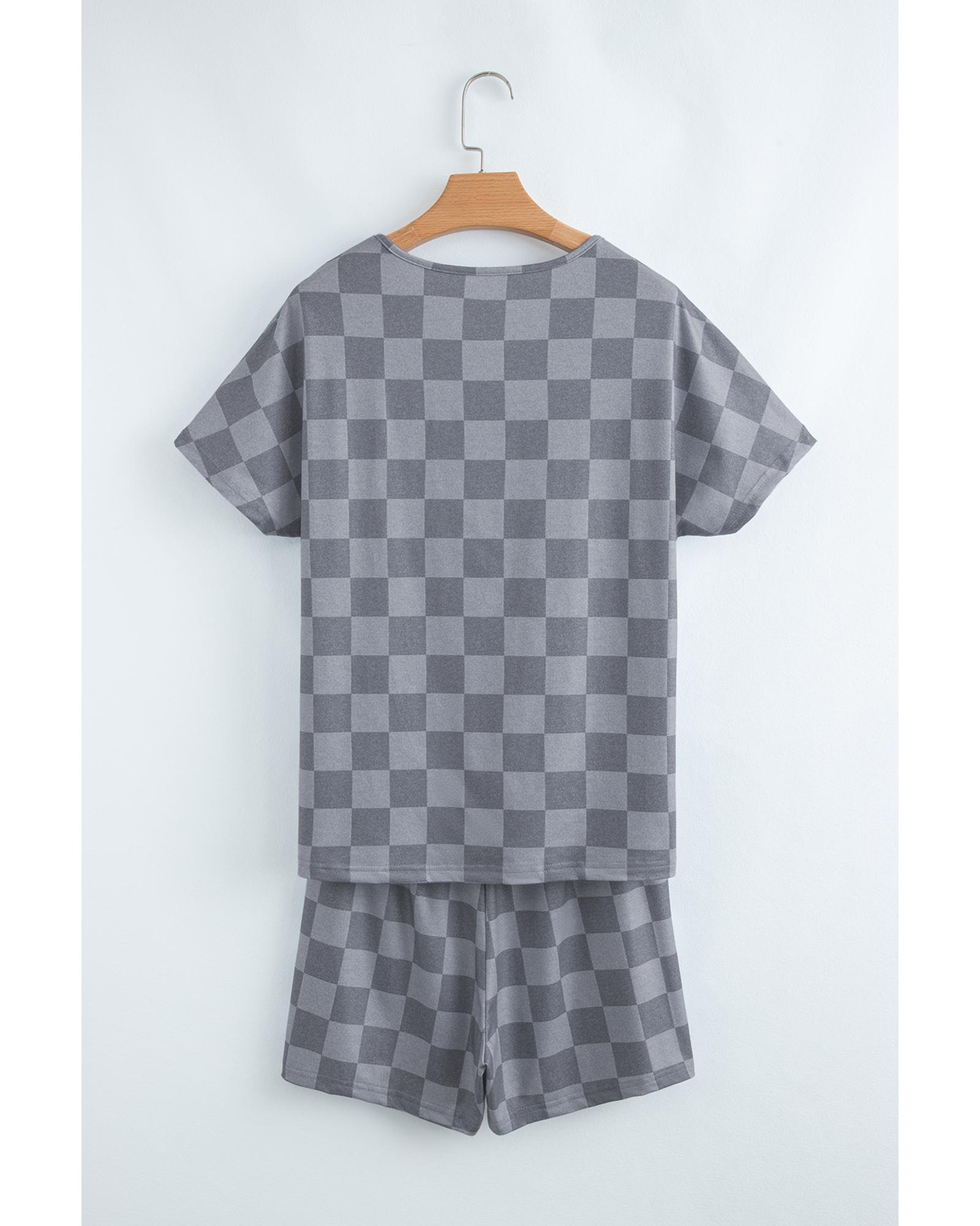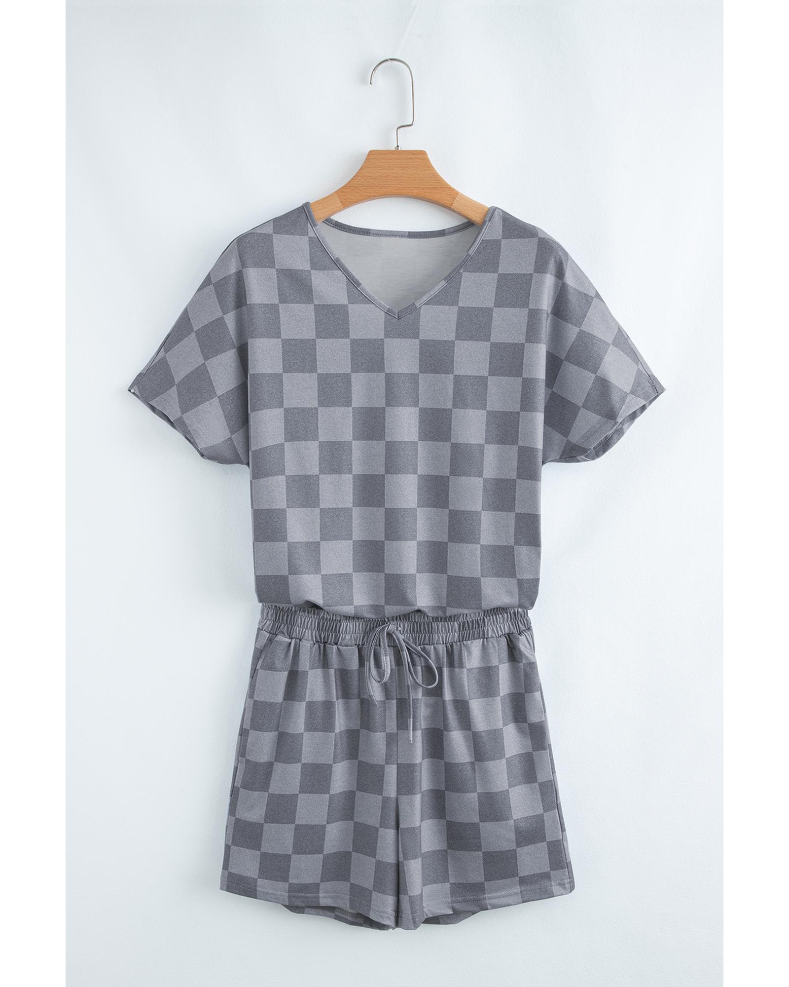 Gray Checkered V Neck Tee Drawstring Shorts Lounge Set – L