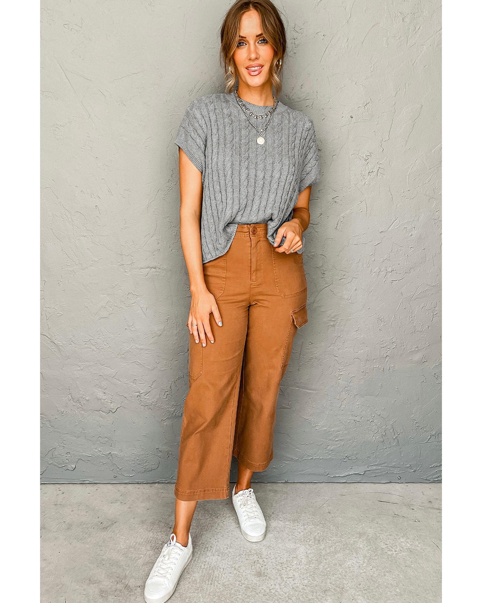 - Gray Crew Neck Cable Knit Short Sleeve Sweater