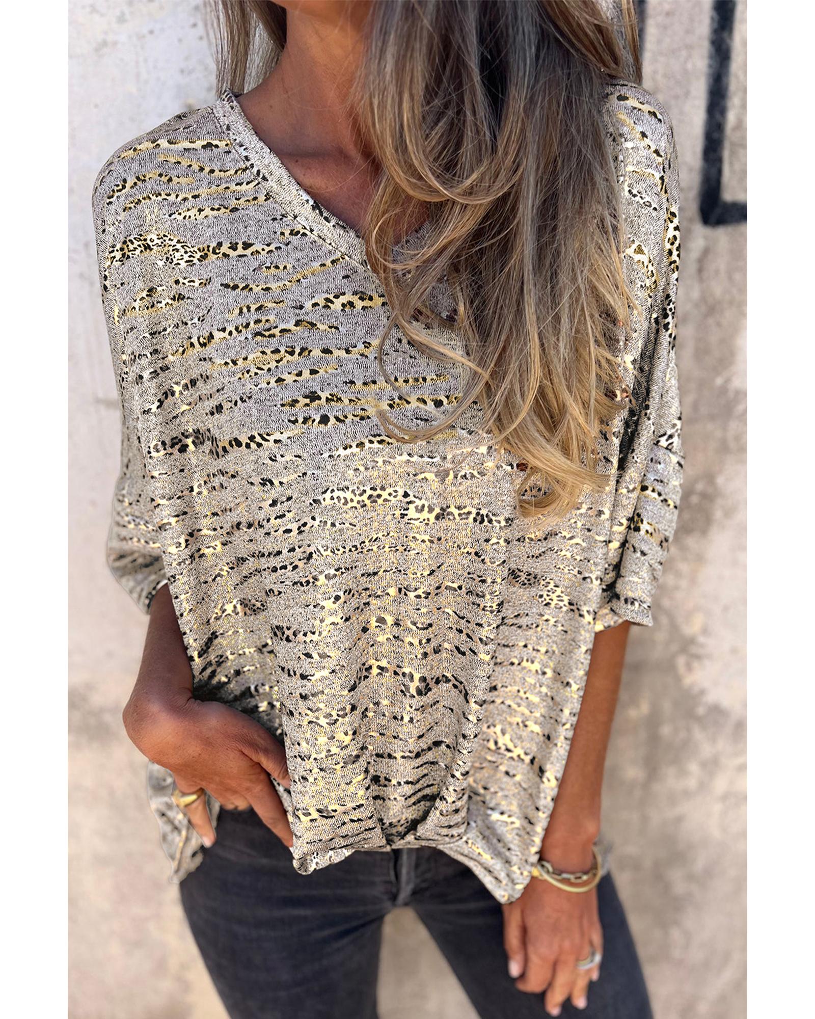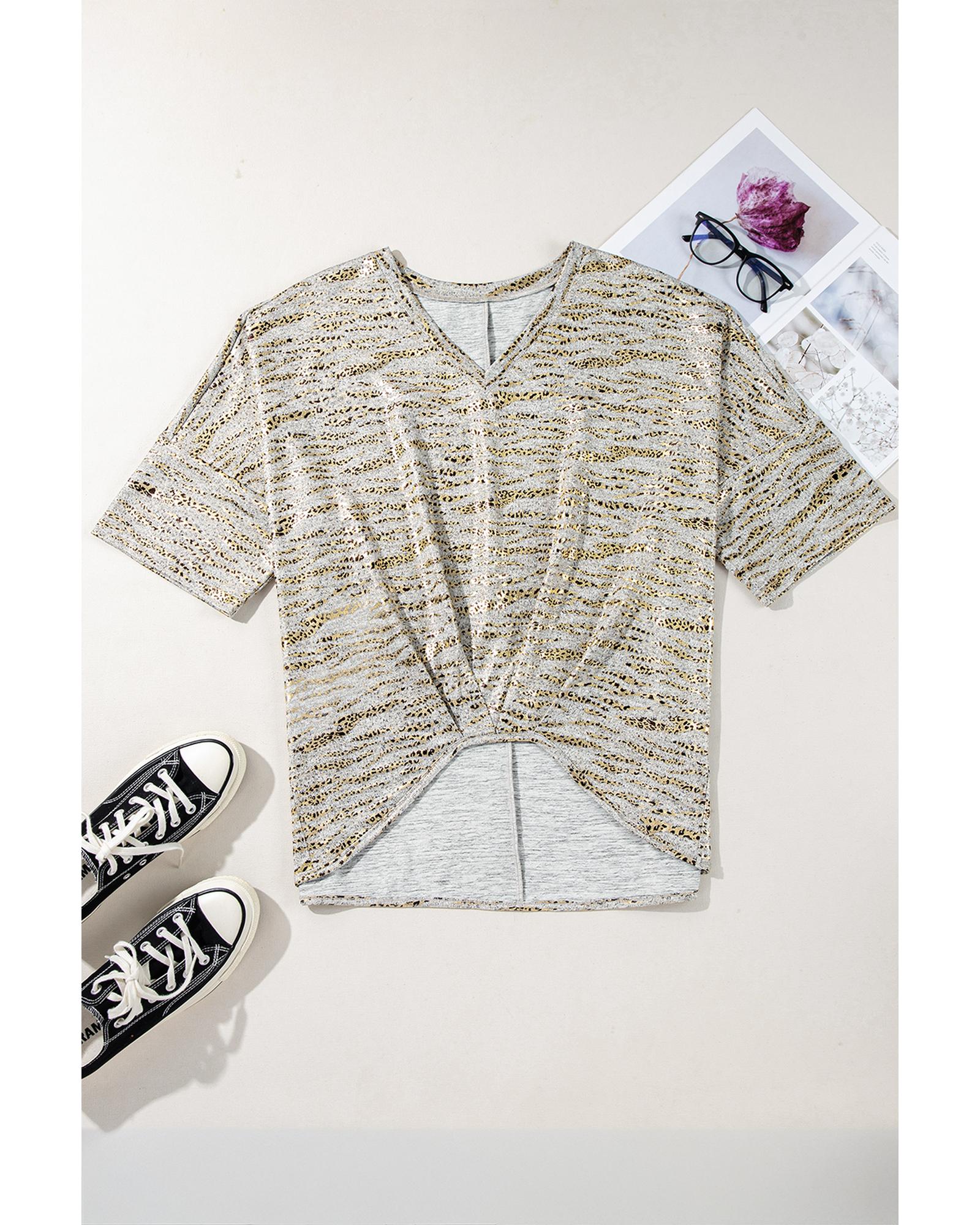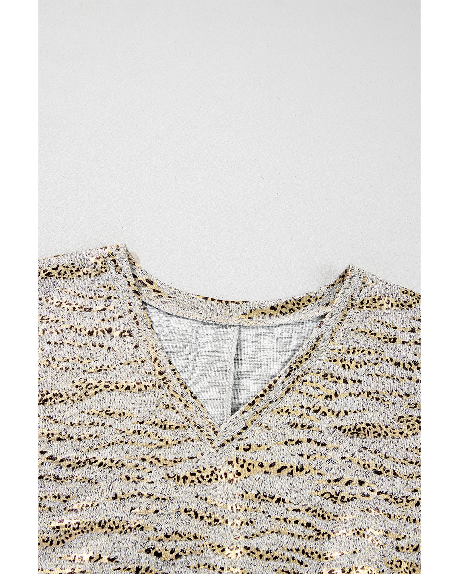 Gray Leopard Print Half Sleeve V Neck Loose Fit T Shirt – M