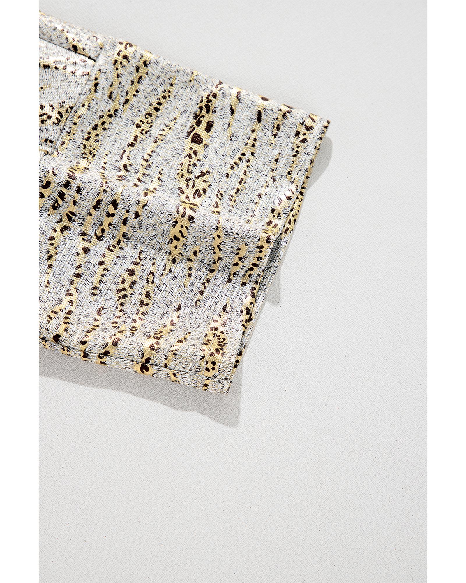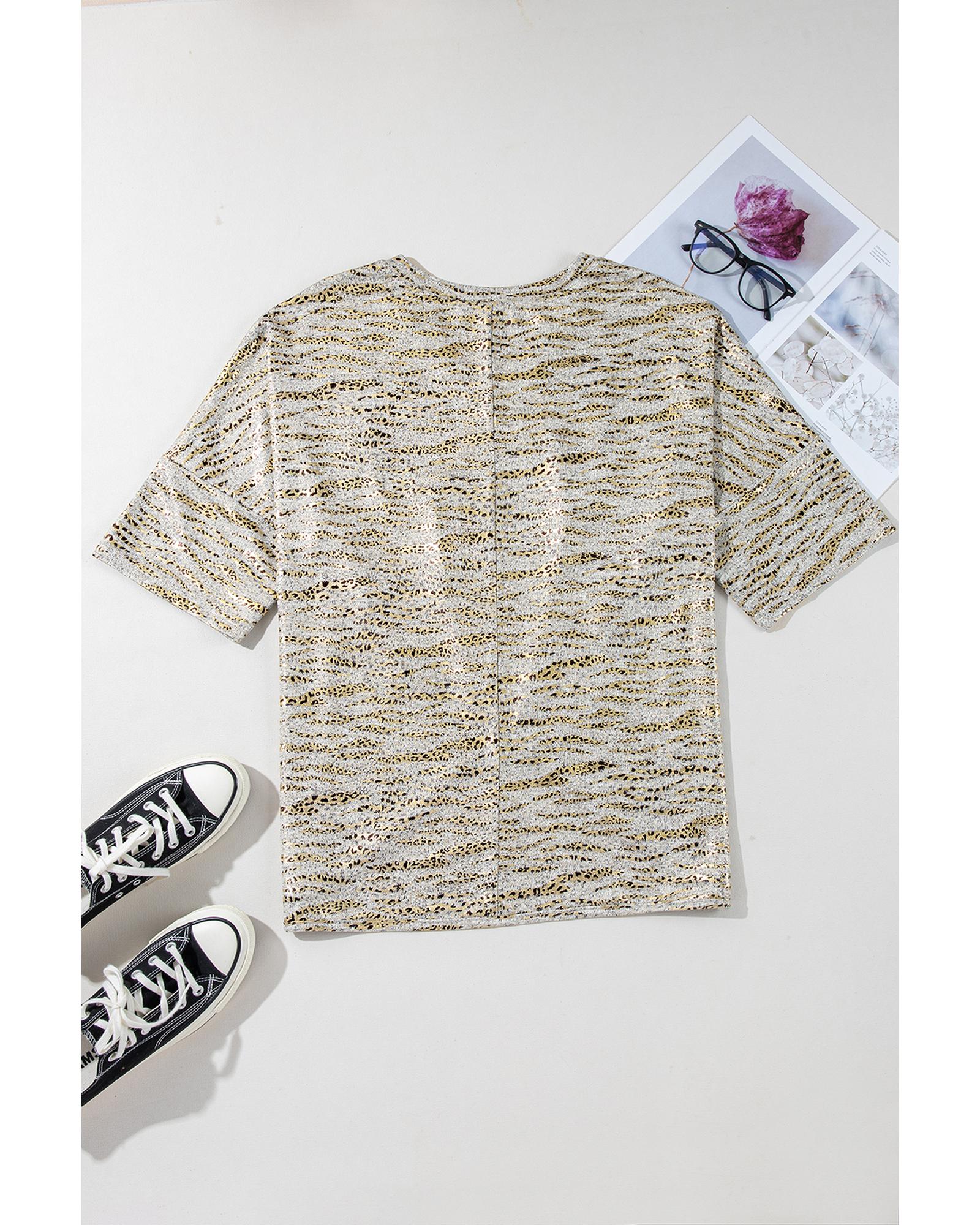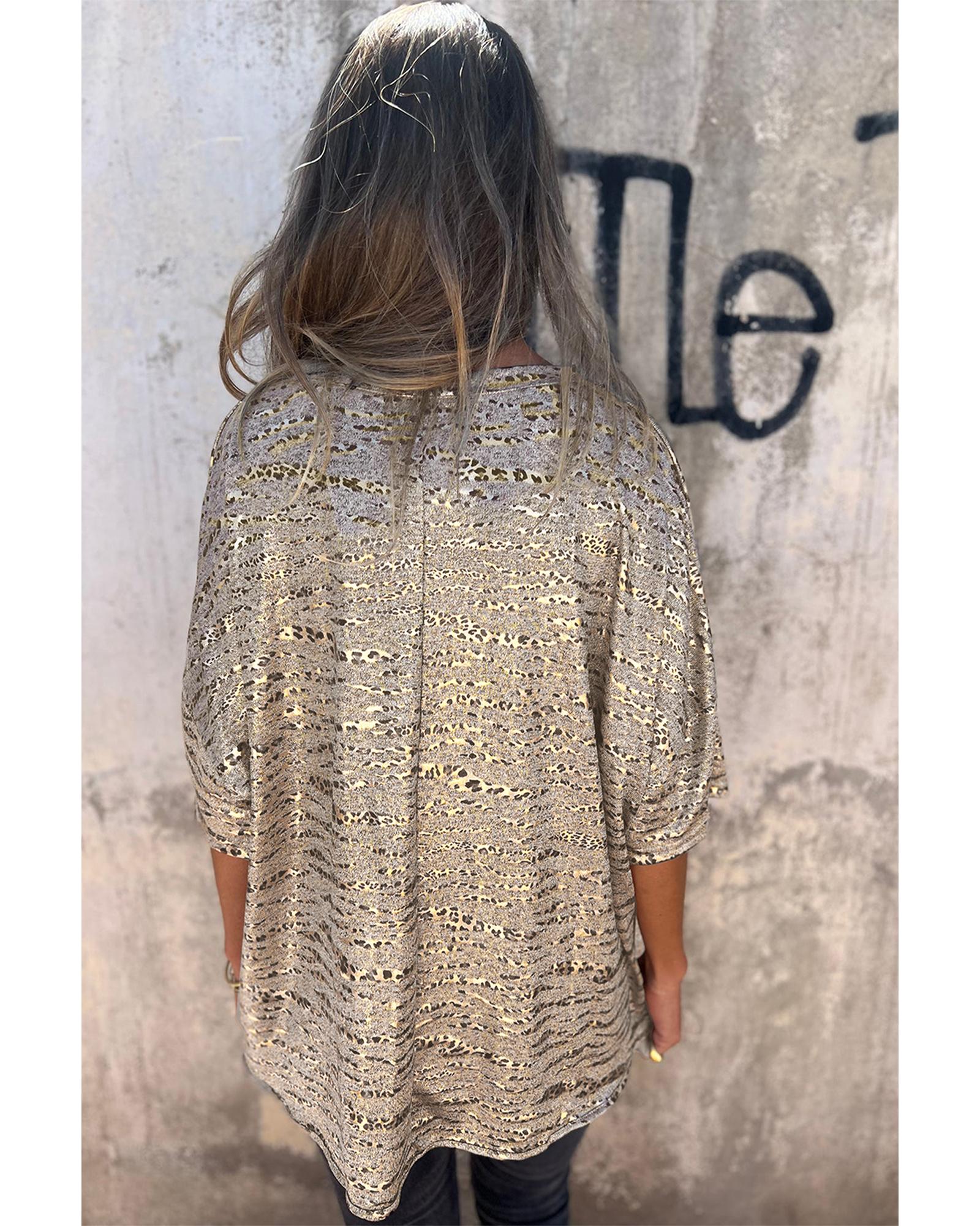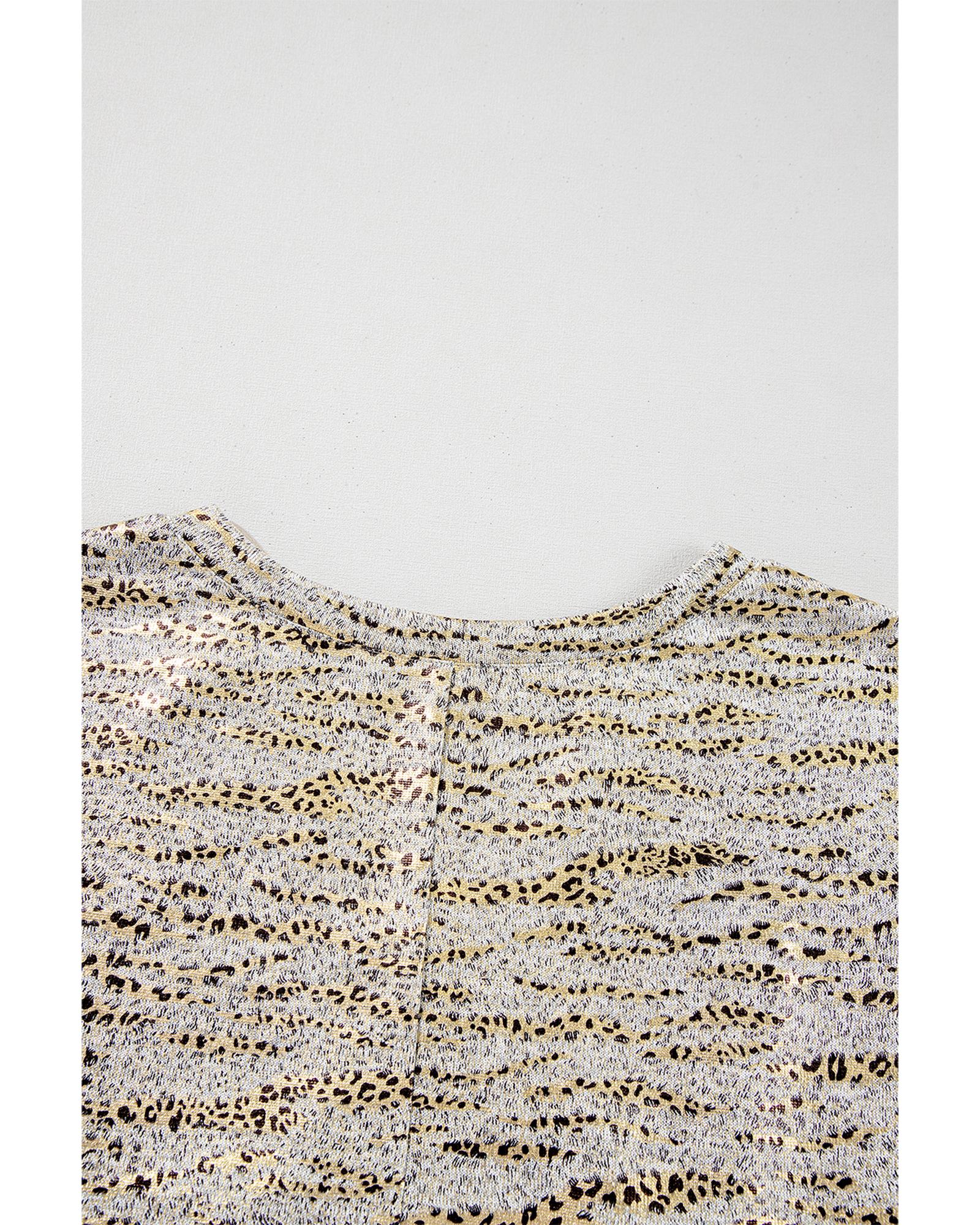 Gray Leopard Print Half Sleeve V Neck Loose Fit T Shirt – M