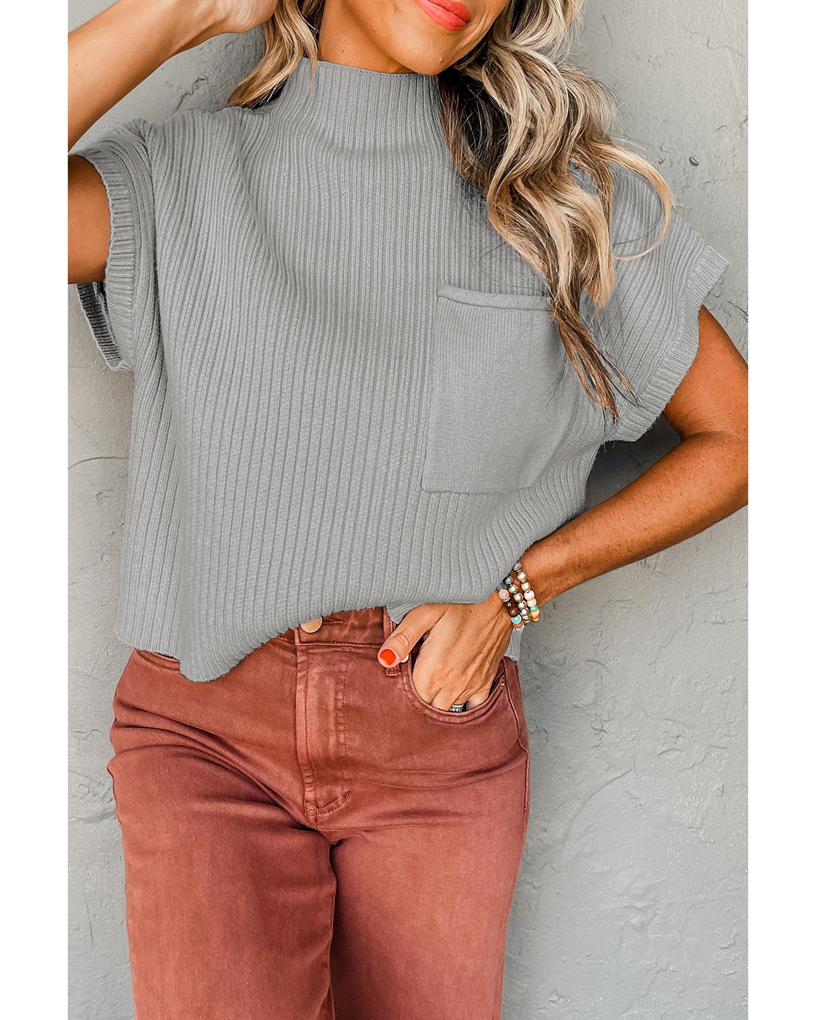 Gray Patch Pocket Ribbed Knit Short Sleeve Sweater – M