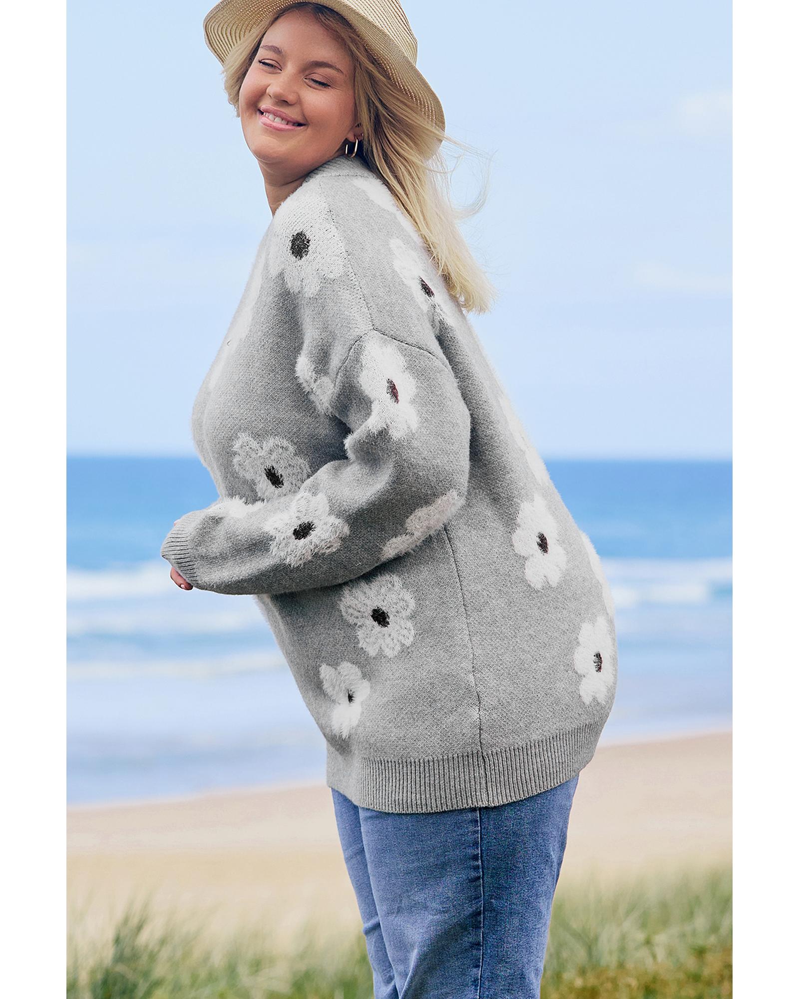 Gray Plus Size Embroidered Floral Pattern Half Zip Sweater – 3X