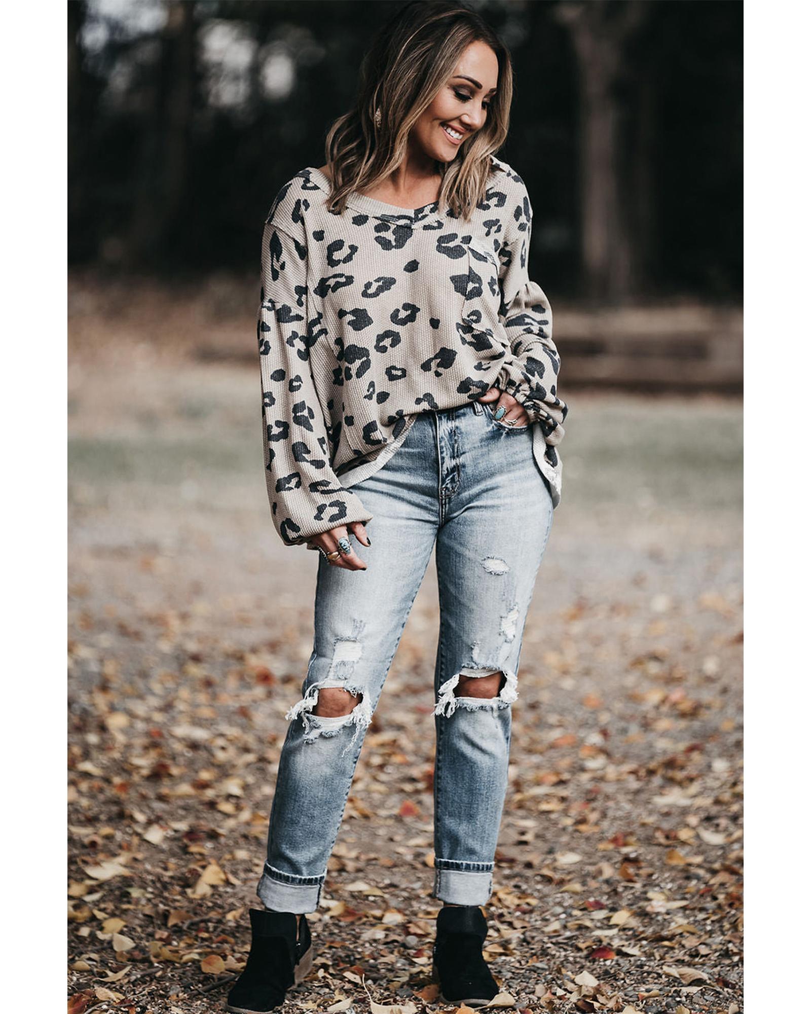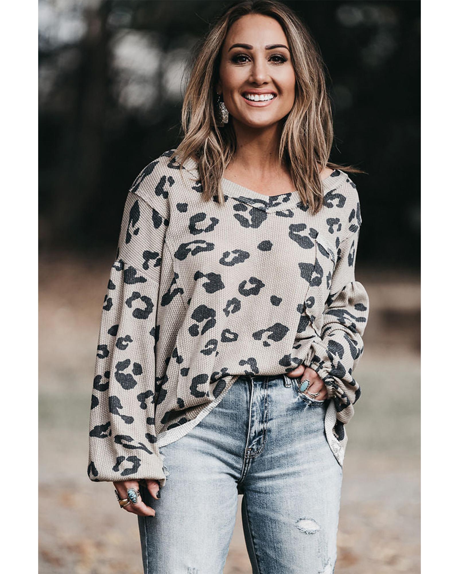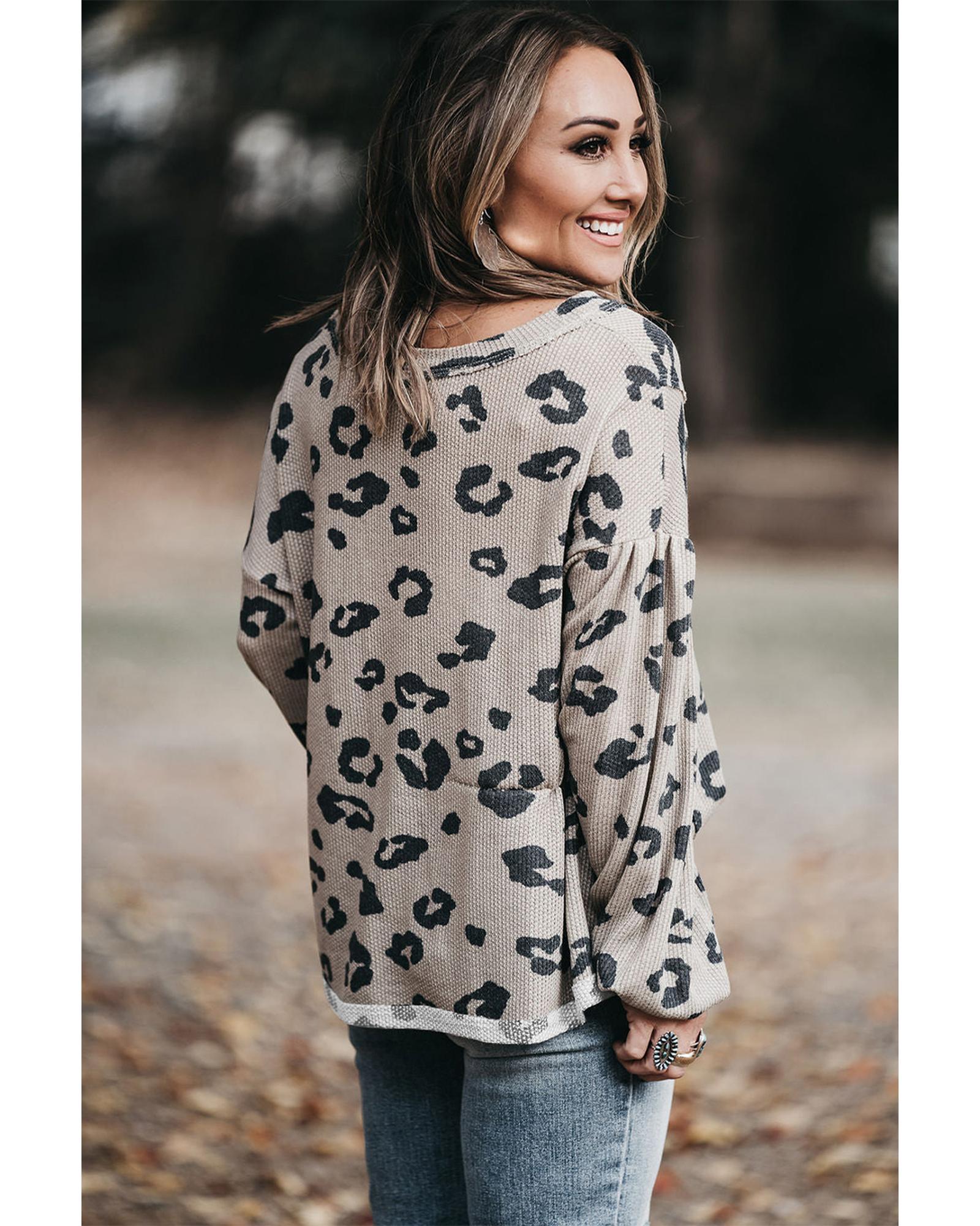 Gray Printed Leopard Balloon Sleeve Thermal Knit Plus Size Top – 1X