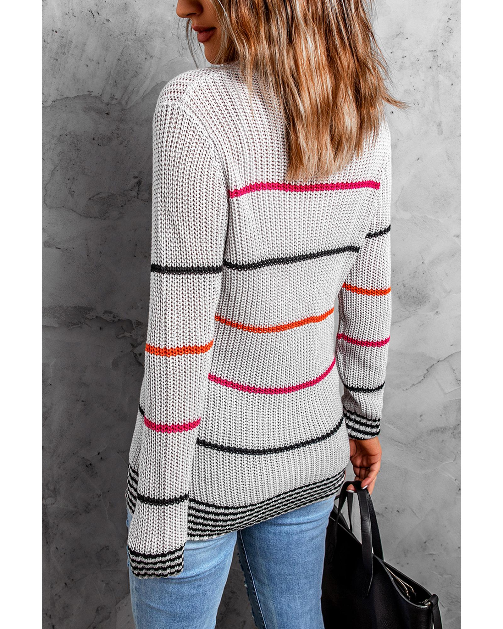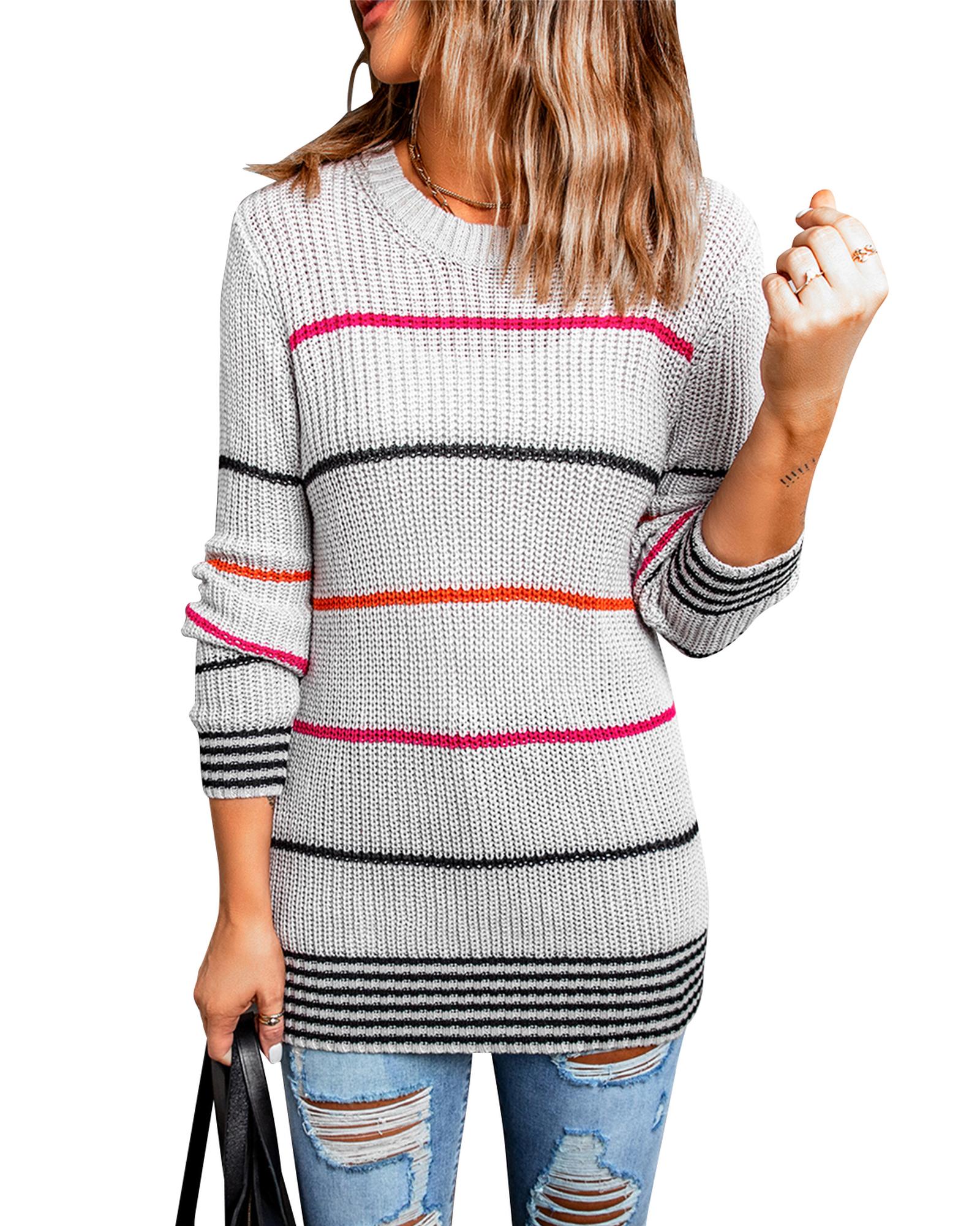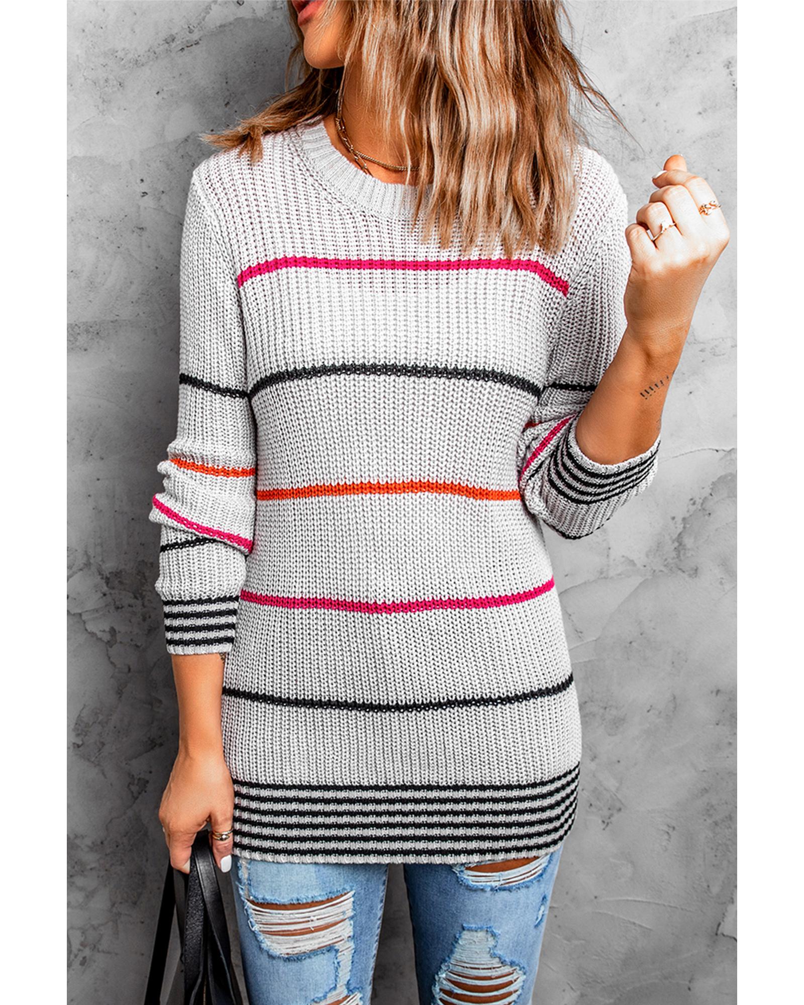 - Colorful stripes design on a gray sweater