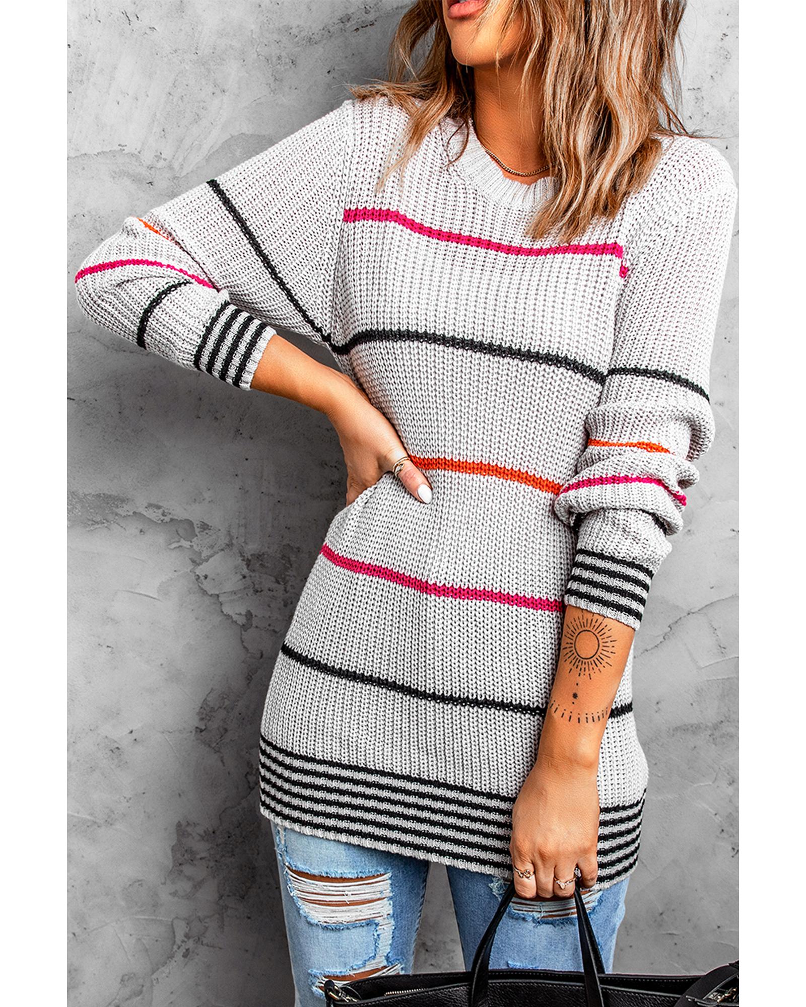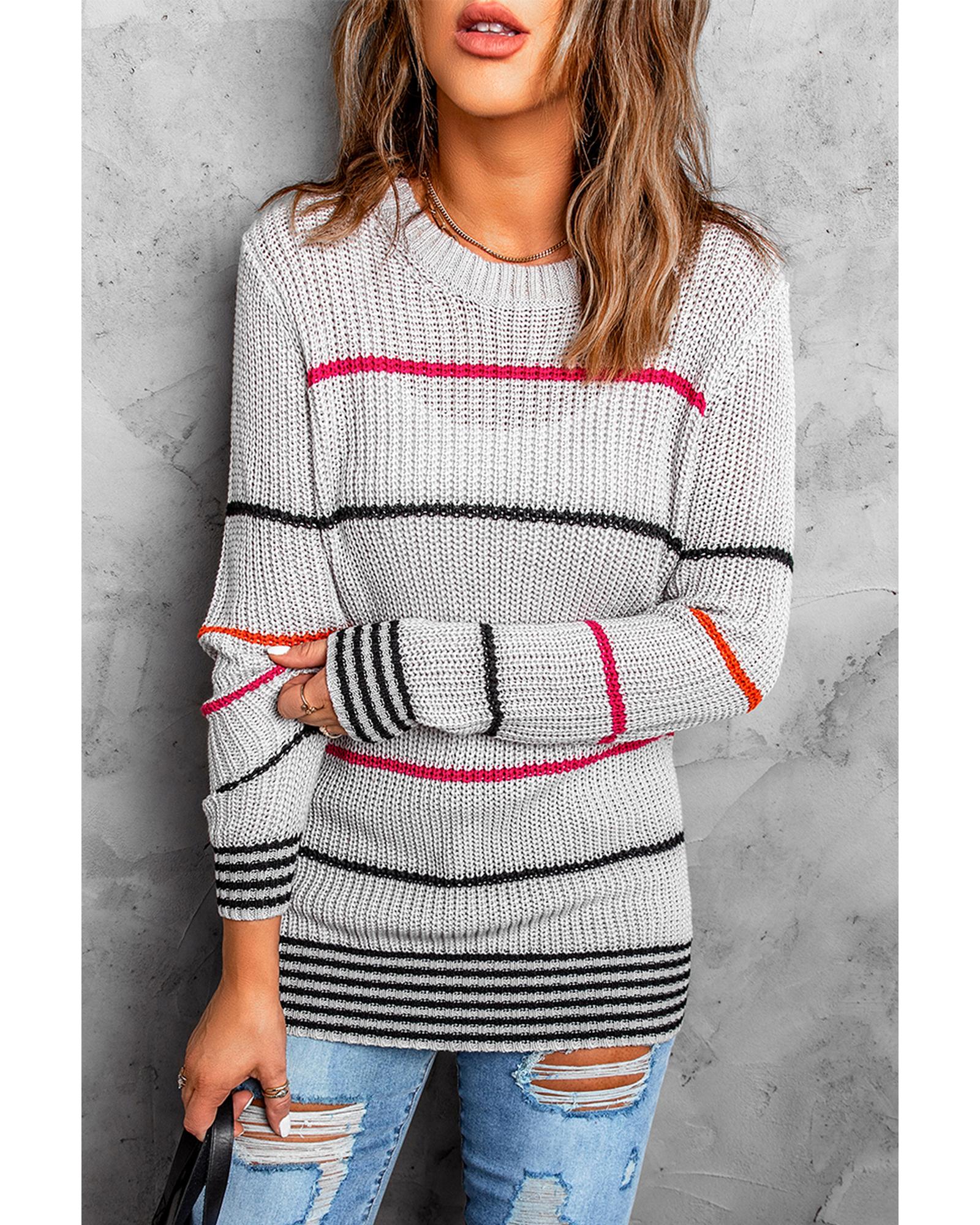 - Colorful stripes design on a gray sweater
