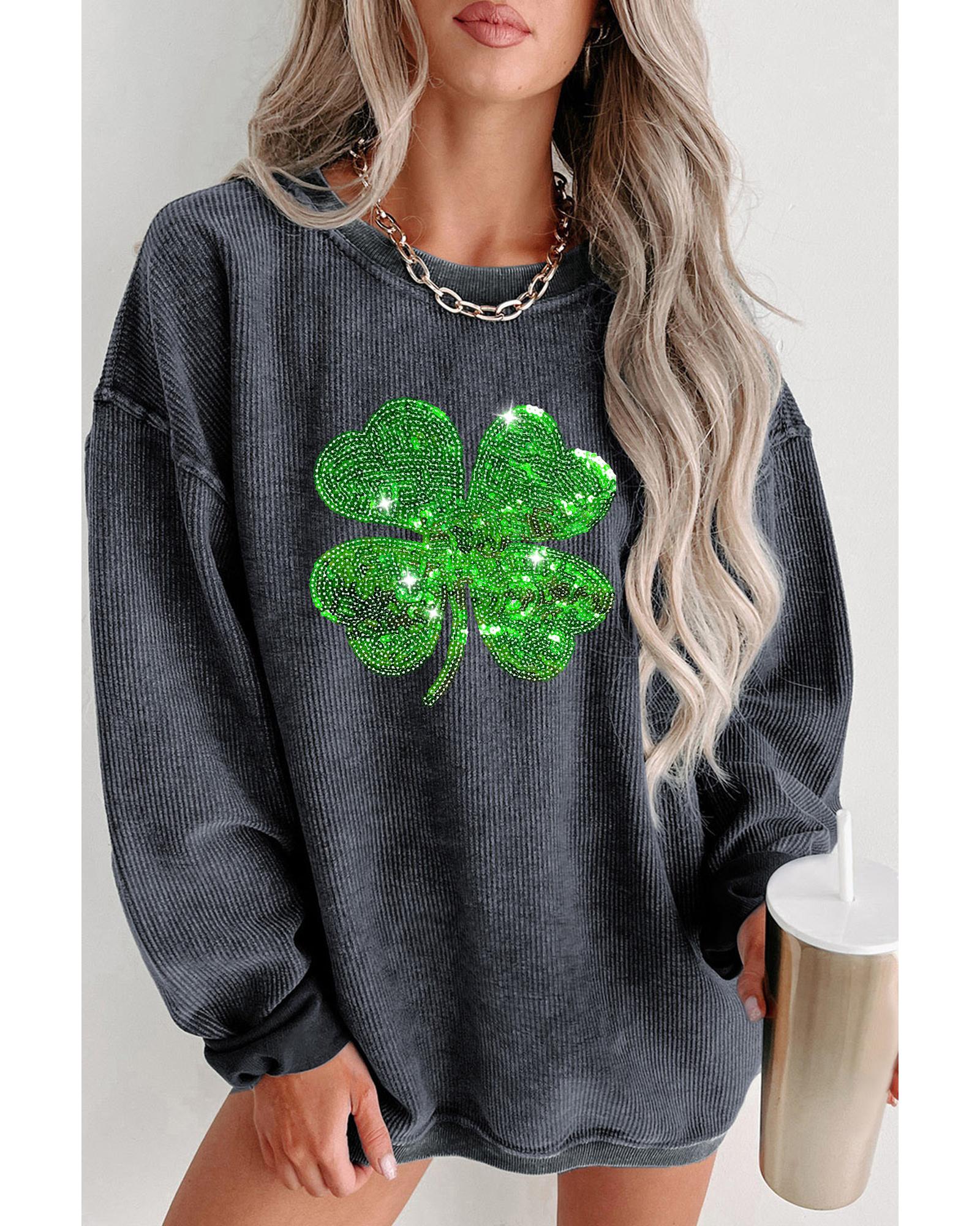 - Gray Sequin St Patrick Clover Patch Corded Sweatshirt