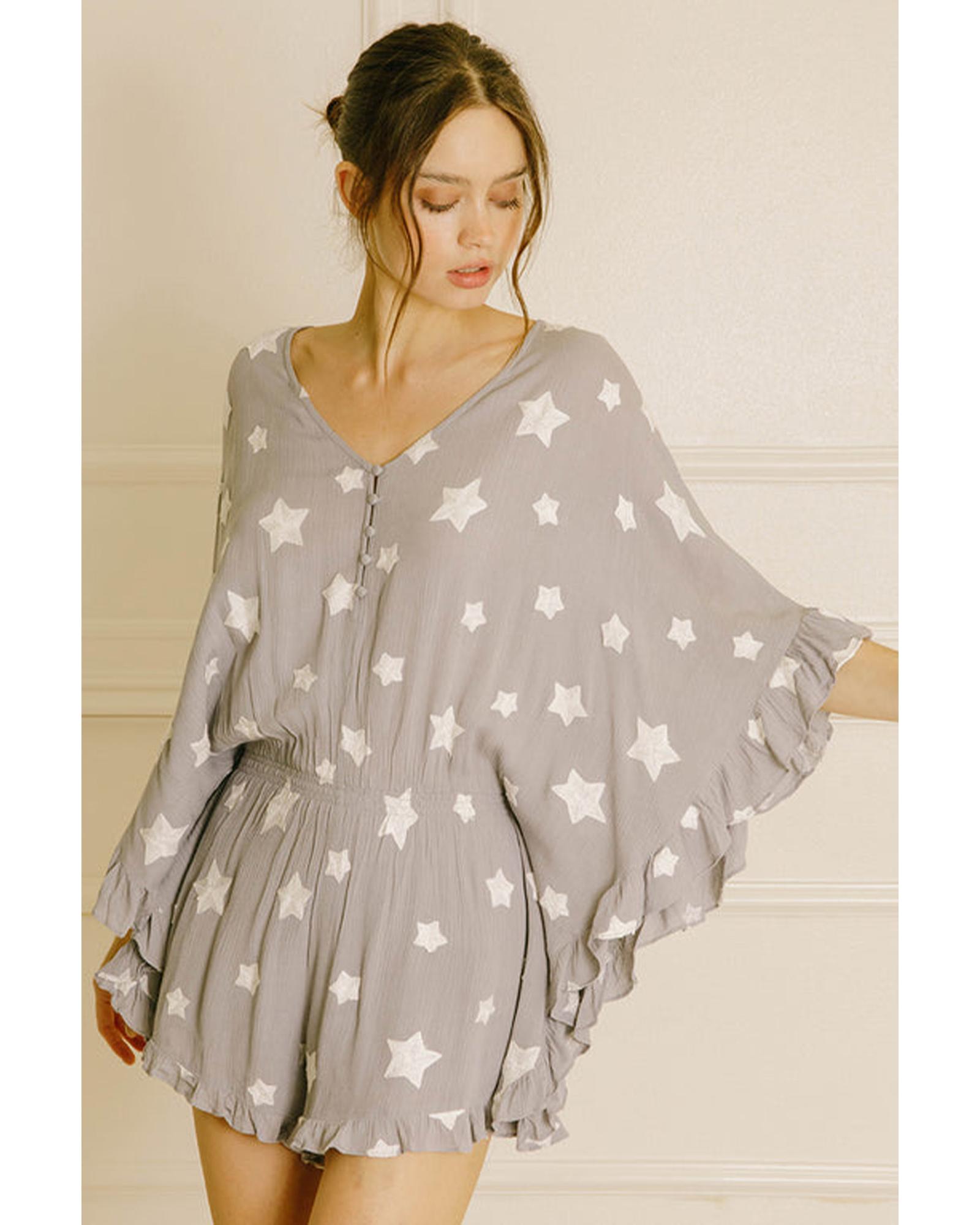 Gray Star Print Crinkle Textured Kimono Ruffle Sleeve Romper – S