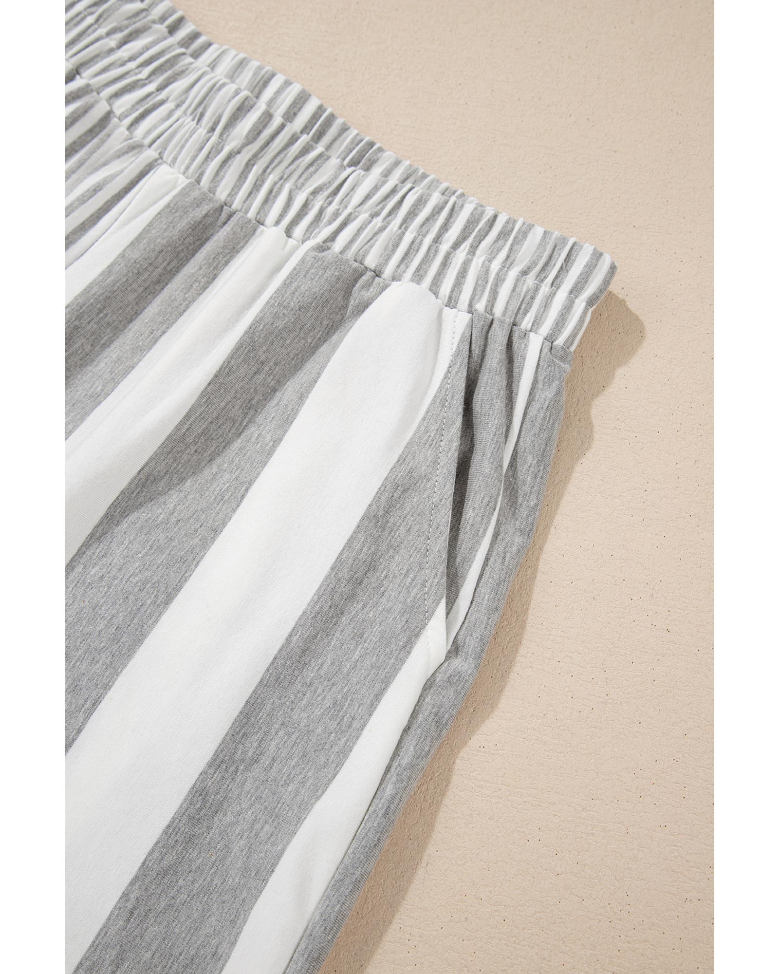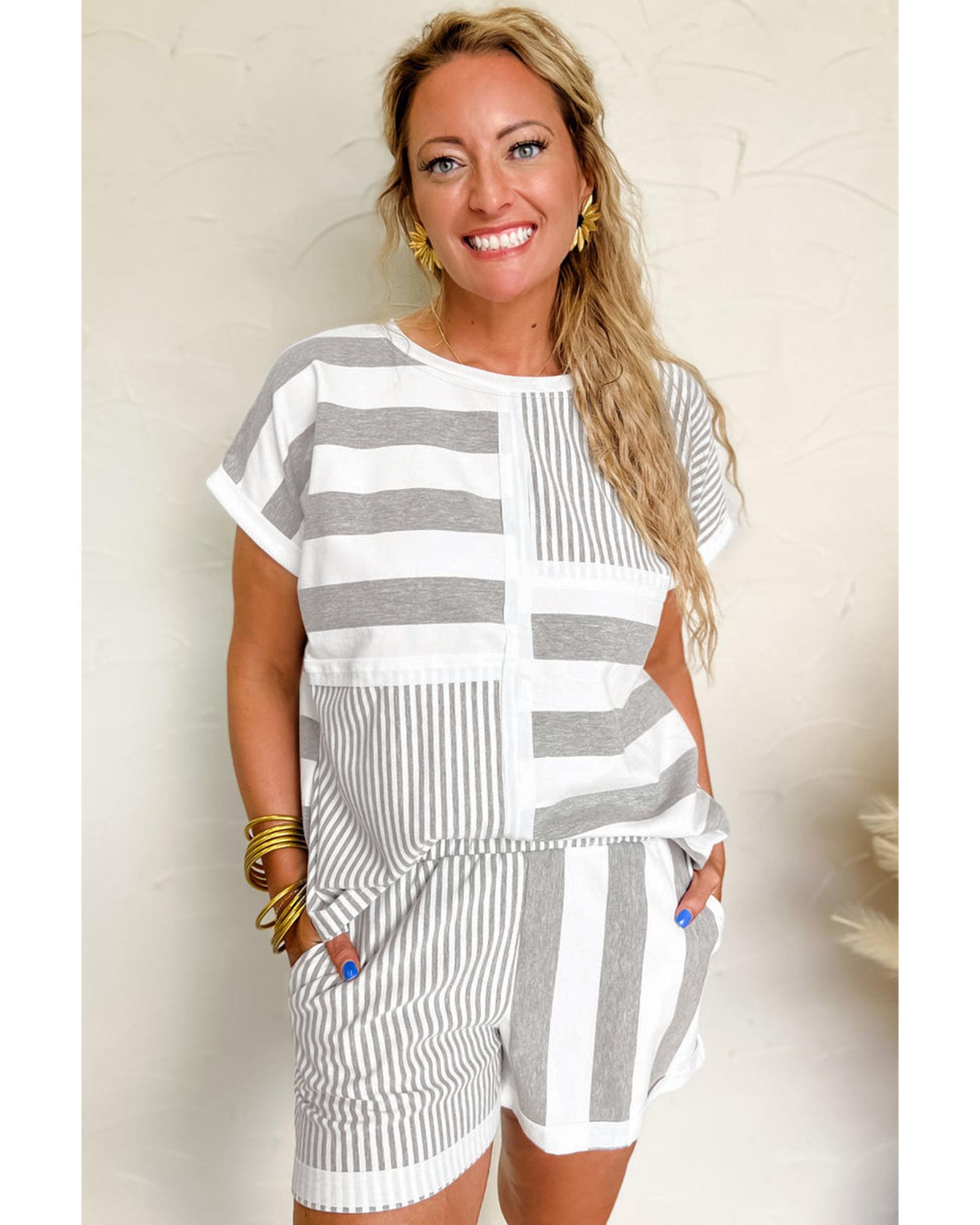 Gray Stripe Mixed Print Short Sleeve Top and Pocketed Shorts Set – M