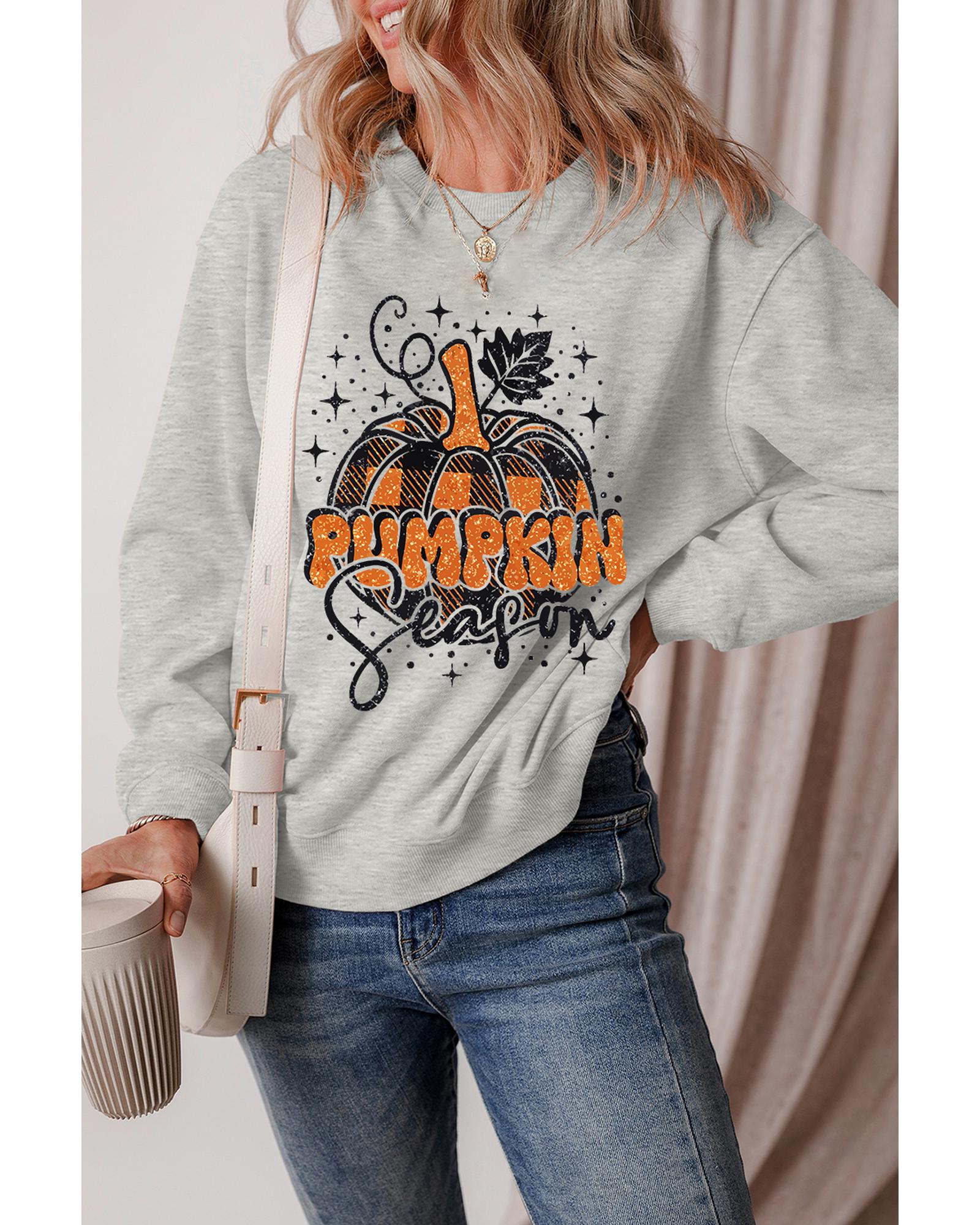 - Festive gray sweatshirt with playful pumpkin details