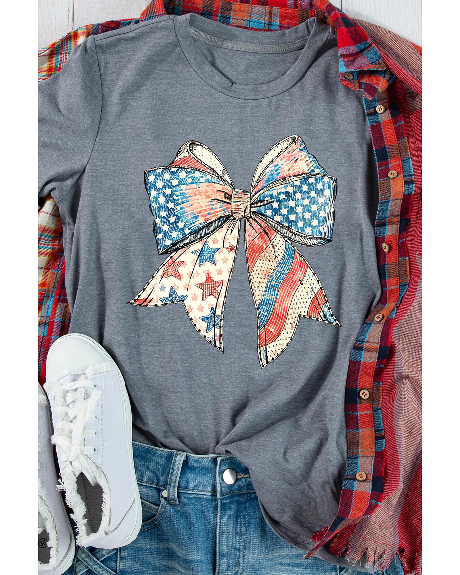 Gray US Flag Bow Print Round Neck Loose T Shirt – S