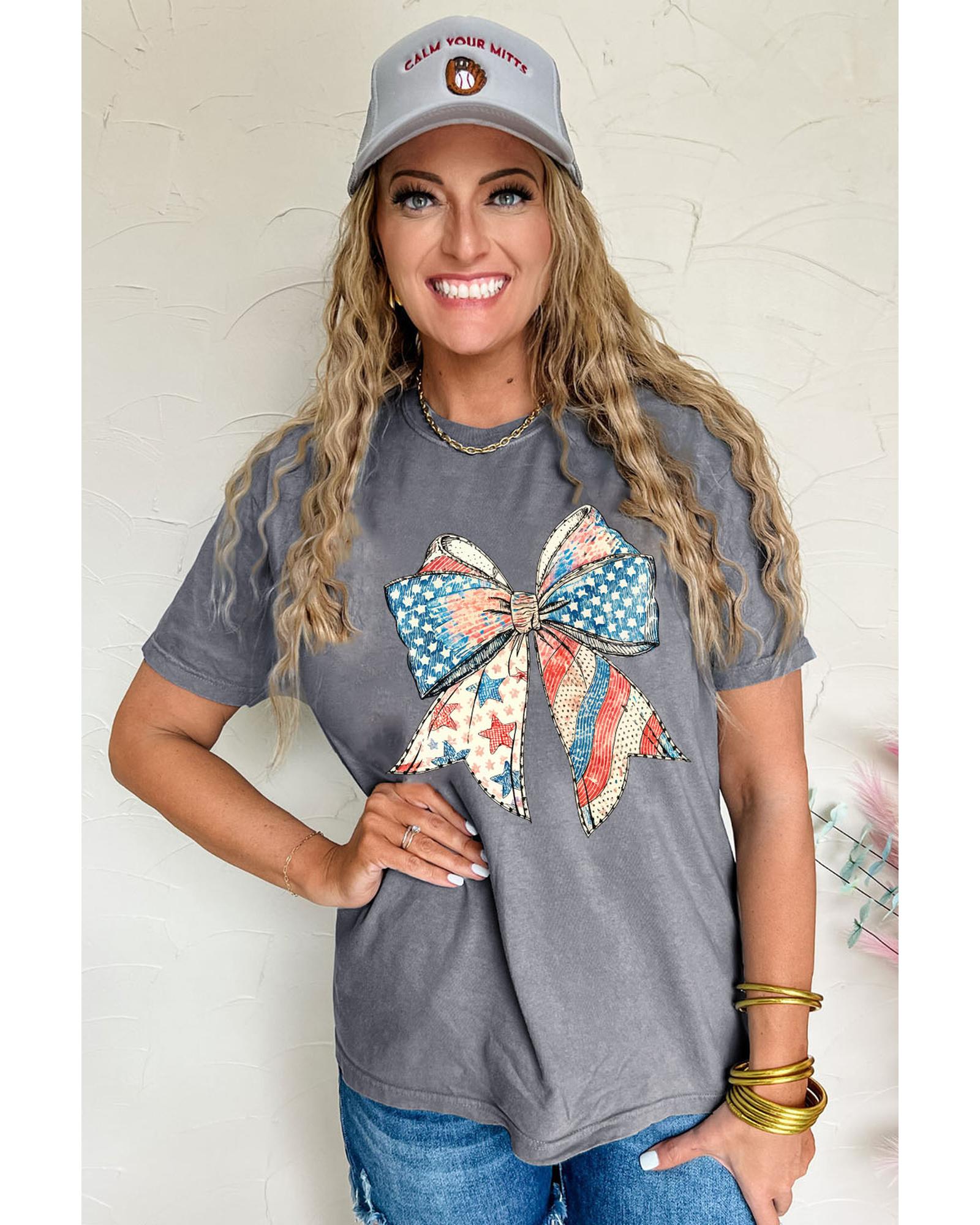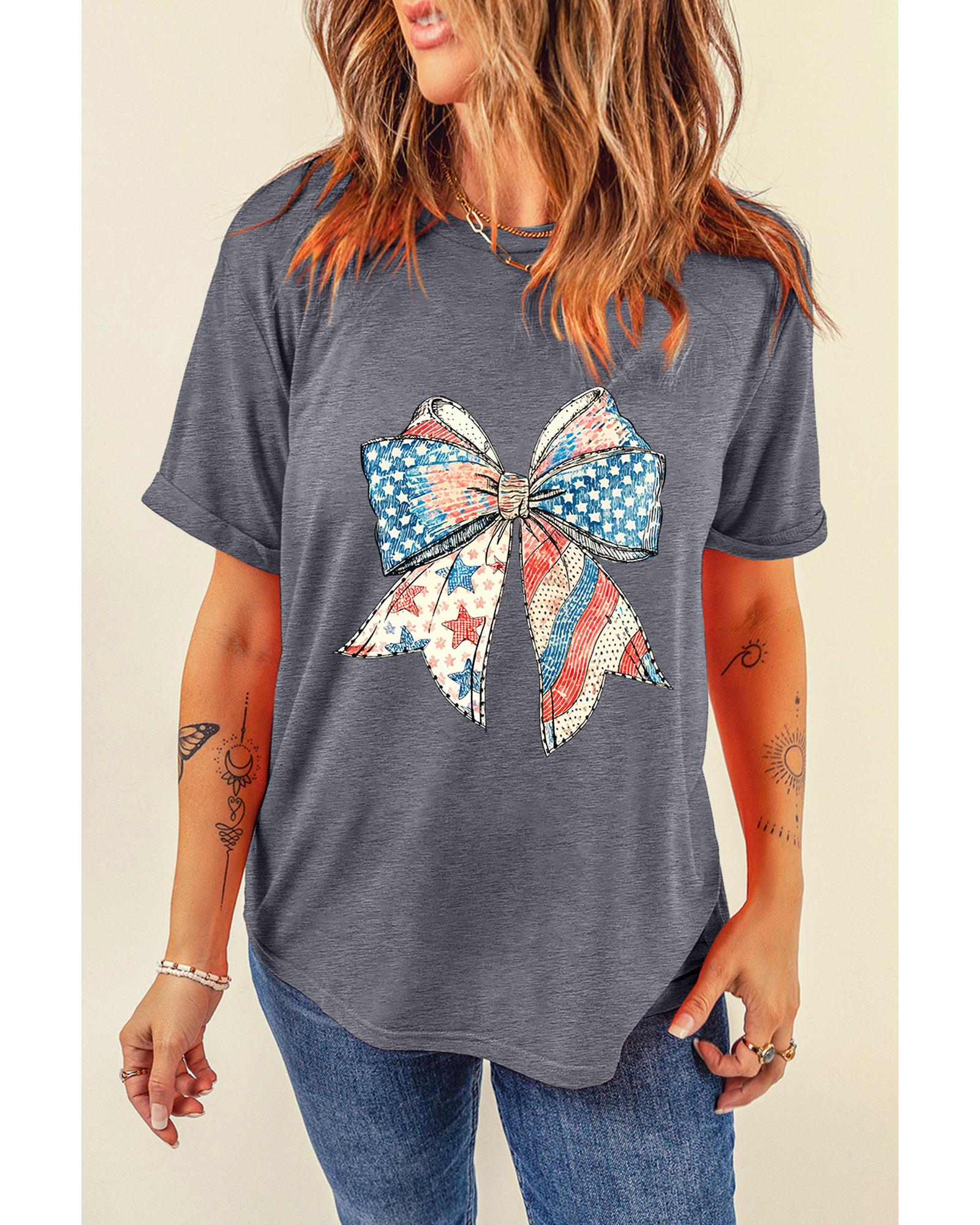 - Gray US Flag Bow Print Round Neck Loose T