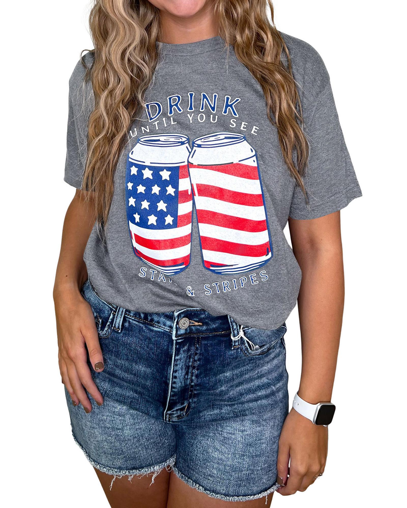 Gray USA Flag Drink Cans Slogan Graphic Tee US flag graphic print on the front Short sleeves for a comfortable fit Available in multiple sizes Refer to the size chart for accurate measurements Made for women