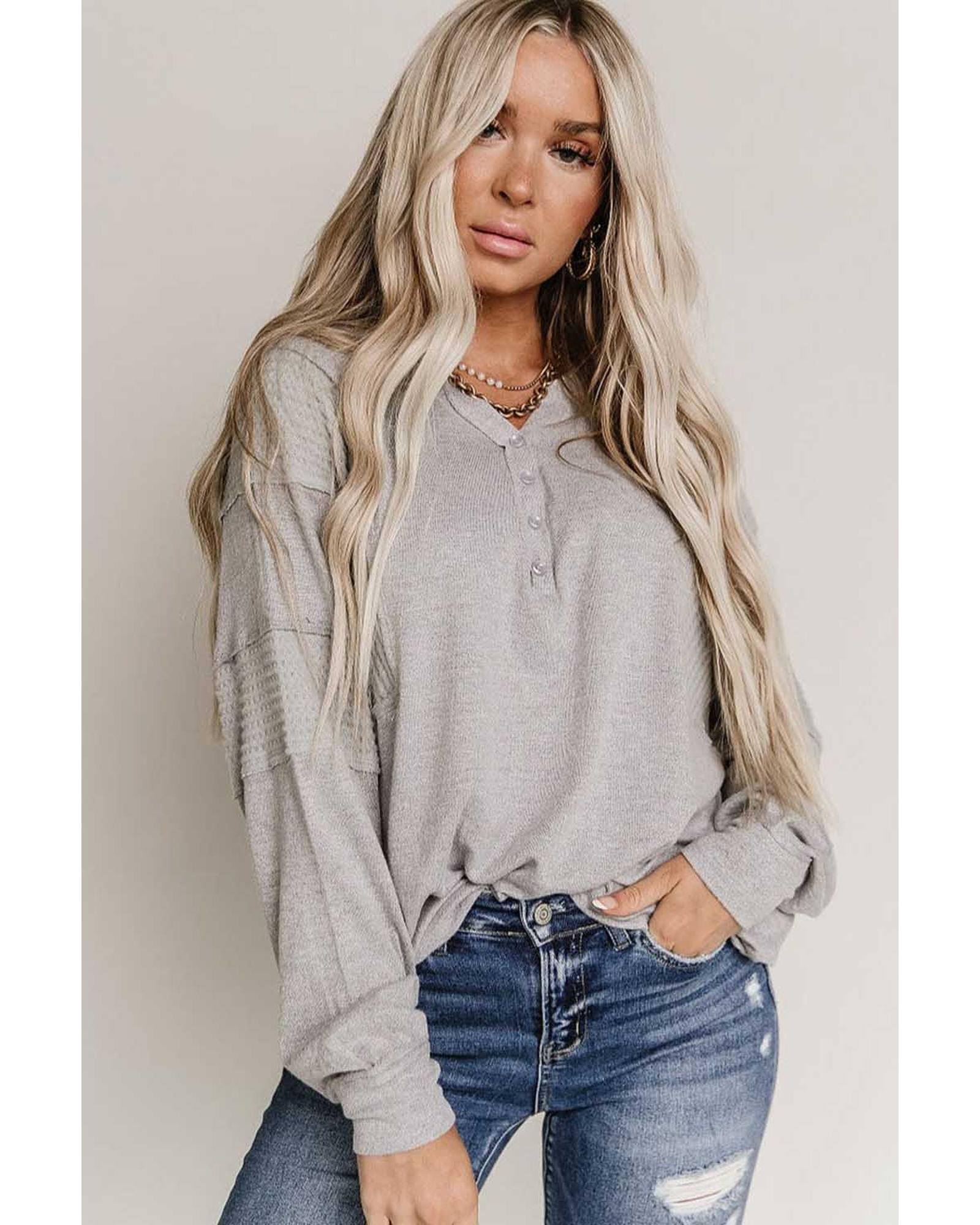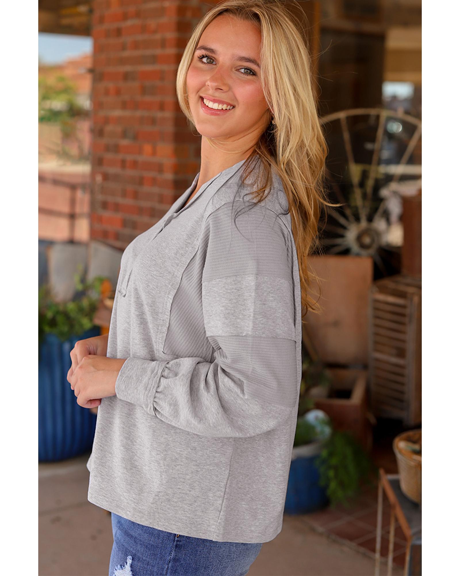 Gray Waffle Patchwork Dolman Sleeve Henley Top – L