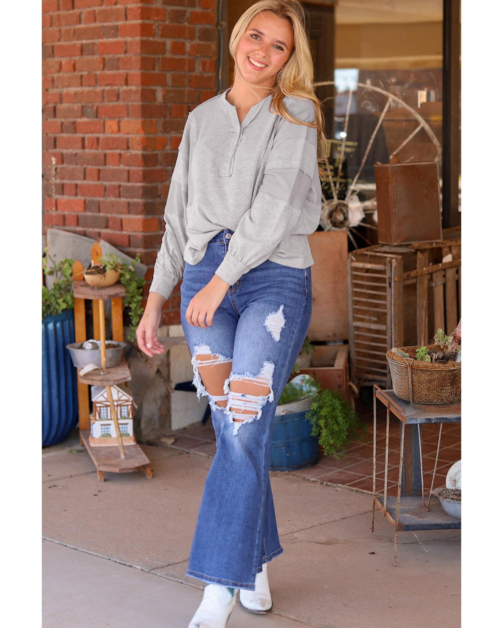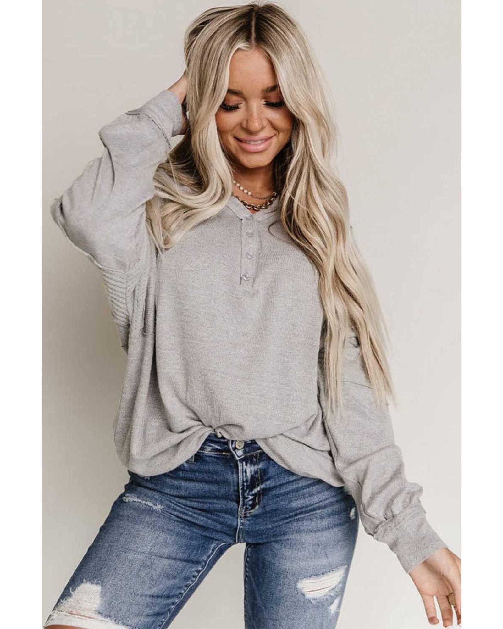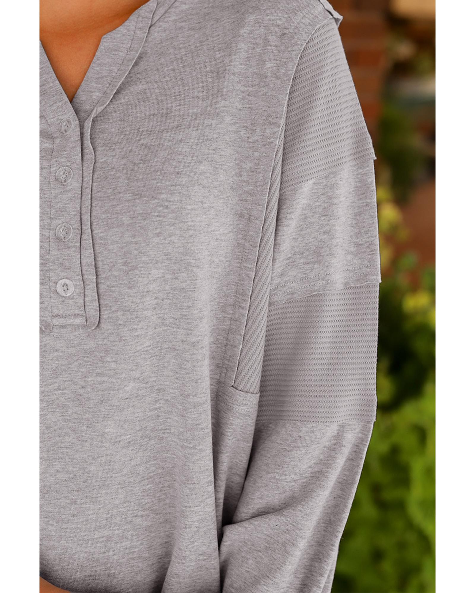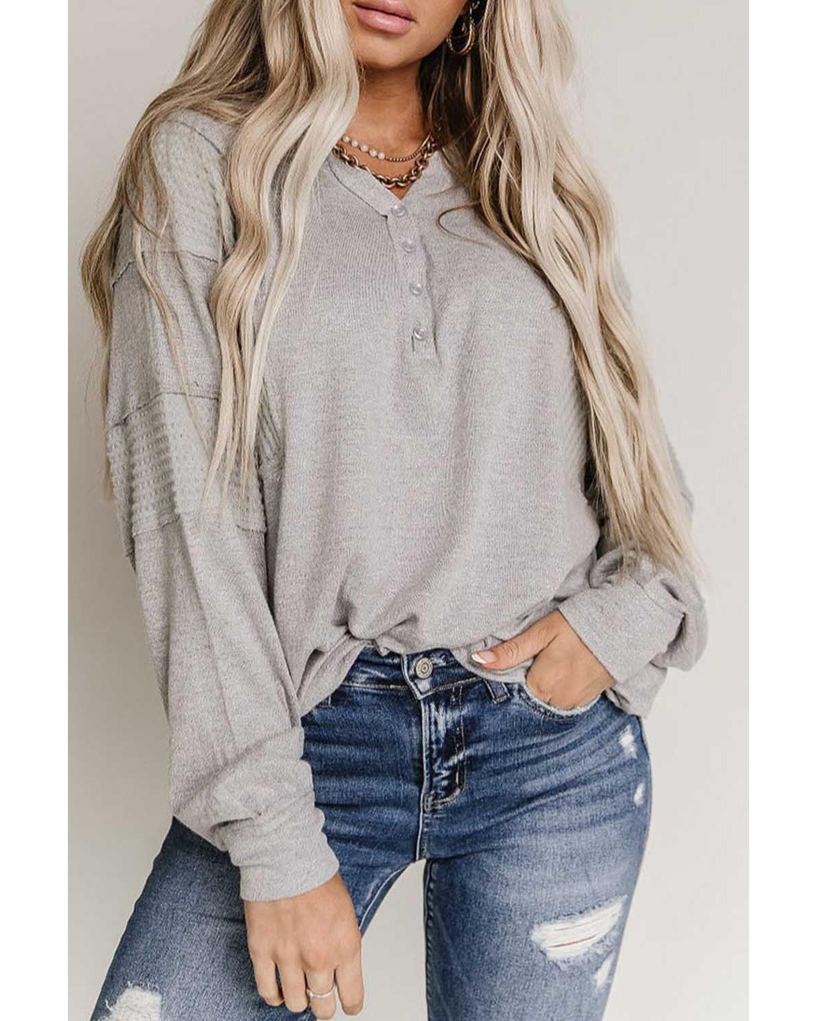 Gray Waffle Patchwork Dolman Sleeve Henley Top – M