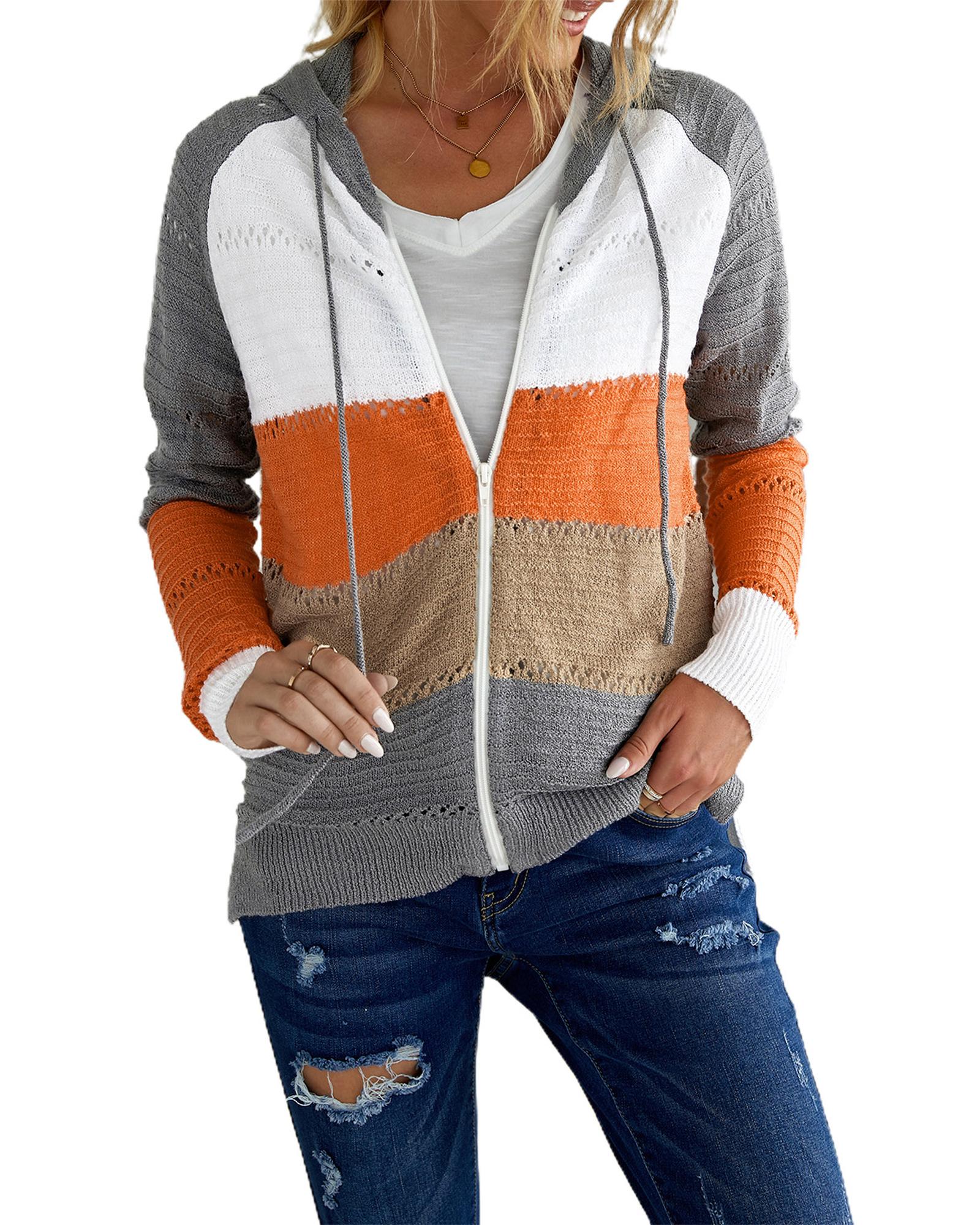 Gray Zipped Front Colorblock Hollow-out Knit Hoodie – M