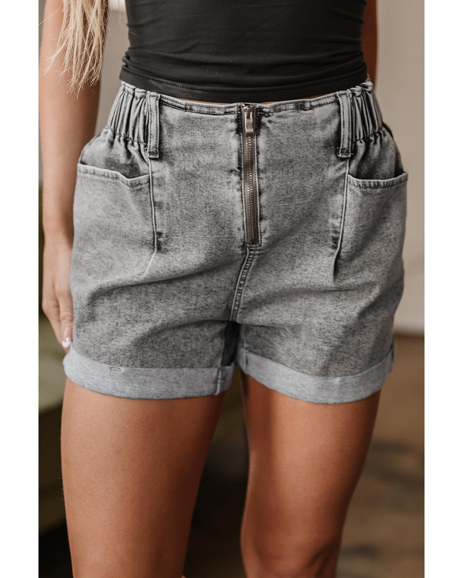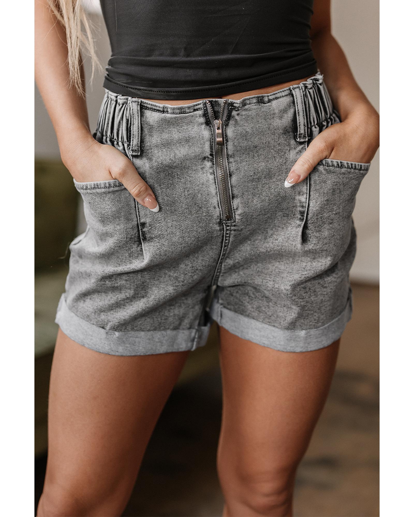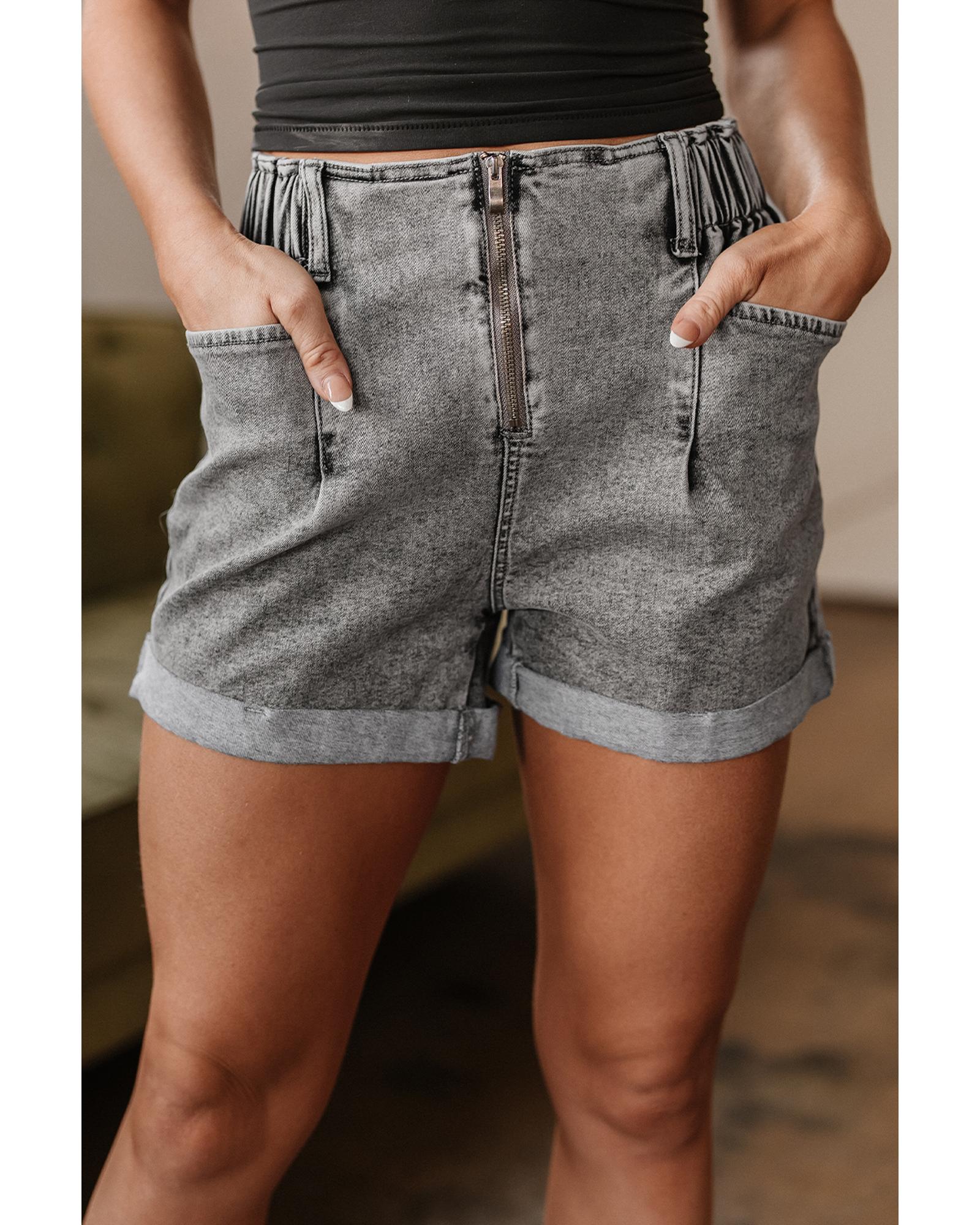 - Gray Zipped Light Wash Cuffed Edge Denim Shorts