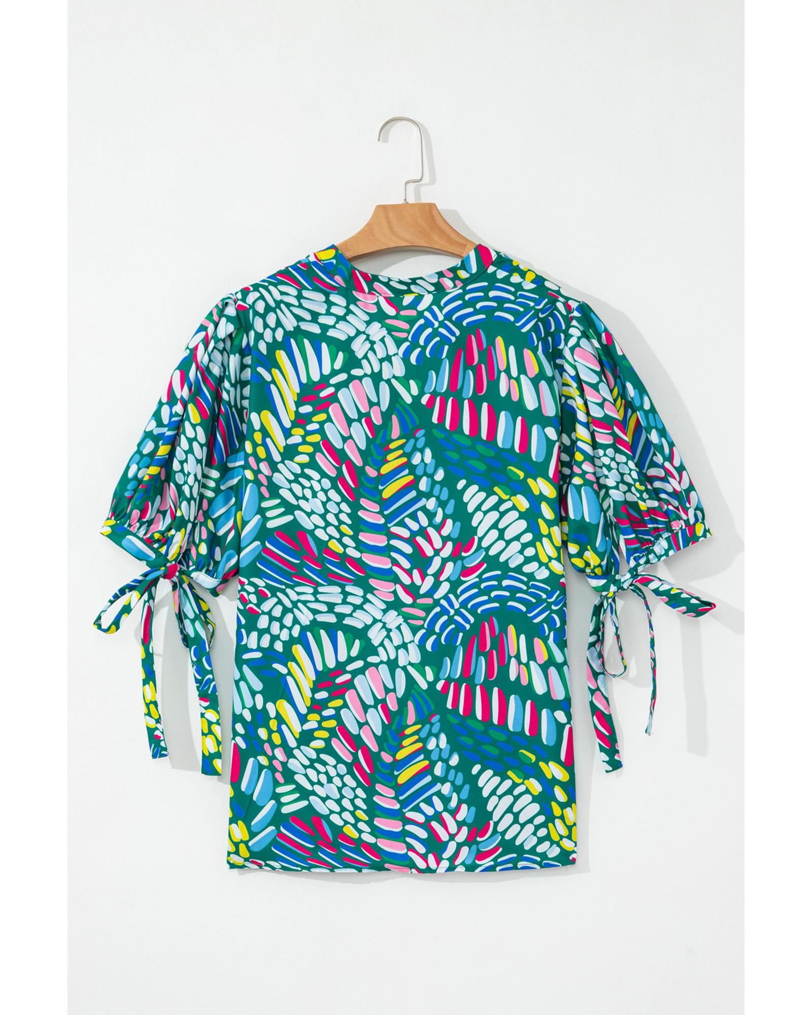Green Abstract Print Knotted Short Sleeve Plus Size Blouse - 2X