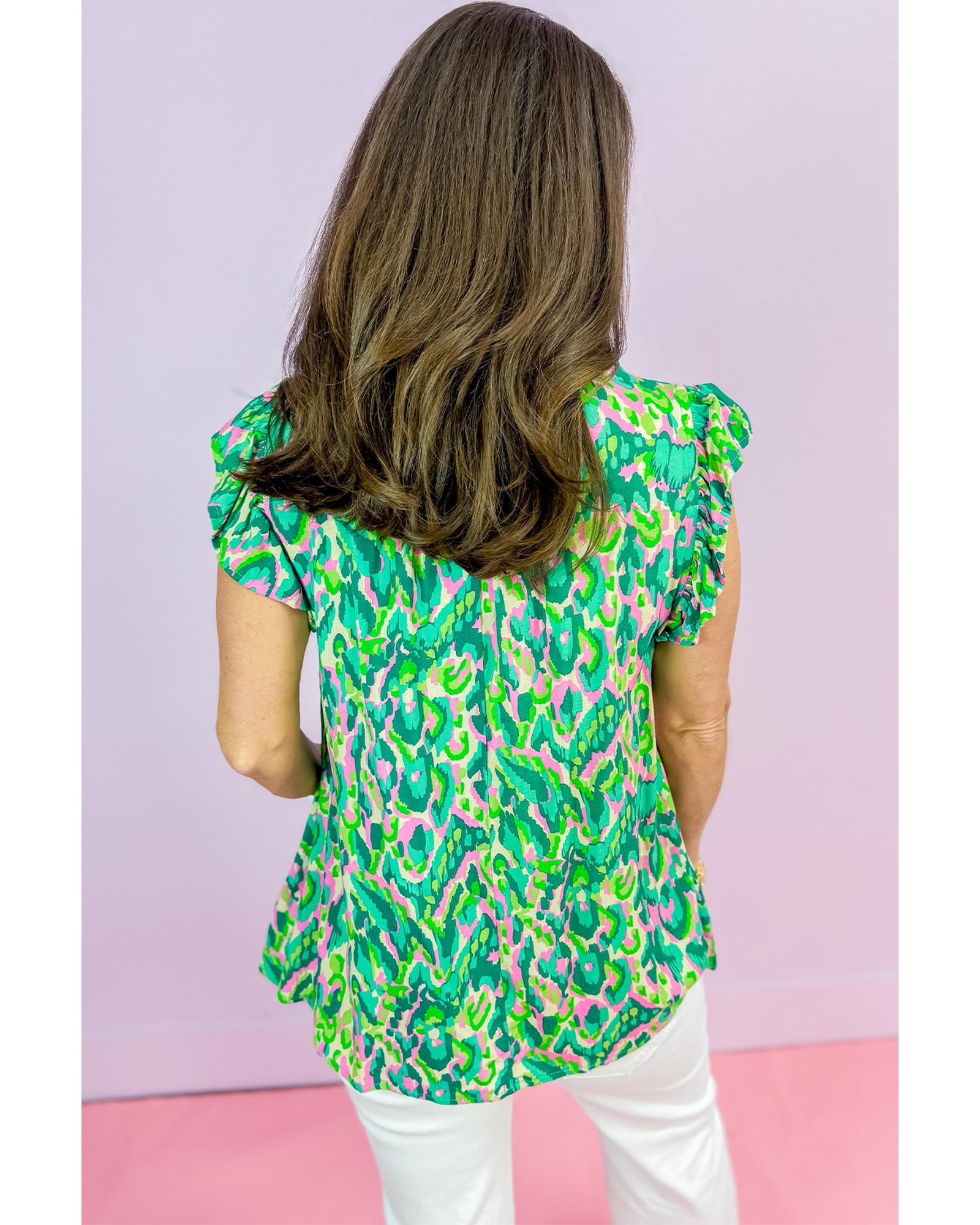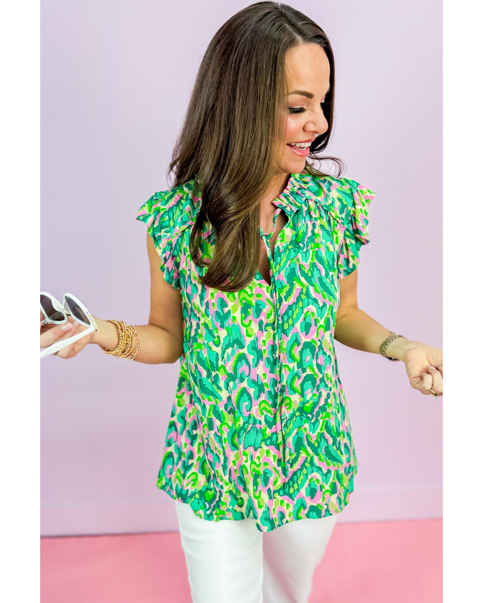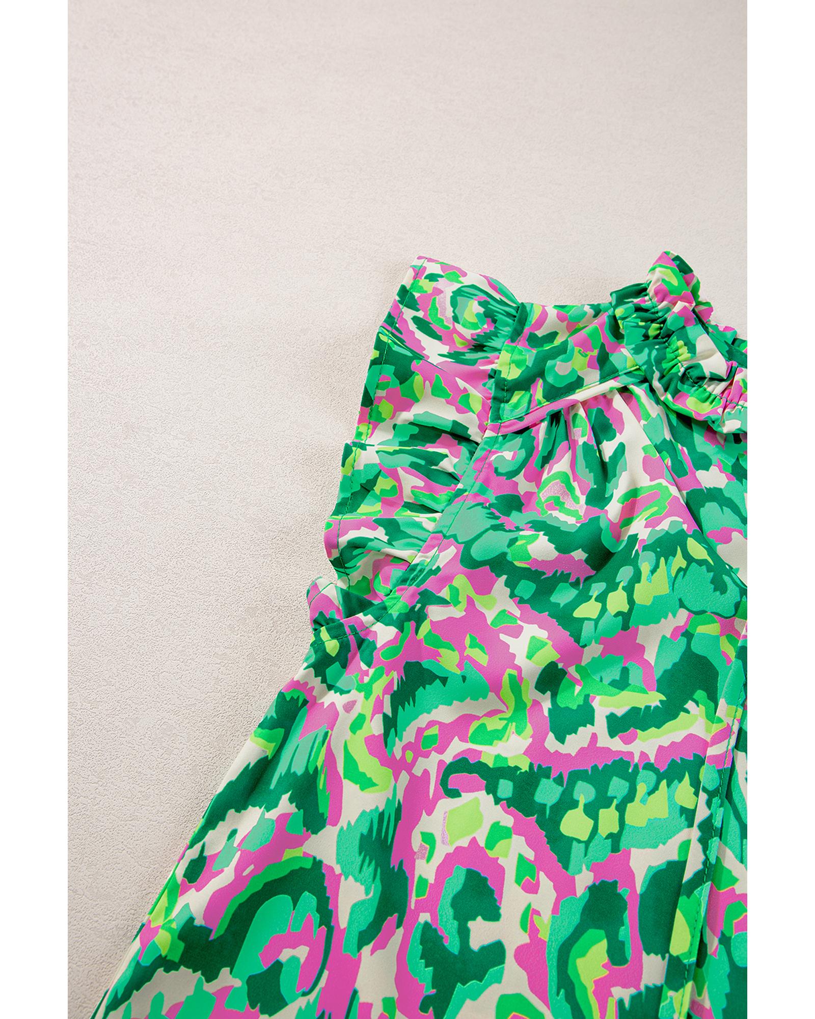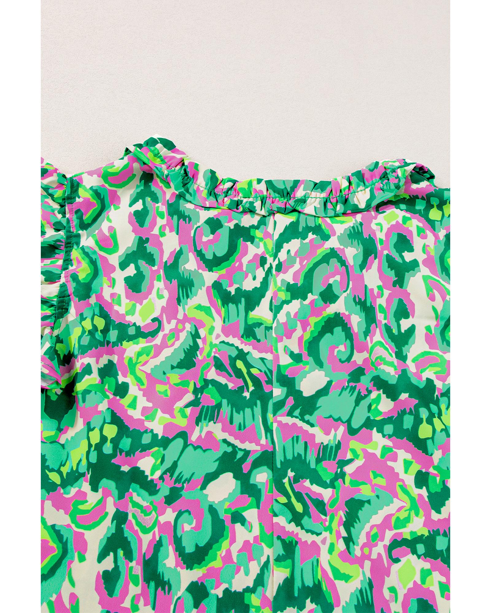 Green Abstract Print Ruffled Trim Tied Split Neck Tank Top – L