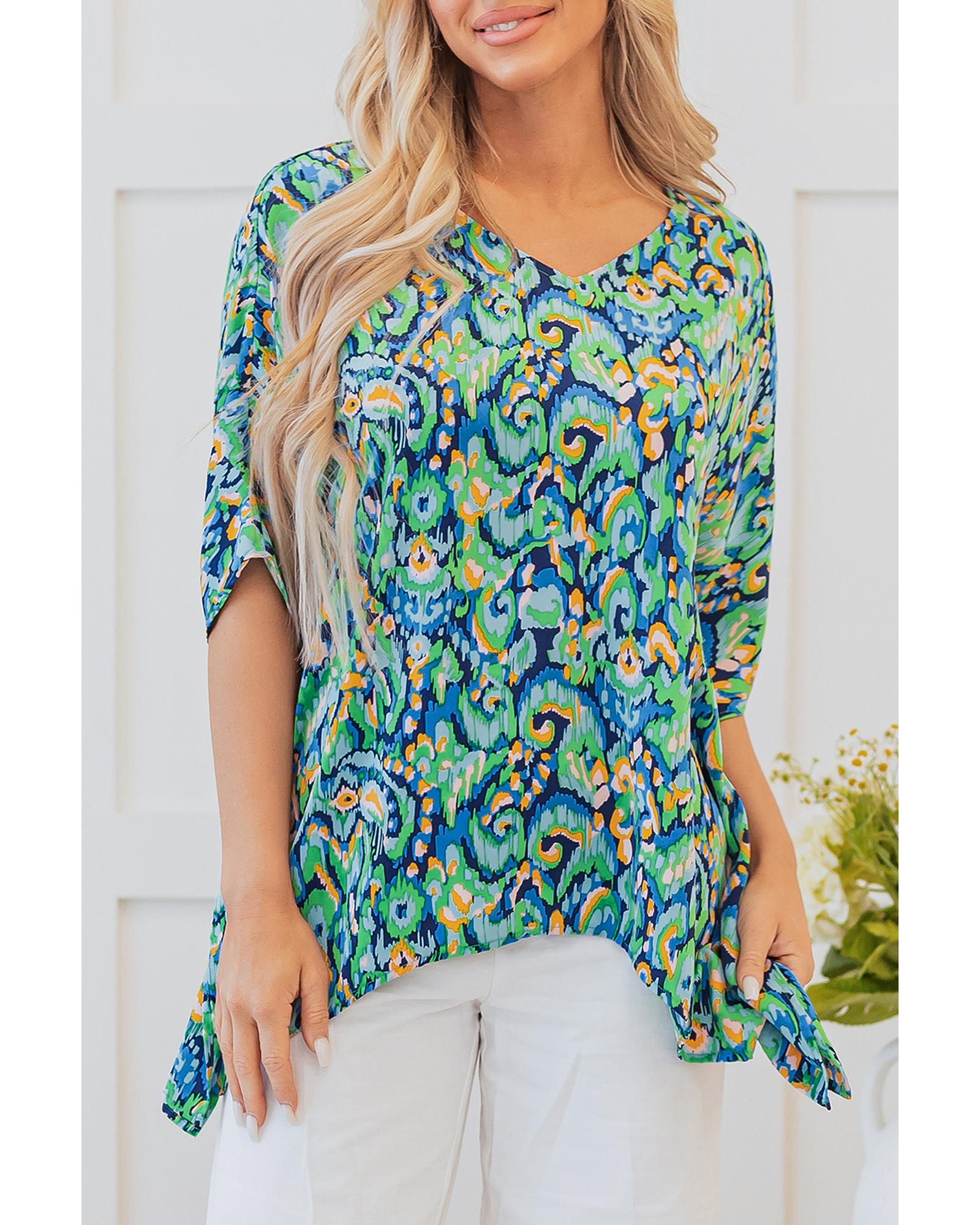 Green Abstract Print V Neck Half Sleeve Loose Fit Tunic Blouse – XL