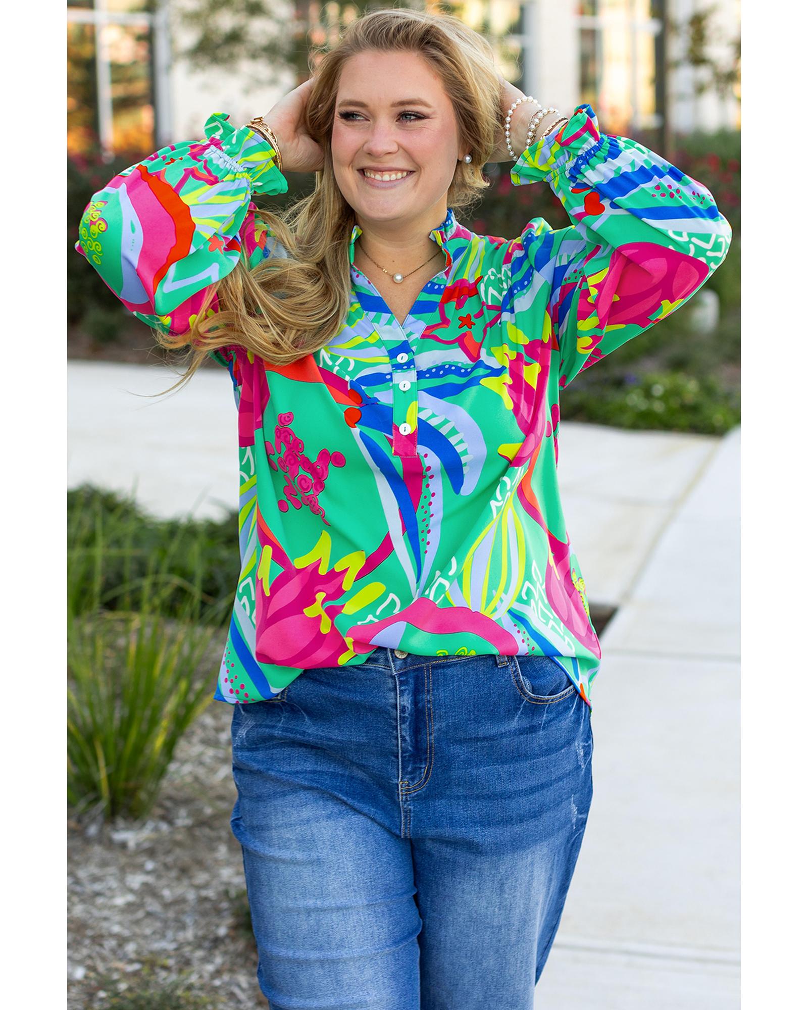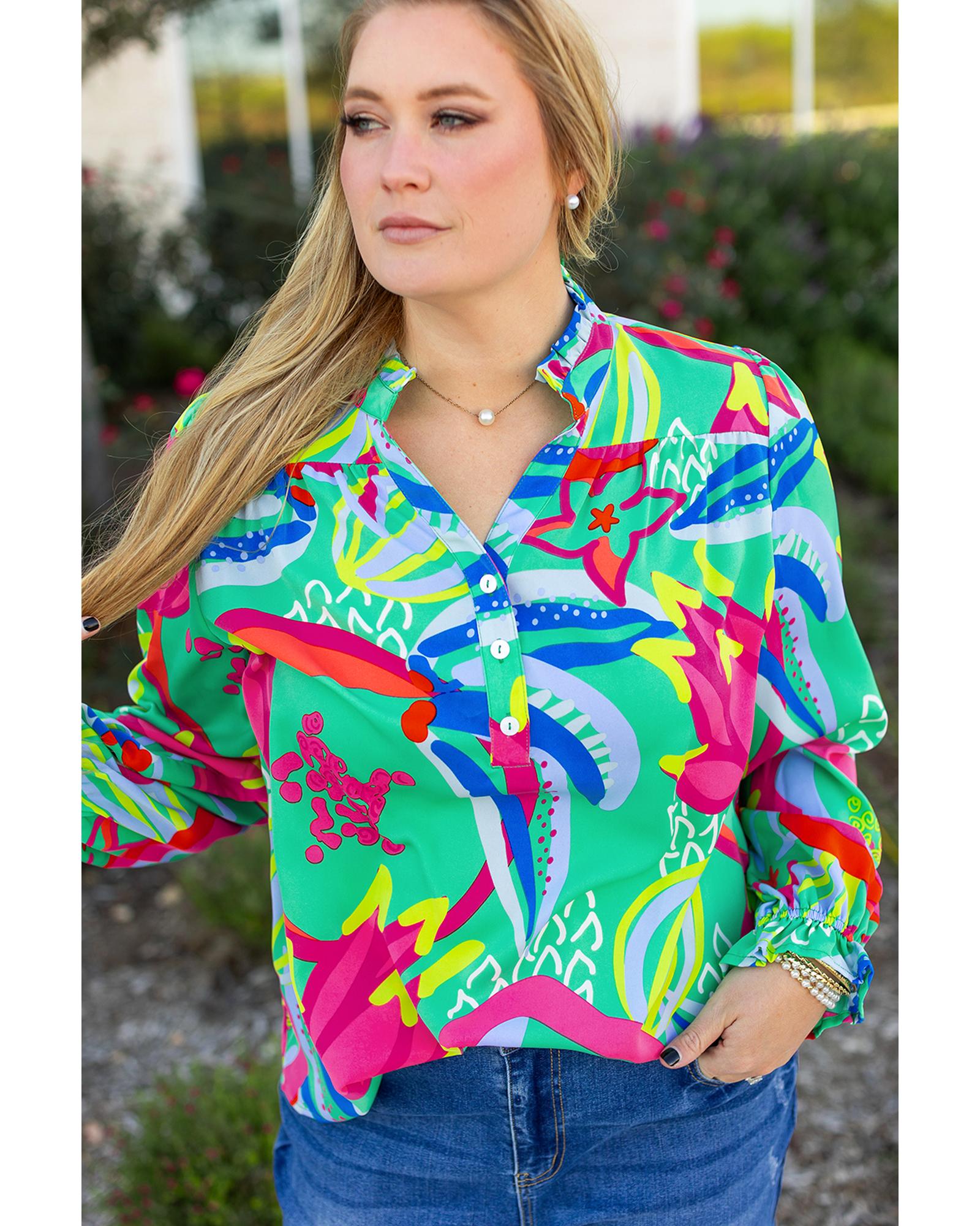Green Abstract Printed Flounce Sleeve V Neck Buttoned Plus Size Blouse – 4X