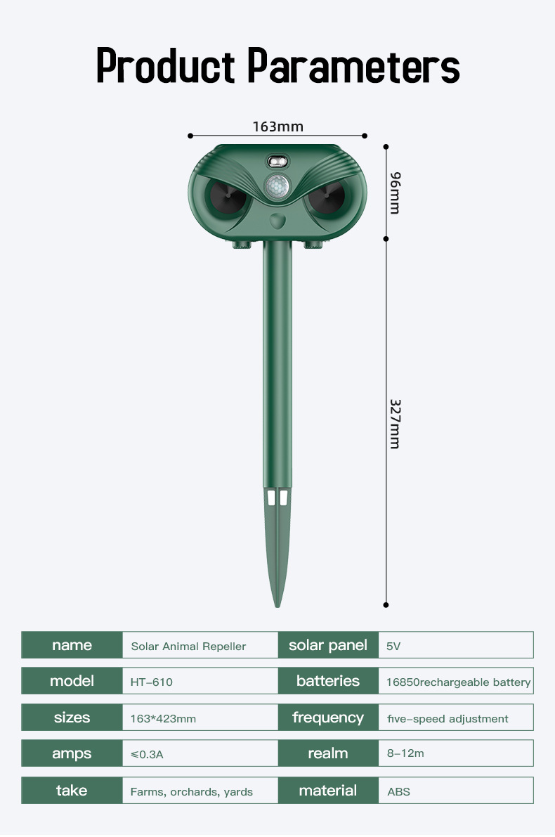 • Multi-Mode Repellent Action: Employs a powerful ultrasonic horn emitting high-frequency sound waves, a bright LED flashing strobe light, and a distinct laser to effectively scare away animals. The five-speed frequency adjustment allows you to target specific pests.