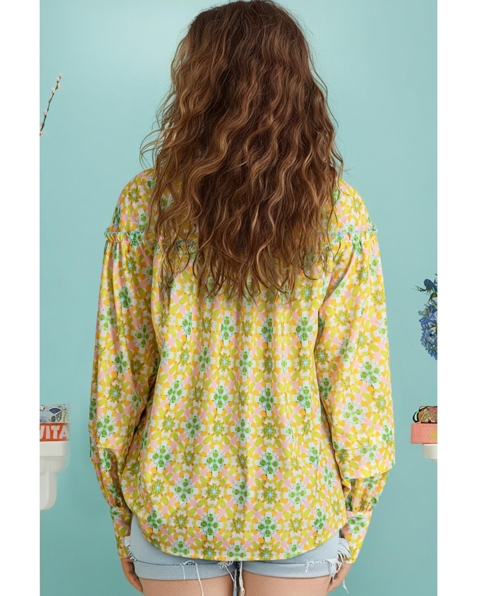 Green Boho Floral Print Frilly Detail Puff Sleeve Shirt – L