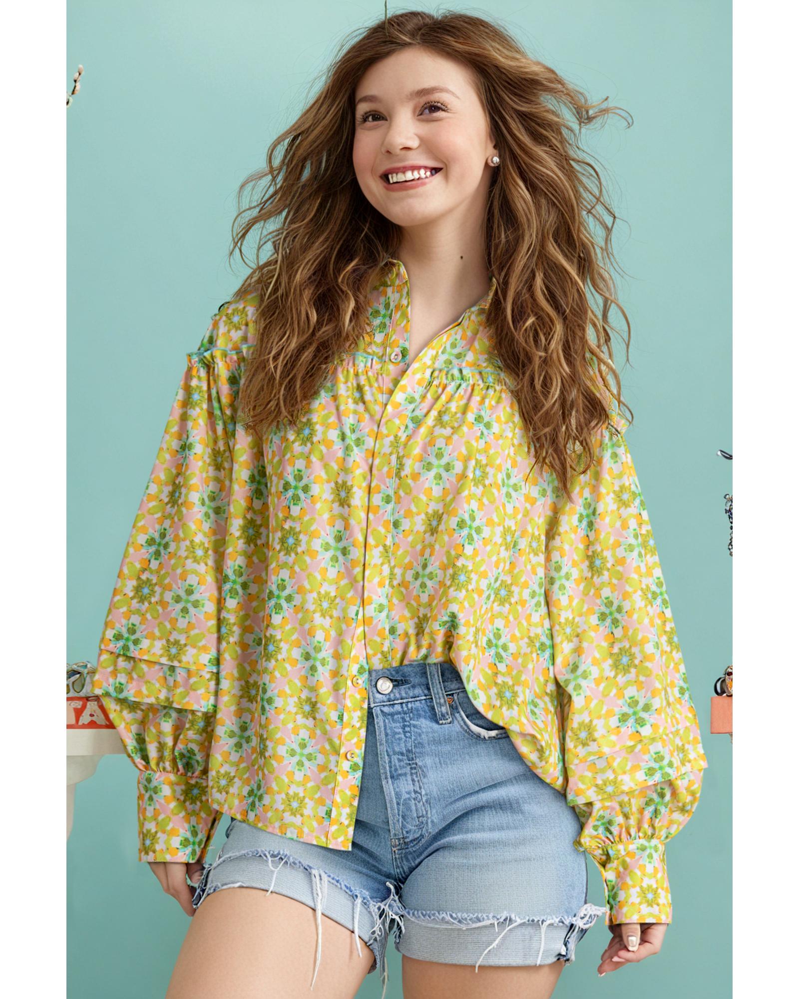 Green Boho Floral Print Frilly Detail Puff Sleeve Shirt – M