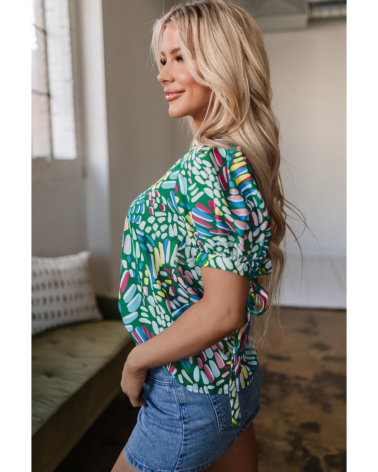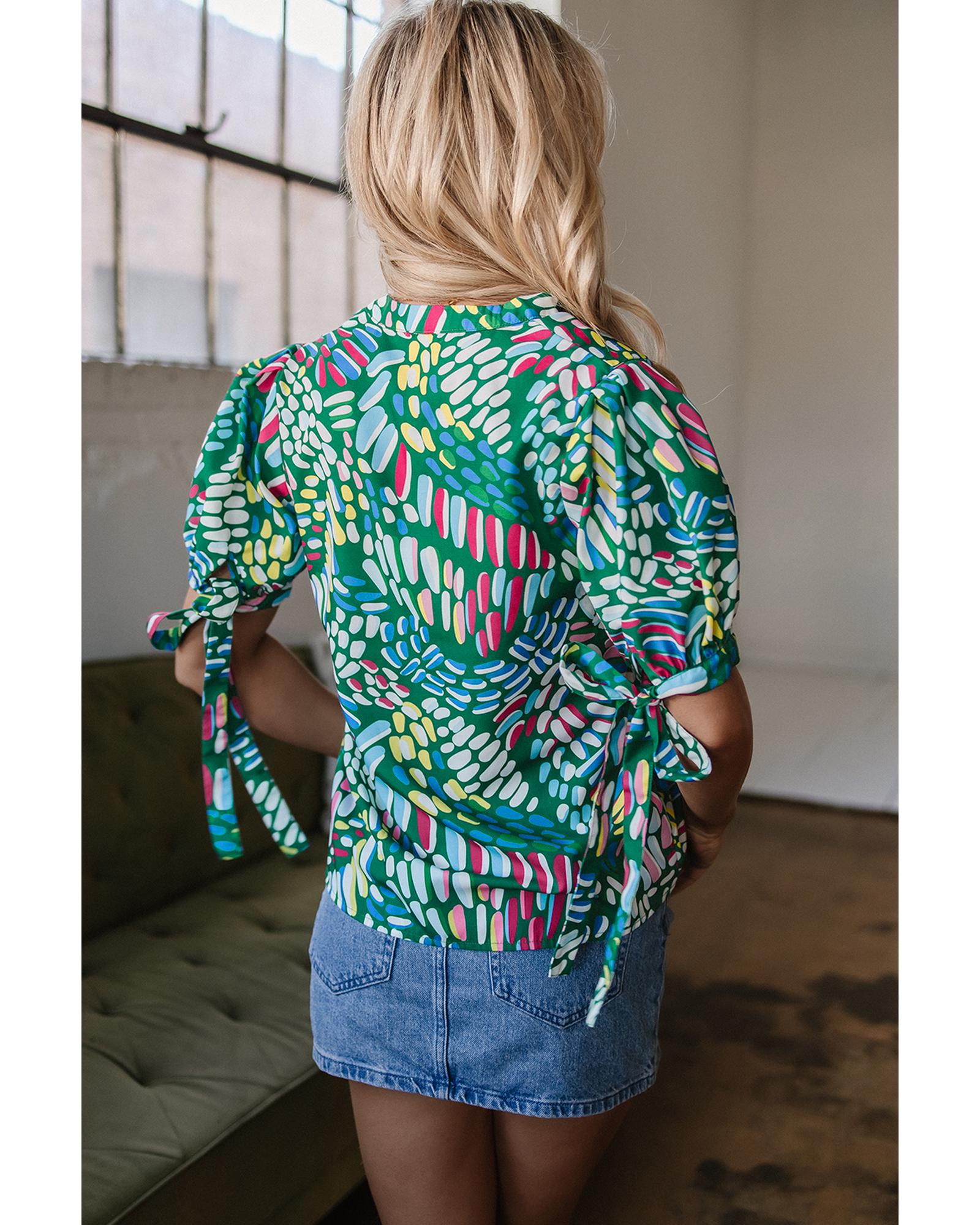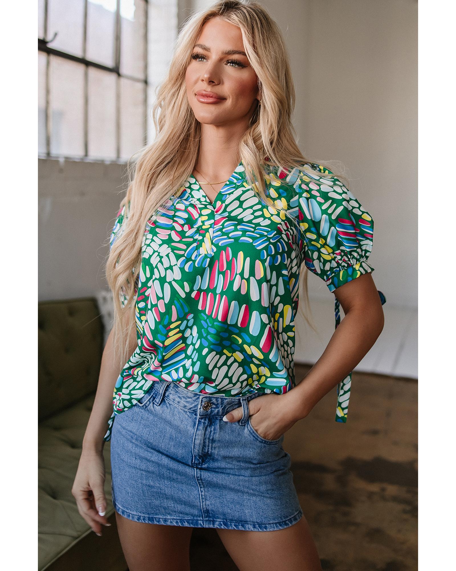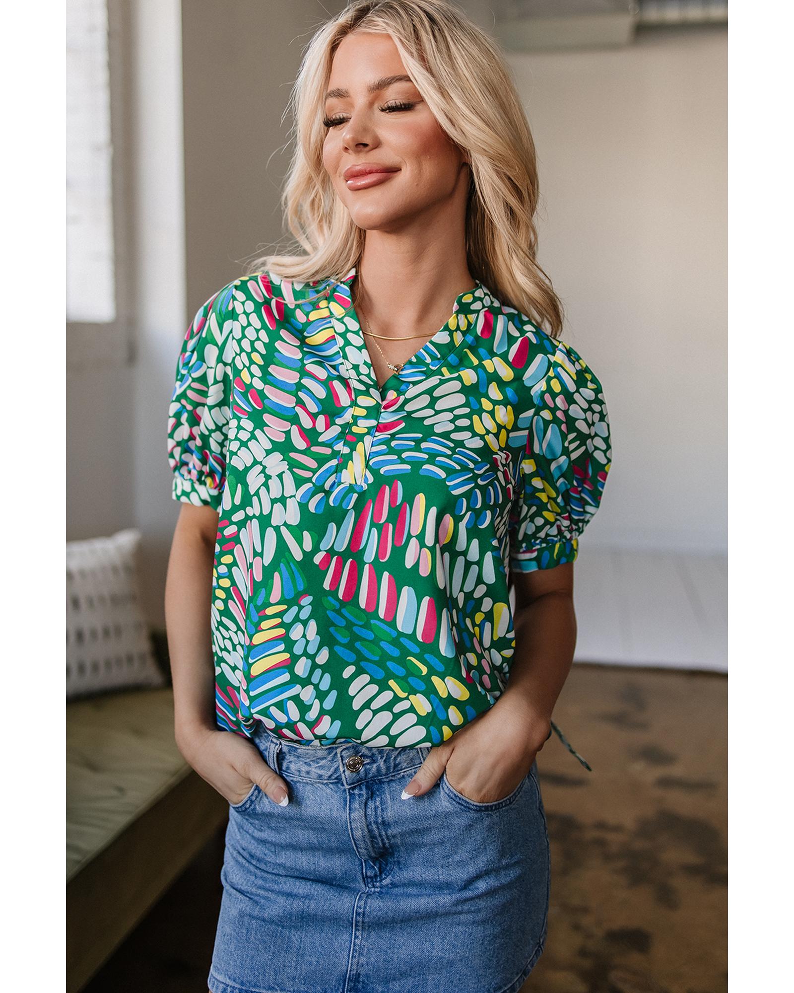 Green Brushwork Geometric Print Puff Sleeve Notched Neck Blouse – L