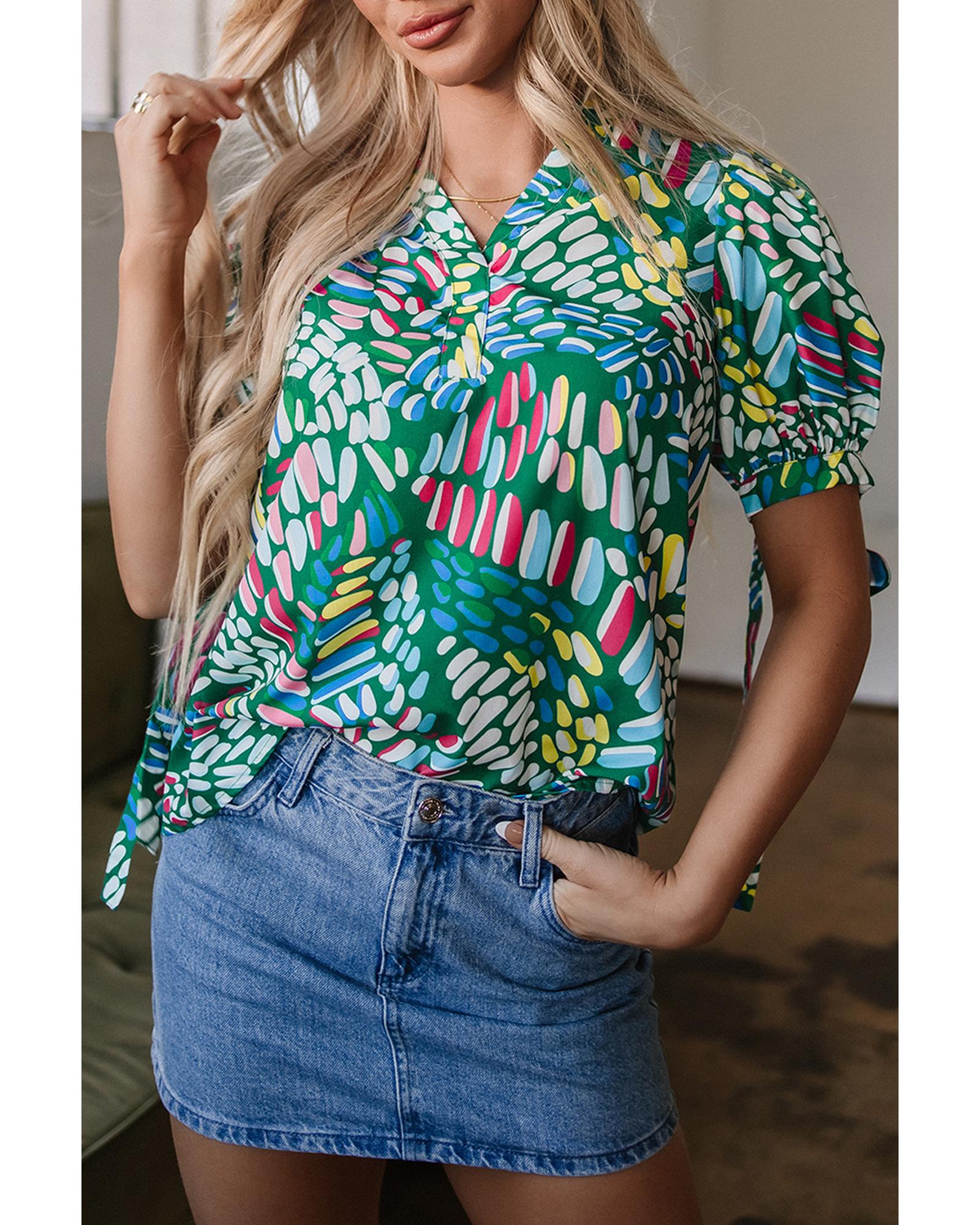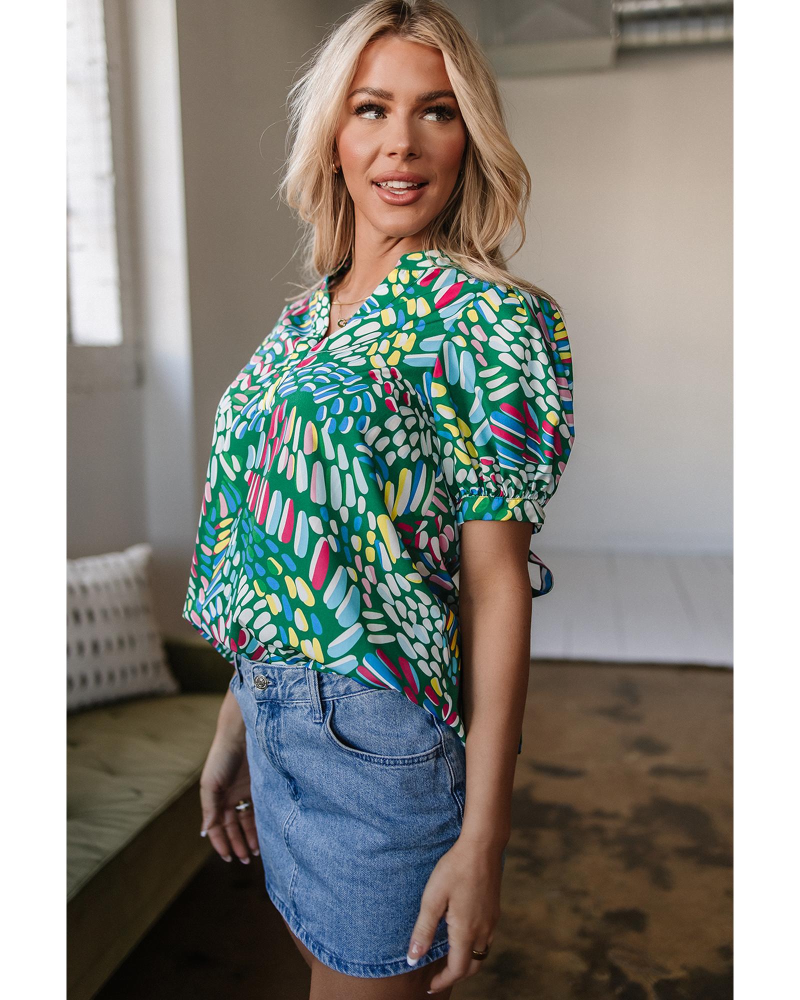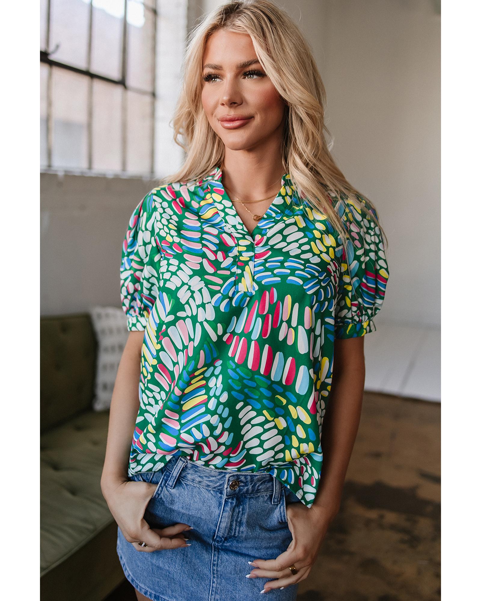 Green Brushwork Geometric Print Puff Sleeve Notched Neck Blouse – M