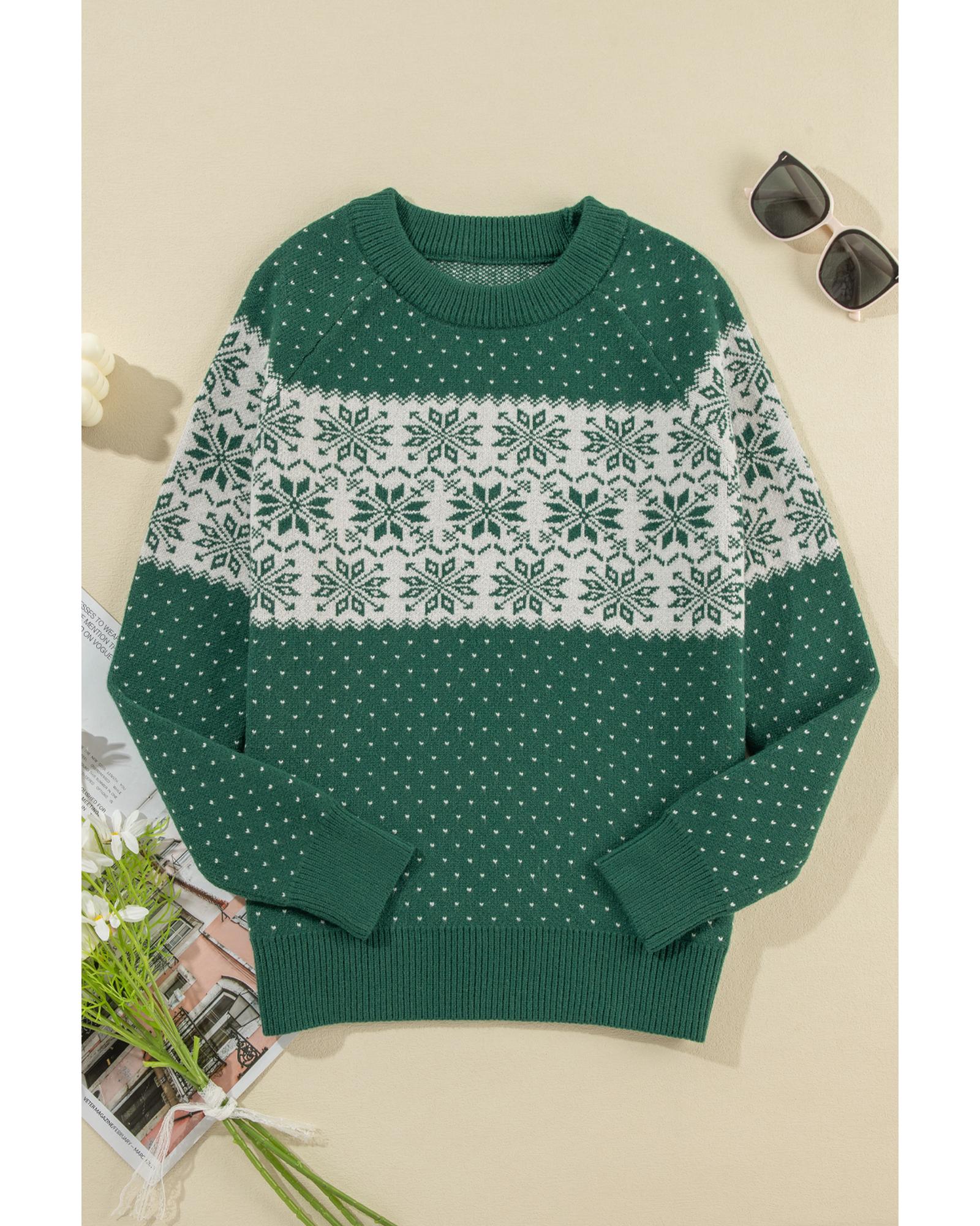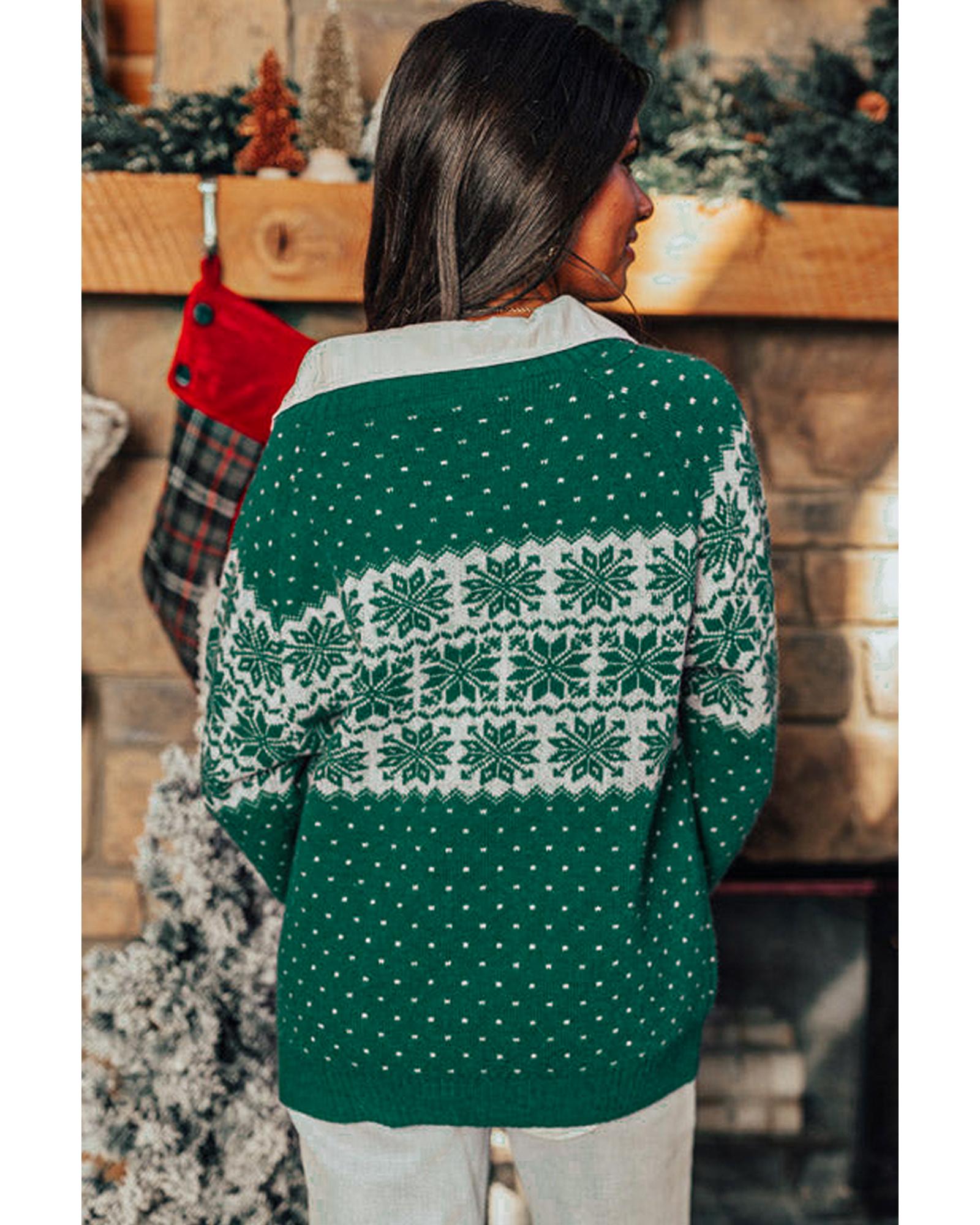 - Green Christmas Snowflake Dotted Print Round Neck Sweater