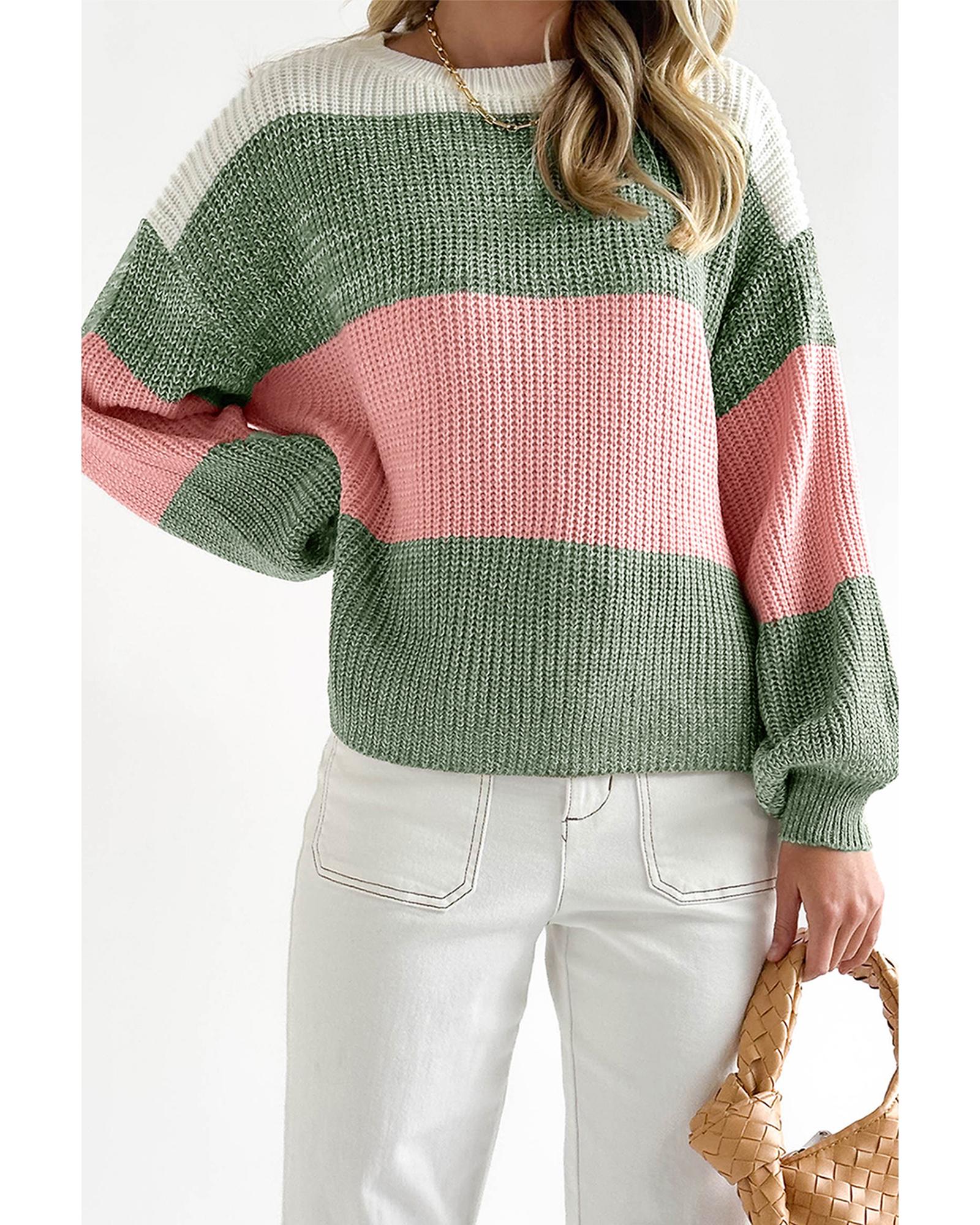 Green Colorblock Drop Shoulder Pullover Loose Sweater – M