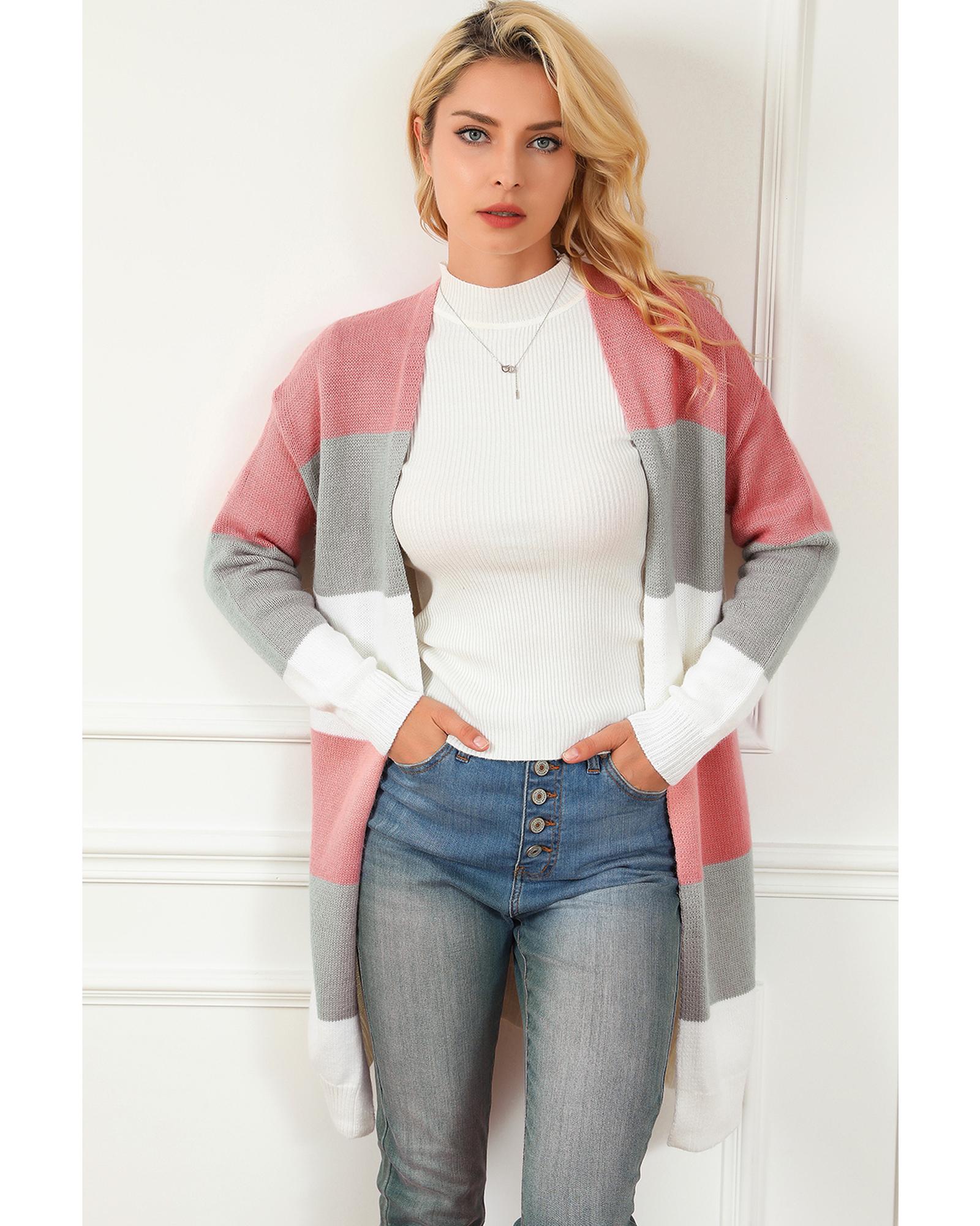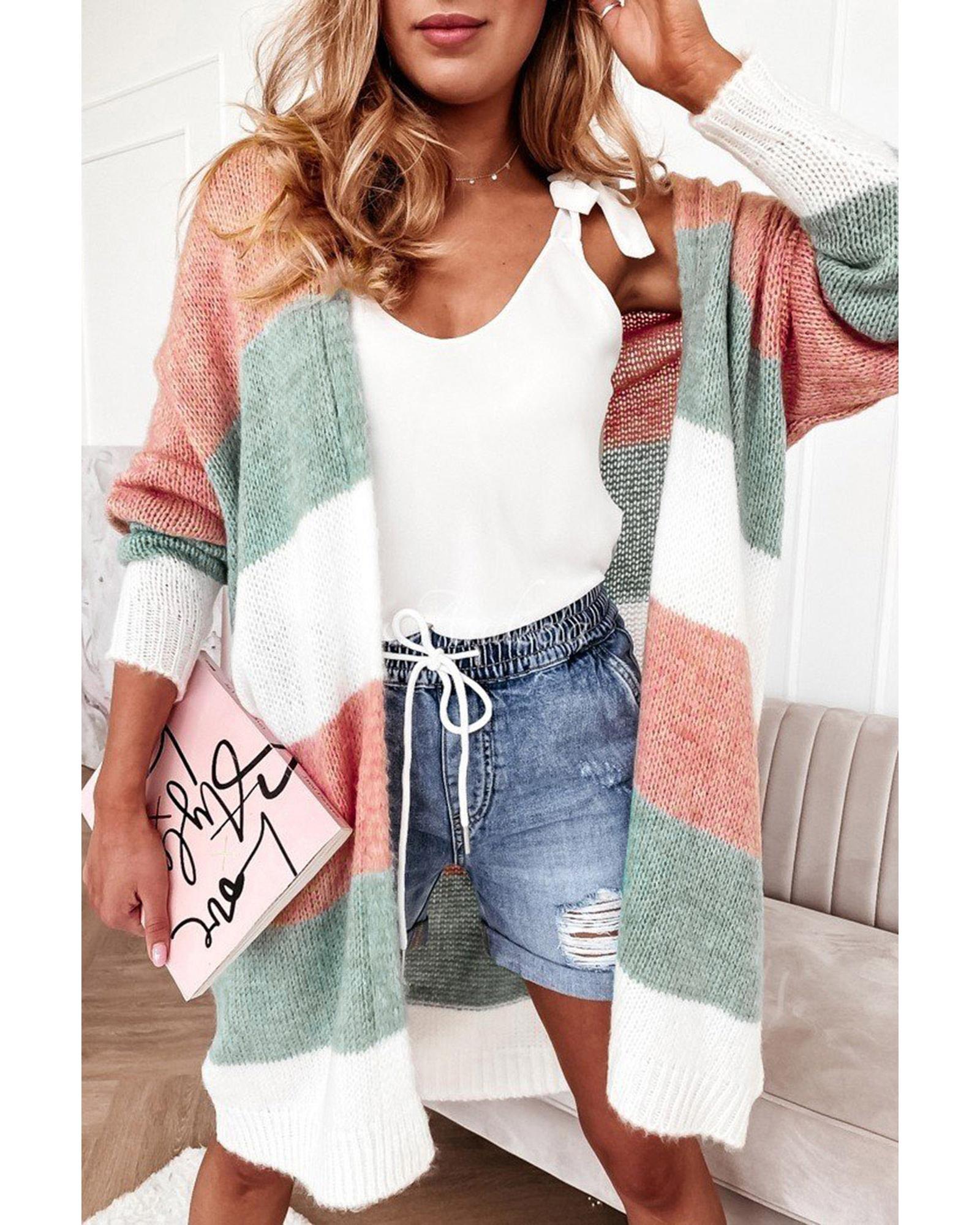 Super cute sweater with colorblock stripes Open - front design with dropped shoulder for a casual look Long relaxed silhouette for easy pairing with fall and winter outfits Made from soft woolen knit for comfort and warmth Available in various sizes