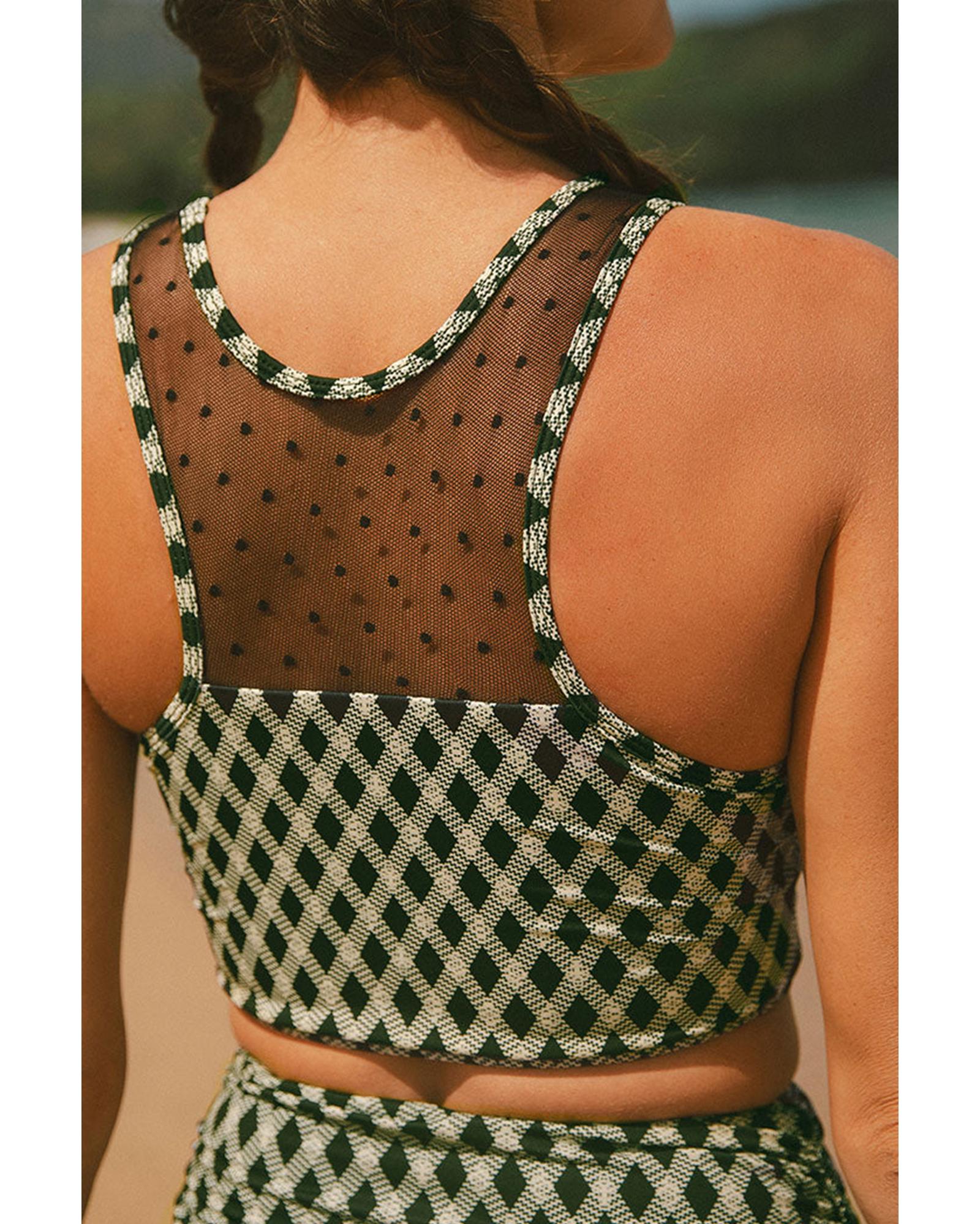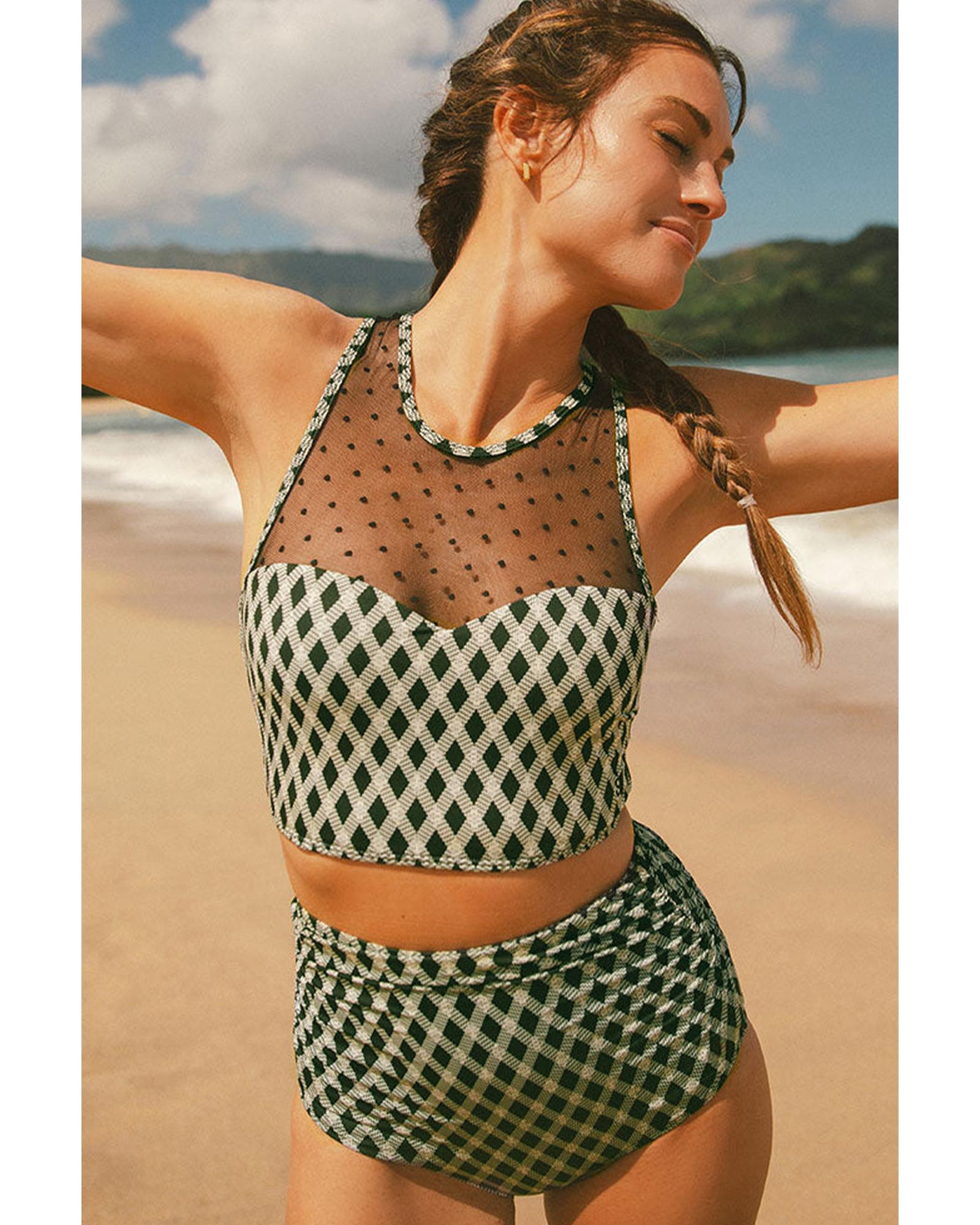 Green Dotted Mesh Plaid Patchwork High Waisted Bikini – XL
