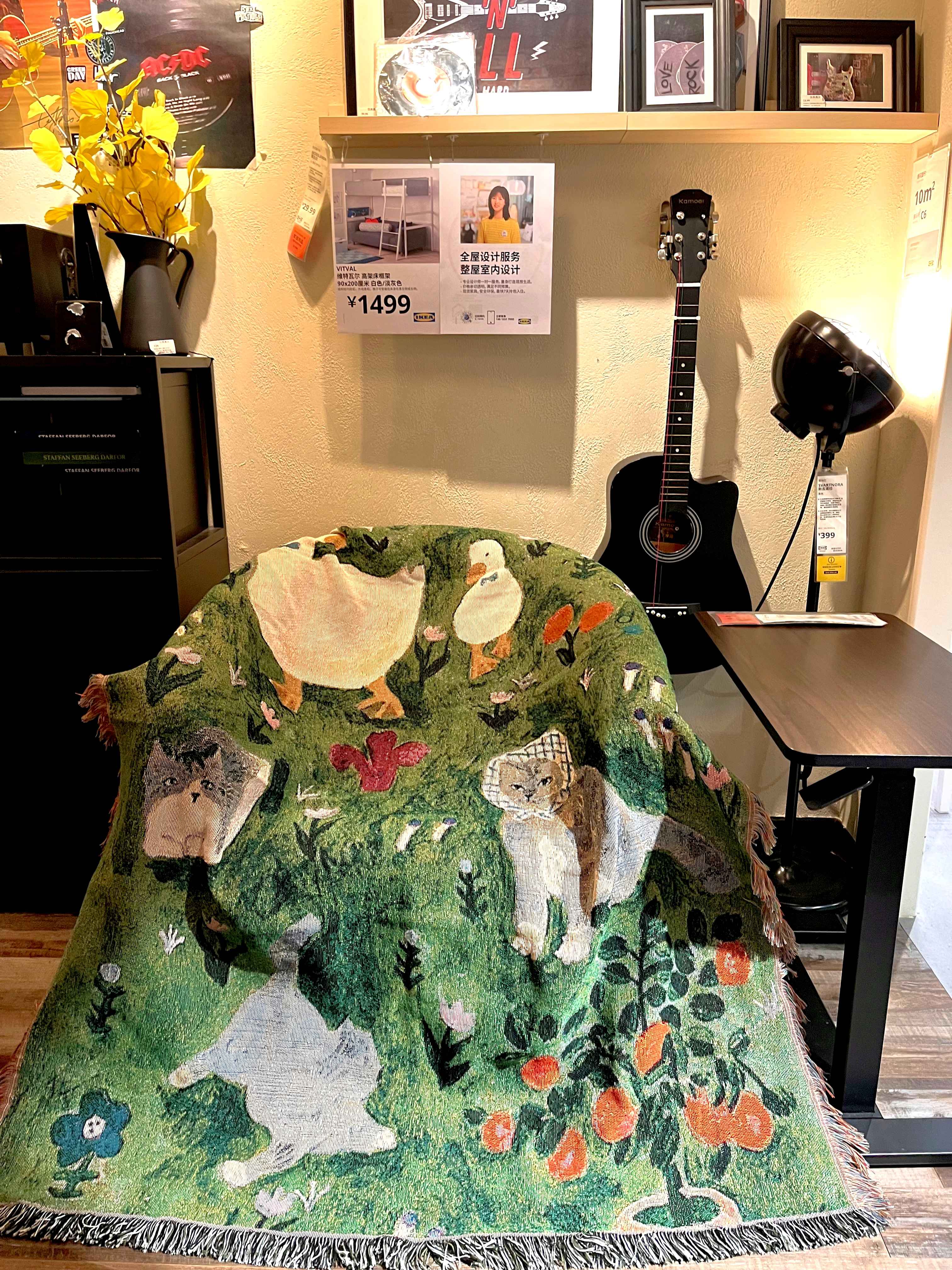 Green Floral Cat Patterned Throw Blanket – Soft and Cozy, 130x160cm with Tassels
