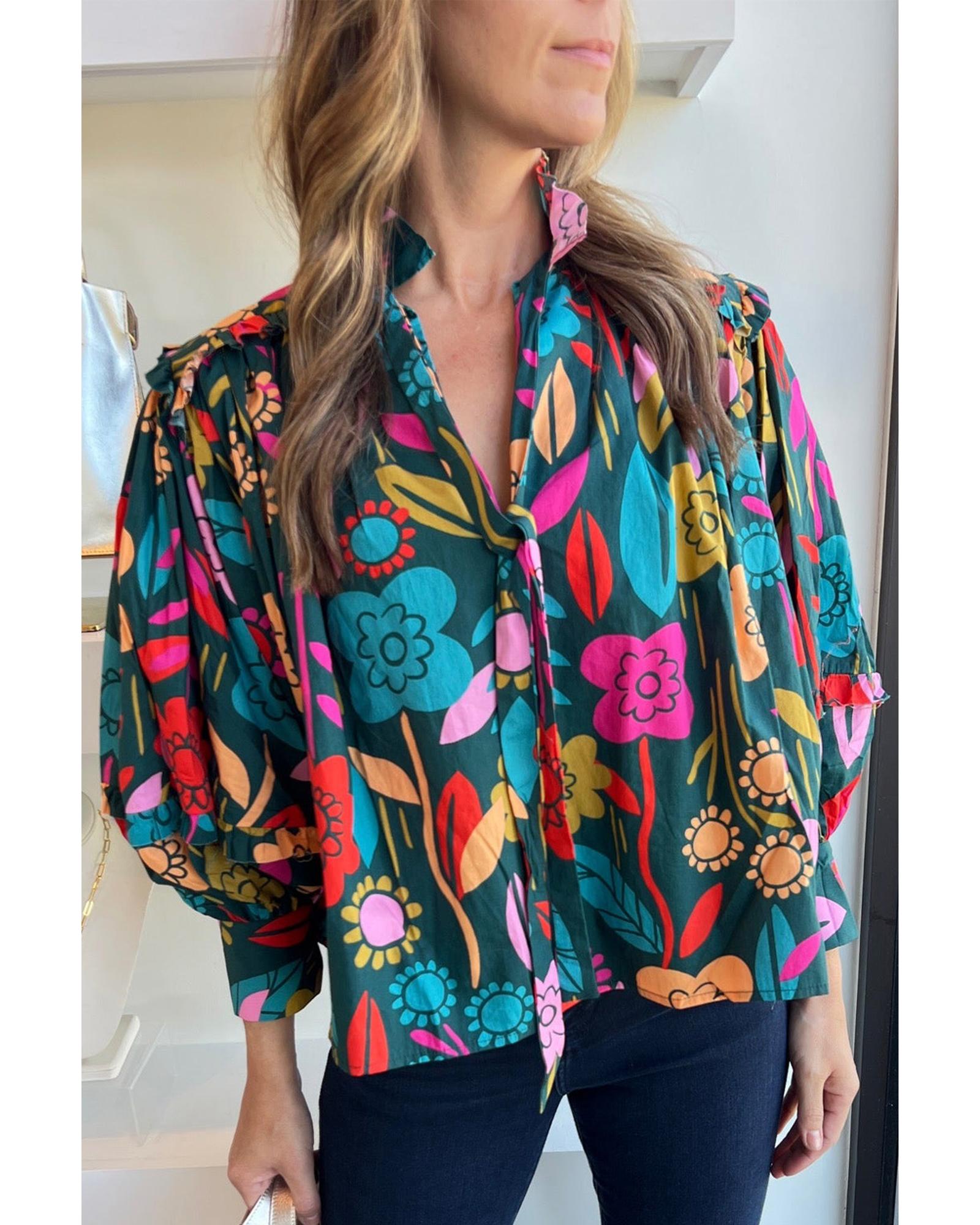Green Floral Knot Split Neck Puff Sleeve Blouse – L