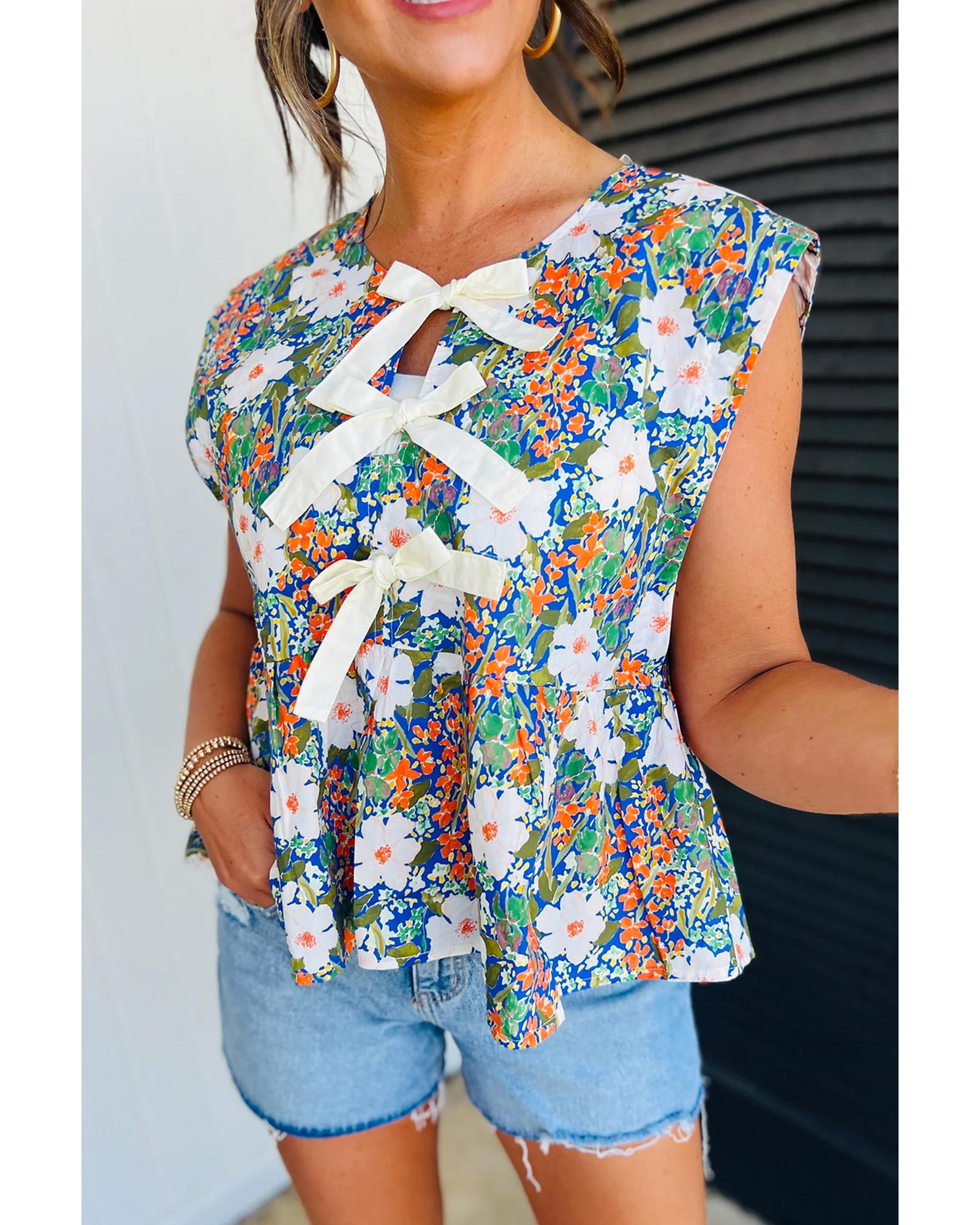 Green Floral Print Bow Applique Slit Sleeveless Peplum Blouse – L