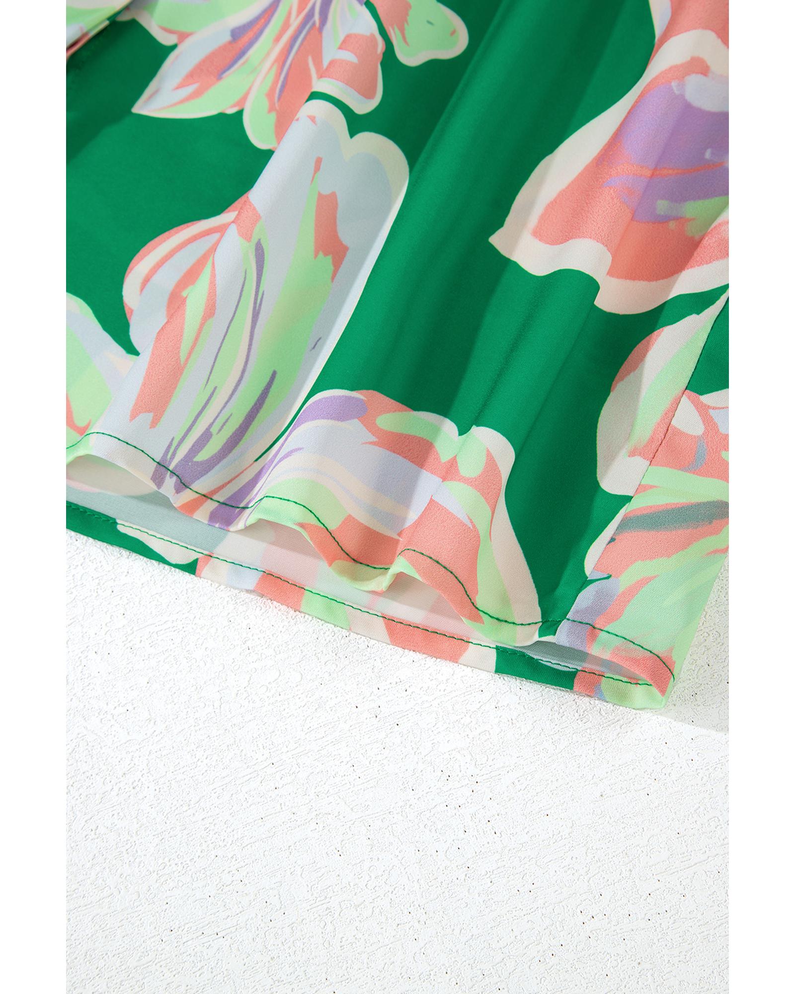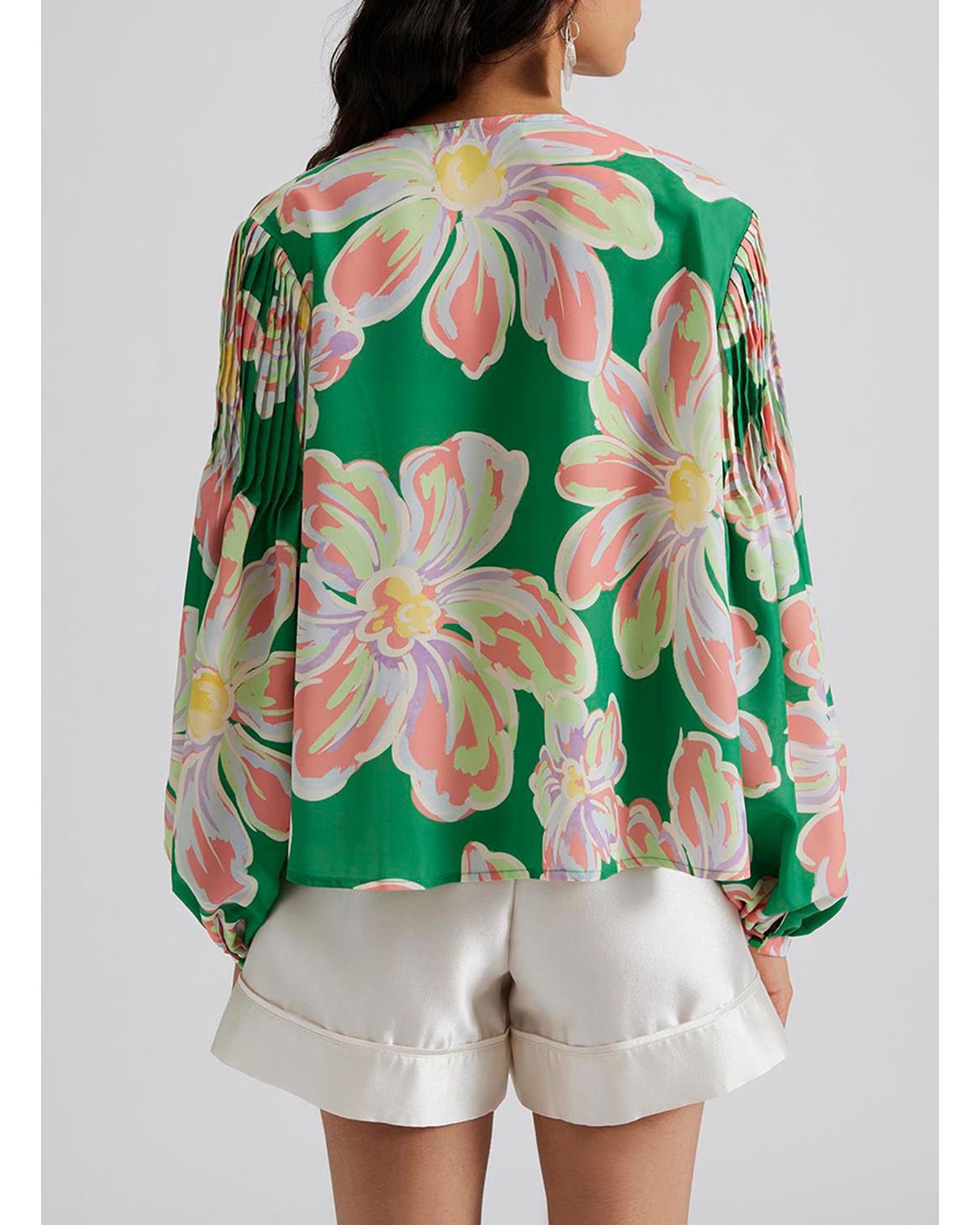 Green Floral Print Button up Pleated Puff Sleeve Loose Shirt – L
