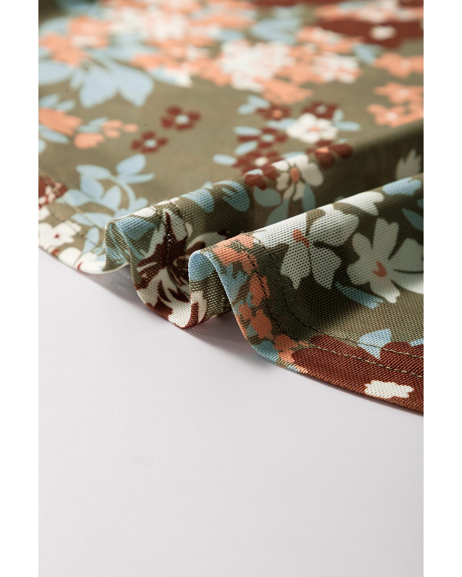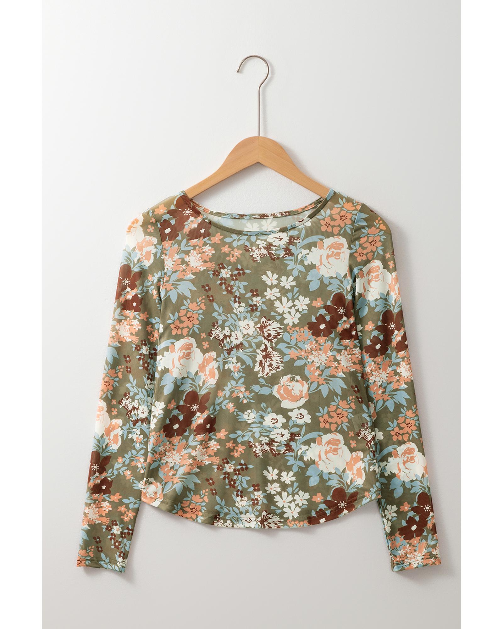 Green Floral Print Mesh Fitted Long Sleeve Top – S