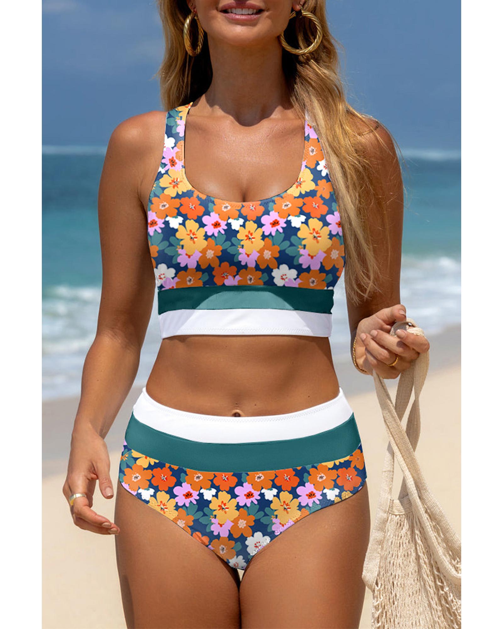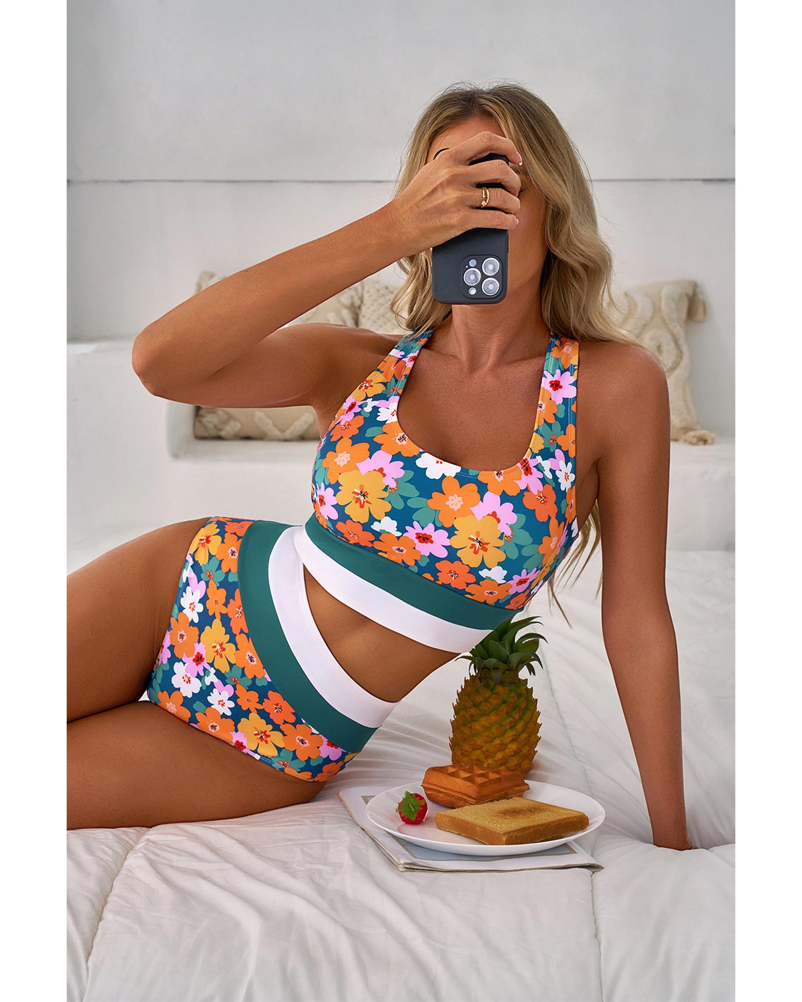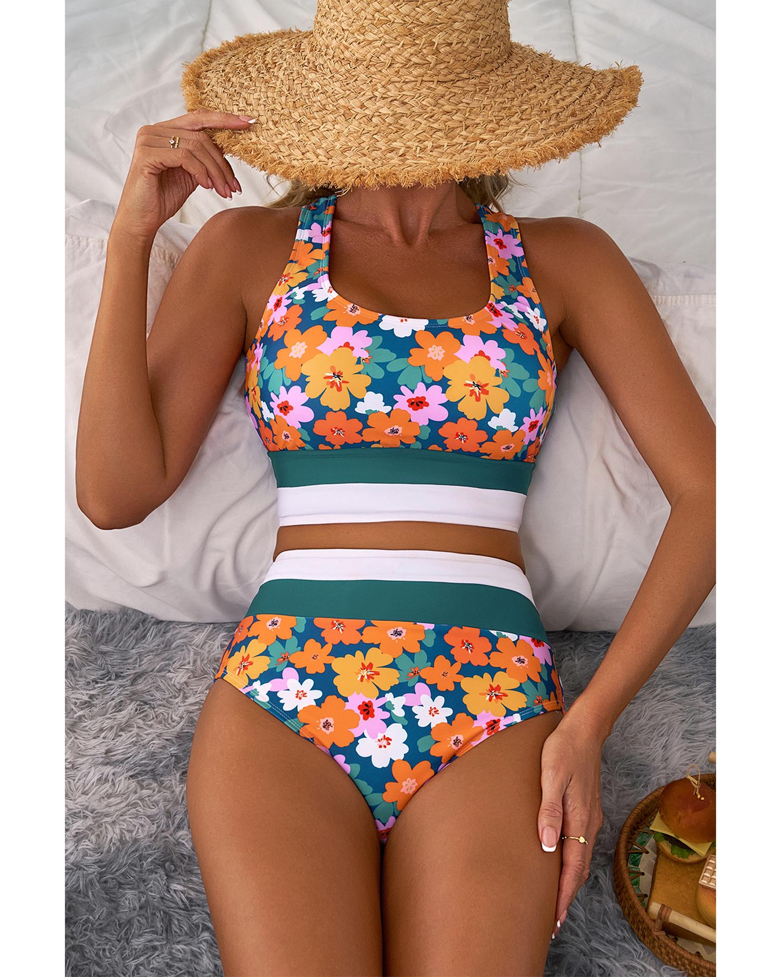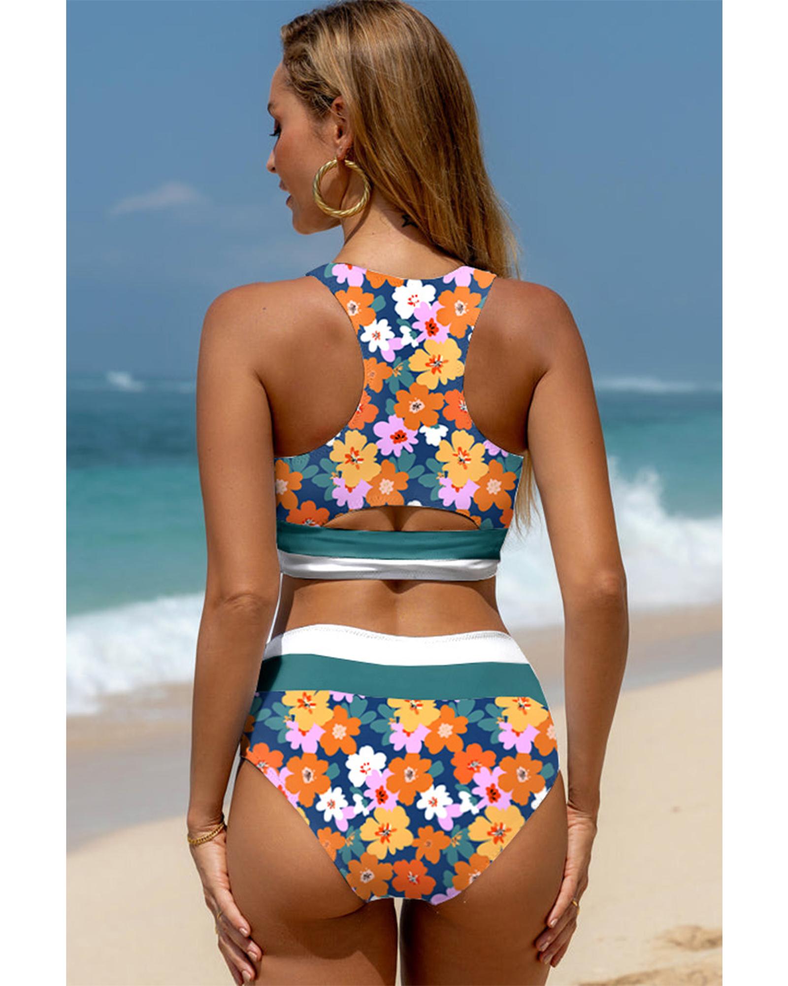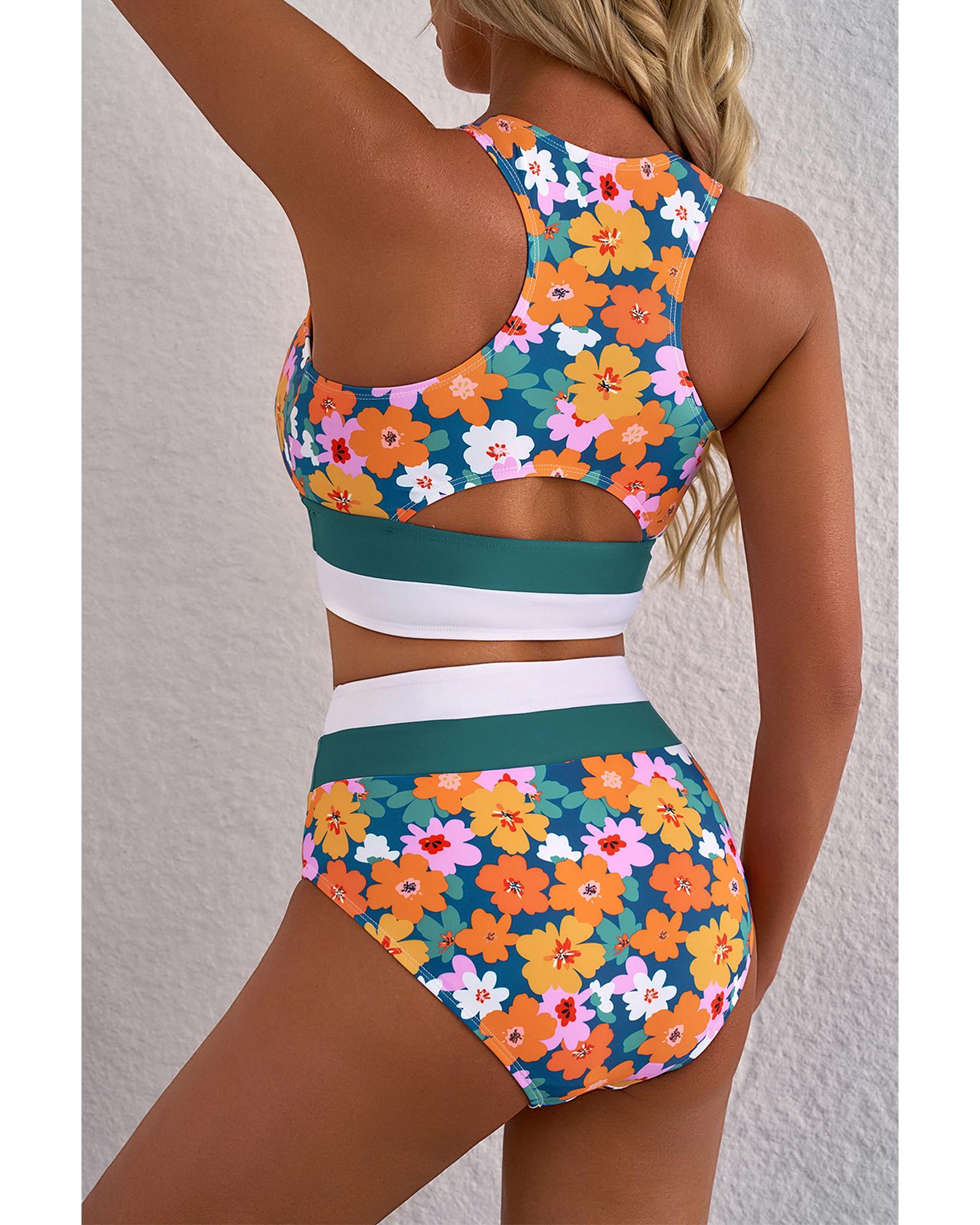 Green Floral Print Racerback Cutout High Waist 2pcs Bikini – M